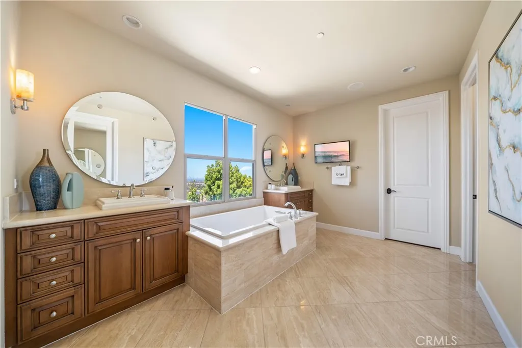 Stunning view home in the prestigious guard-gated community of Lambert Ranch in Irvine, with no Mello-Roos. This spacious 5-bedroom, 5.5 bathroom residence offers an open floor plan with a gourmet western kitchen featuring a large island, plus a separate enclosed chef kitchen for added privacy and cooking convenience. A private downstairs suite opens directly to the serene central courtyard. Upstairs includes a generous loft, laundry room, and four en-suite bedrooms, including a luxurious master suite with retreat/office space, dual walk-in closets, a soaking tub, separate shower, and panoramic views of Irvines iconic orange Great Park Balloonalso visible from the backyard. The home faces south in the rear, bringing in abundant natural sunlight, and offers full privacy with no neighbors behind. Additional highlights include a 3-car garage and extended driveway. Community amenities feature a pool, clubhouse and playground. Top-rated Irvine schools.
