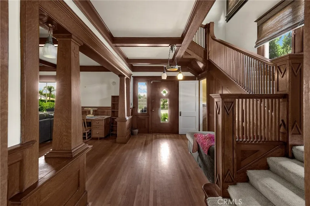 This meticulously preserved late 19th-century craftsman home offers an rare opportunity to own a piece of California history. Set on over 2.5 acres of productive citrus orchards in the San Bernardino foothills, the property delivers both agricultural potential and equestrian amenities with established horse corrals and outbuildings. The 4,495 square foot residence features period-authentic details including original hardwood floors, exposed beam ceilings, mahogany crown molding, and wainscoting throughout. Two fireplaces warm the living spaces, while the expansive kitchen opens into dual dining areas, featuring original built-in cabinetry. 5 bedrooms, 3 bathrooms and several closets provide generous accommodation. Outdoor entertaining spaces include wraparound porches, covered patios, and dual upstairs balconies capturing mountain and sunset views. The property's gated entrance, perimeter fencing, and detached two-car garage with barn storage ensure both privacy and functionality. Ideal for boutique events, agritourism ventures, executive retreats, or multi-generational living, and other potential opportunities. This rare offering combines historic character with modern conveniences including central air and heating, positioned for easy freeway access while maintaining complete rural privacy. The established citrus operation and horse facilities present immediate income potential or lifestyle amenities. A singular opportunity for visionary buyers seeking agricultural heritage property with authentic period architecture.