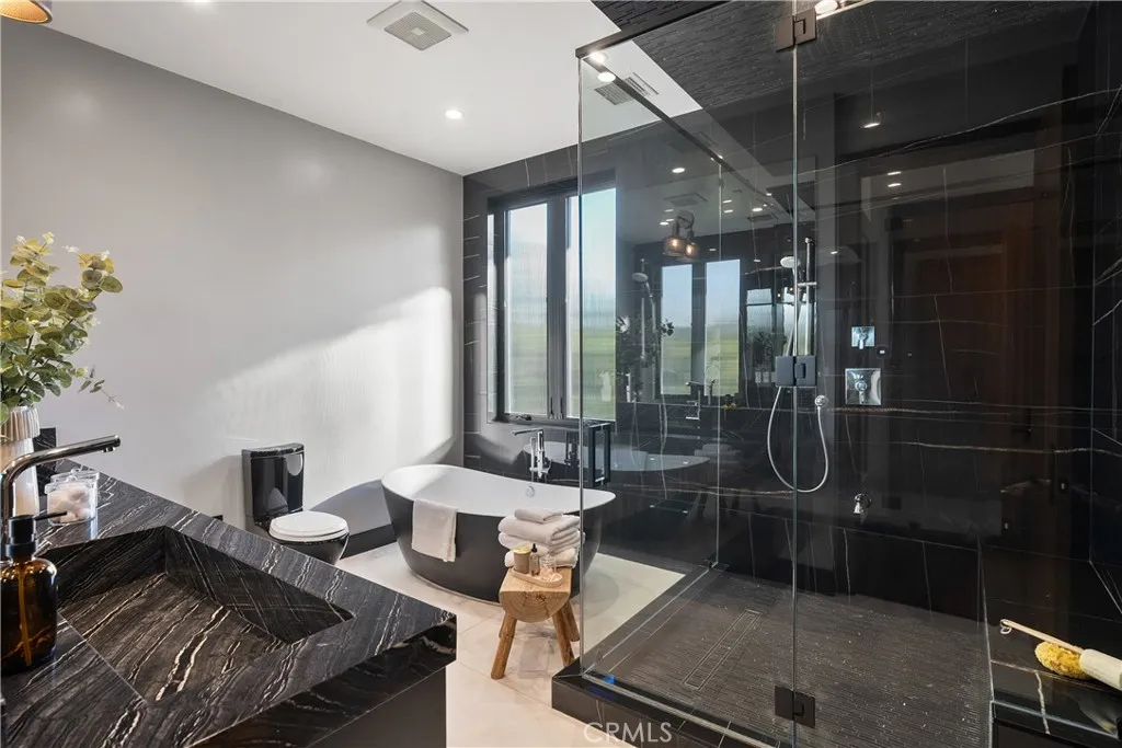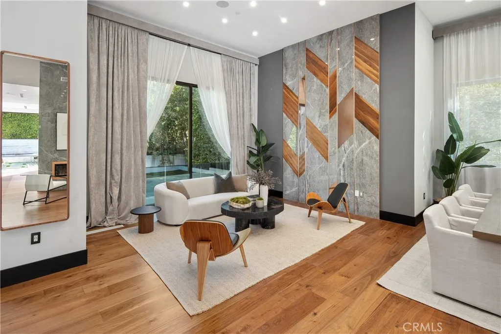 Tucked behind mature privacy hedges on an expansive nearly 18,000 sf lot, this gated, newer construction estate is ideally located south of the Boulevard in prime Tarzana. As you enter through the grand front door, you are greeted to a sprawling open floor plan highlighted by soaring ceilings that carry throughout the home. The sleek, modern chefs kitchen is equipped with top-of-the-line Miele appliances, a walk-in pantry, massive waterfall island and sun-drenched breakfast nook. An oversized sliding glass door in the spacious family room disappears into the wall, allowing for a seamless flow between the indoor and outdoor living spaces. Completing the main level is a formal living and dining room designed for entertaining, ensuite bedroom, laundry room and bonus room. Ascend the elegantly curved staircase or take a ride in your personal elevator to the upper level, where you will find a large recreation room with direct access to the backyard and four generously sized ensuite bedrooms, each with its own walk-in closet and private balcony. The expansive primary suite features a private sitting room, custom walk-in closet and luxe ensuite bathroom, complete with a soaking tub, rainfall shower and double vanity. A floor-to-ceiling wall of glass floods the primary bedroom with natural light and a projection screen allows you to watch tv from bed. Surrounded by mature privacy hedges, the entertainer's backyard is a true oasis highlighted by a 50 ft heated pool/spa with a baja shelf and pool house that offers a kitchenette and bathroom. There's also a large cabana, outdoor kitch
