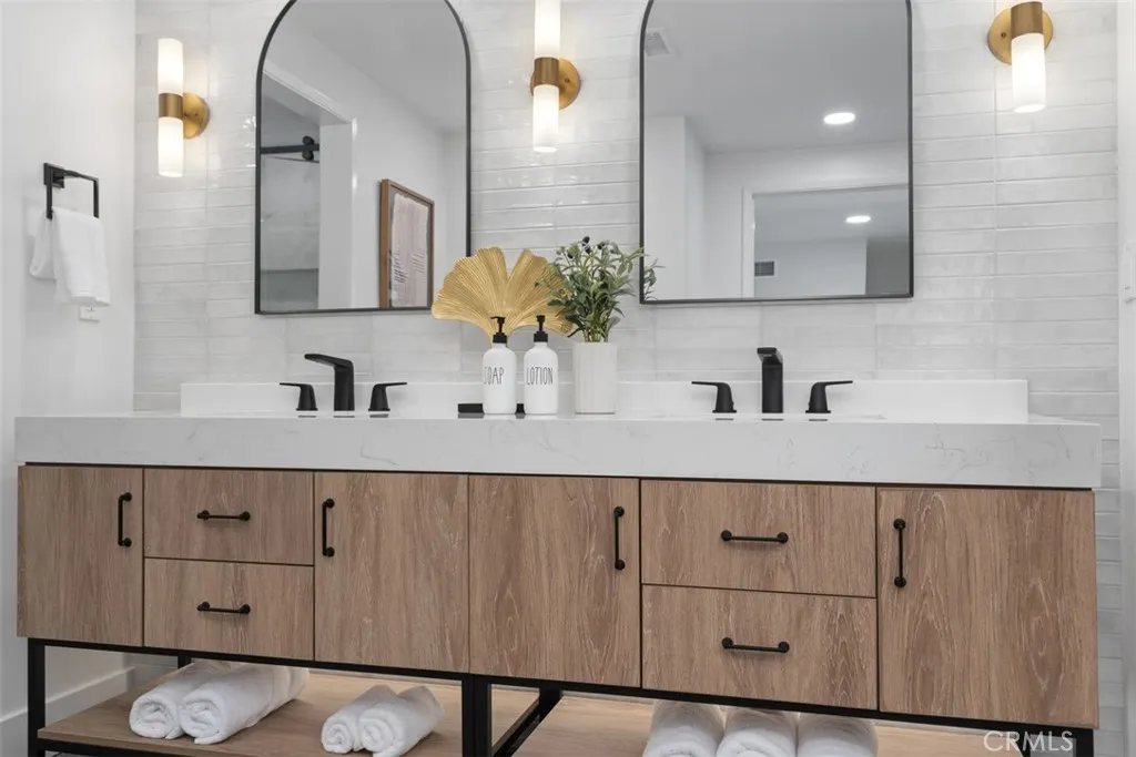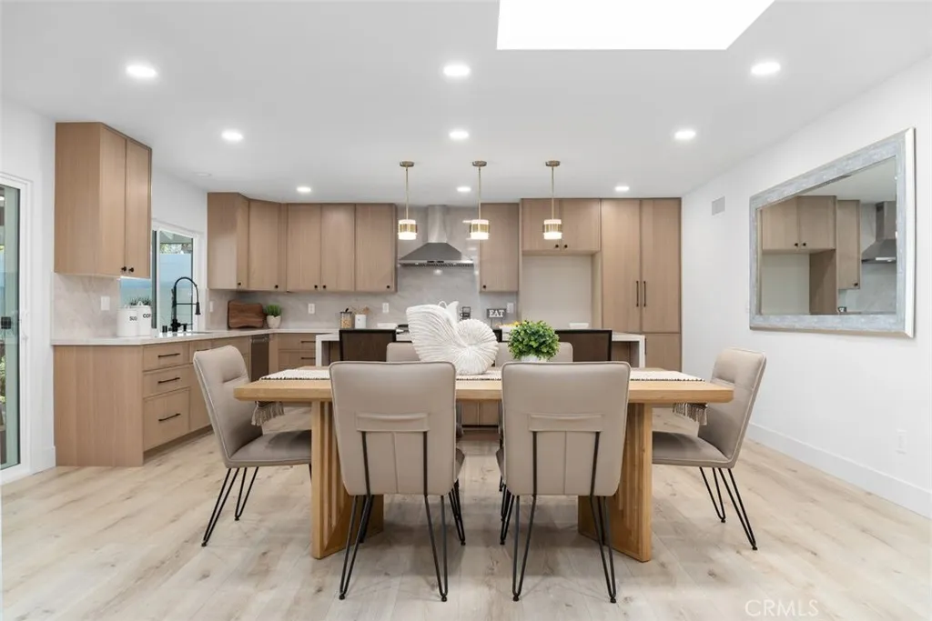 Welcome to 13762 Palace Way a stunning single-story ranch-style pool home, beautifully reimagined with timeless design and high-end finishes. Perfectly positioned on a quiet cul-de-sac and set on an expansive nearly 10,000 SF flat lot, this residence offers the ultimate blend of comfort, sophistication, and California indoor-outdoor living. Step through the walnut double doors into 3,104 SF of thoughtfully designed living space, featuring 5 bedrooms, 2.5 bathrooms, and 2 versatile BONUS ROOMS ideal for a home office, media lounge, gym, or guest suite. An airy open-concept floor plan is bathed in natural light from abundant windows, sliders, and a skylight. At the heart of the home is the showpiece chefs kitchen, showcasing a 36 stainless steel gas range with hood, beverage cooler, oversized center island with seating, Taj Mahal quartzite counters and backsplash, sleek White Oak cabinetry, and designer lighting. The kitchen flows seamlessly into the dining room with its cozy gas fireplace and skylight, and continues into the spacious family room complete with a built-in bar, custom built-ins, floating shelves, quartz tops, an electric fireplace, and recessed TV niche entertaining has never been easier. The primary suite is a true retreat, featuring elegant pendant lighting, mirrored wardrobe, and direct access to a private courtyard. The spa-inspired en-suite bathroom includes a dual-sink oak vanity, dedicated makeup station, walk-in shower with frameless glass door, and an additional mirrored wardrobe. The secondary bathroom is equally refined with a dual vanity, modern