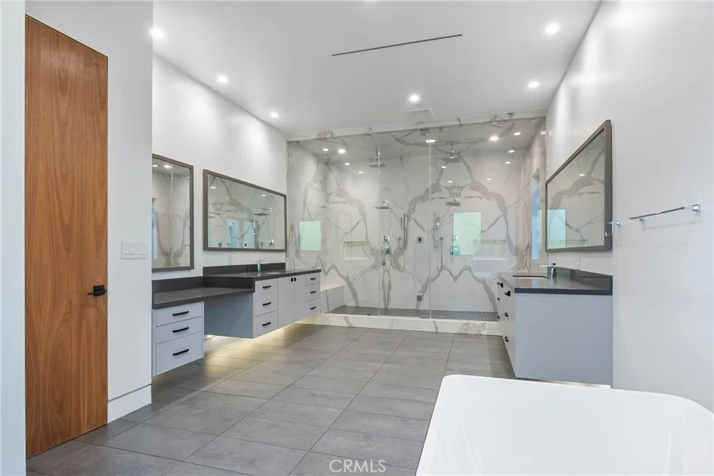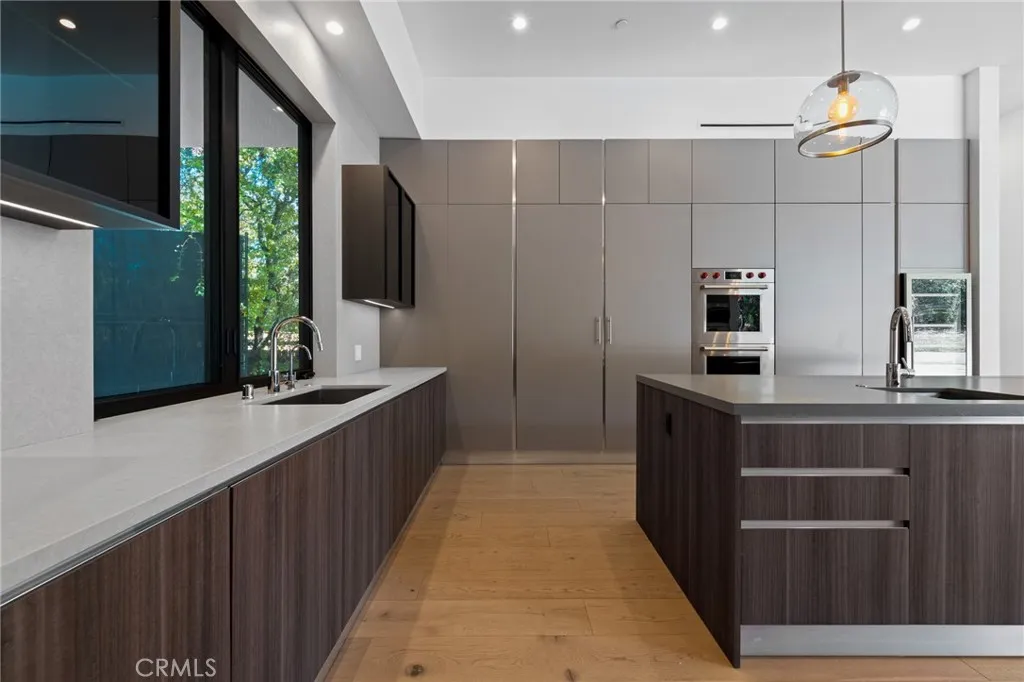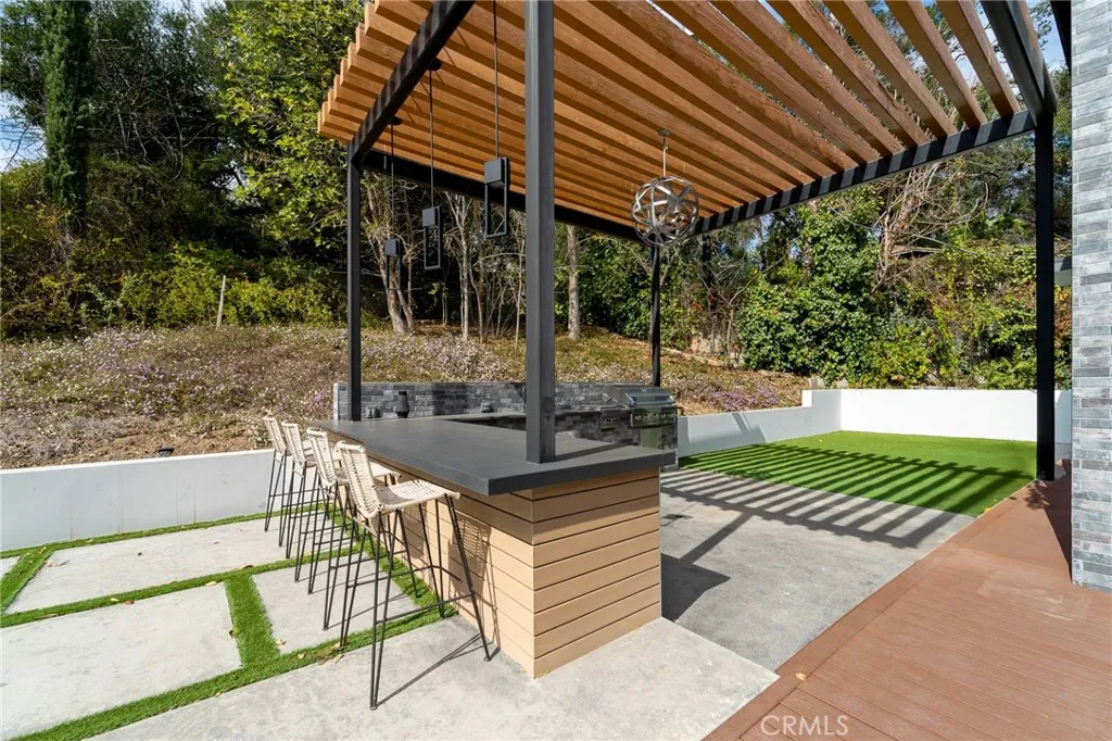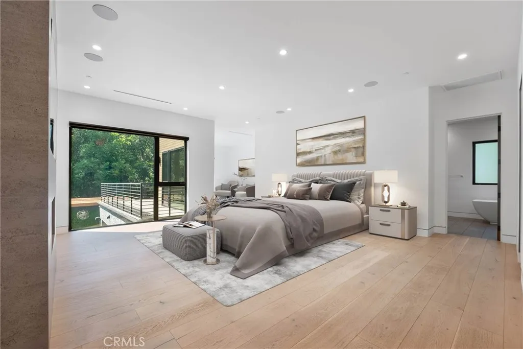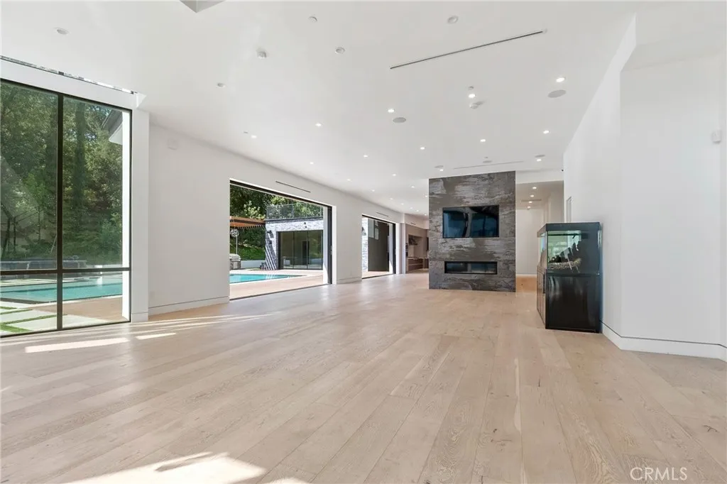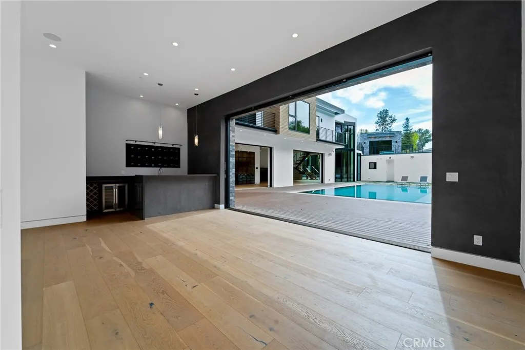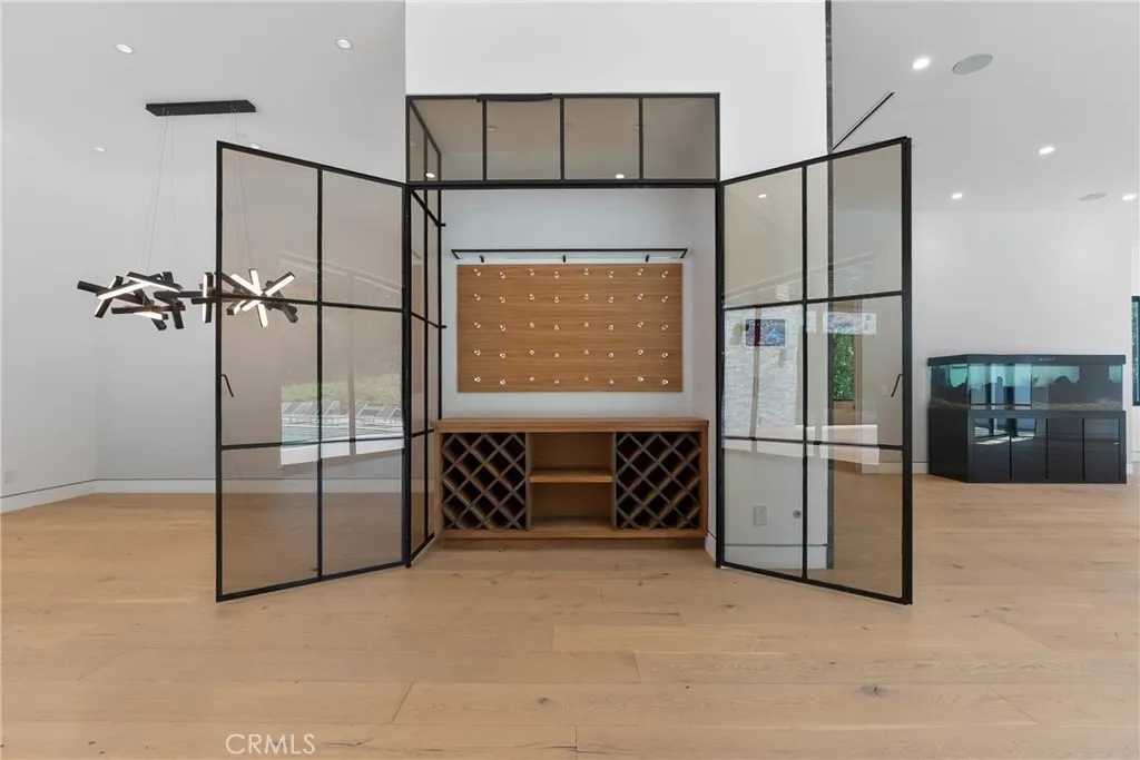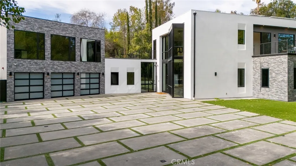 Welcome to your private sanctuary, nestled on a sprawling .68 acre wooded lot. Situated on a flag lot, this estate sits far from the street, ensuring unmatched privacy. A gated entrance and extended driveway lead to a spacious three car garage, with ample additional parking for guests. Step through the breathtaking glass entryway, where soaring 32-foot ceilings, a dramatic chandelier, and striking white oak floating stairs set the stage for this architectural masterpiece. Walls of glass and Fleetwood sliding doors seamlessly blend indoor and outdoor living, flooding the space with natural light and creating an entertainers dream. The open concept layout is anchored by stunning oak floors and a sophisticated Italian designed kitchen, featuring a hidden oversized pantry and a wine fridge, perfectly positioned beside an elegant formal dining area. The lower level boasts two ensuite bedrooms, a private office, and a state-of-the-art theater, ensuring ultimate comfort and convenience. Upstairs, the primary suite is a true retreat, complete with a cozy fireplace, a custom walk-in closet, and a spa inspired bath. A private sitting area and relaxation patio offer a peaceful escape. Above the garage, a versatile space awaits, ideal for a gym, studio, or guest quarters, opening onto a spacious outdoor terrace. Step outside into an entertainers paradise, featuring a zero edge saltwater pool and spa, a sleek cabana, a fully equipped pool house, and a basketball court. Multiple outdoor patios provide the perfect setting for dining and relaxation, while paid-for solar panels add a modern