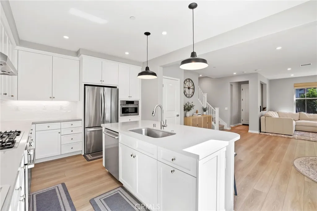 Beautifully upgraded EXTERIOR END-UNIT home Portola Springs. This modern residence offers 3 bedrooms, each with their own ensuite bathroom, loft bonus room for added flex space plus additional powder room downstairs. Spacious home with over 2100 sq. ft. Open concept design, upgraded flooring down stairs, fills this home with an abundance of natural light. Gourmet kitchen with Bosch stainless steel appliances, including 5 burner cook-top, gorgeous quartz countertop and upgraded designer full backsplash. View private park-like patio through expansive sliding glass doors for seamless living and entertaining that inspires gatherings and outdoor relaxation. Upstairs primary suite offers a large walk in closet, freestanding soaking tub, dual vanities, and glass enclosed shower. Dedicated laundry room with extra storage space is located conveniently upstairs. Some added features throughout; motorized remote blinds, luxury laminate wood, designer selected plush carpet, car charger, epoxy garage floors and eco-friendly FULLY PAID OFF solar panels just to name a few. This is a home that offers a lifetime of comfort and enjoyment for both daily living and for home ownership. As part of Portola Springs, residents enjoy resort-style amenities including pools, parks, playgrounds, basketball and tennis courts, scenic walking trails, and more. The community is also served by The Irvine Unified School District (IUSD) which has received multiple awards, and within the Portola Hills area, Portola High School and Portola Springs Elementary have been specifically recognized. Portola High receiv