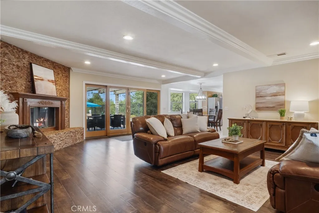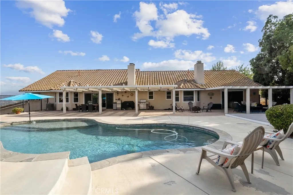 Located in the heart of Temecula Wine Country, this private, gated single-story estate offers 4 bedrooms, 3 bathrooms, and over 3,200 sq. ft. of living space on an expansive 87,991 sq. ft. lotideal for a future ADU. Interior highlights include wood and stone flooring, crown molding, and a stacked-stone fireplace. The gourmet kitchen features granite counters, stainless steel appliances, and a center island that opens to the family room and breakfast nook. A formal living room with balcony access provides an inviting space for entertaining or enjoying morning views of hot air balloons. There are two fireplaces: one in the living room and one in the primary suite, uniquely positioned between the bedroom and bathtubcreating the perfect ambiance while soaking in the tub. The primary suite also offers a bath, walk-in closet, and patio access. Secondary bedrooms are generously sized, with two sharing a Jack-and-Jill bathroom. A versatile bonus room provides the ideal space for a home office, gym, or playroom. The backyard is designed for resort-style living with a sparkling pool, full-length covered patio, and elevated sun deck with panoramic views. The property also includes fruit trees, RV parking, western-style outbuildings, and fully paid-for solar panels for energy efficiency and cost savings. All just minutes from award-winning wineries, Lake Skinner, shopping, and top-rated schools.