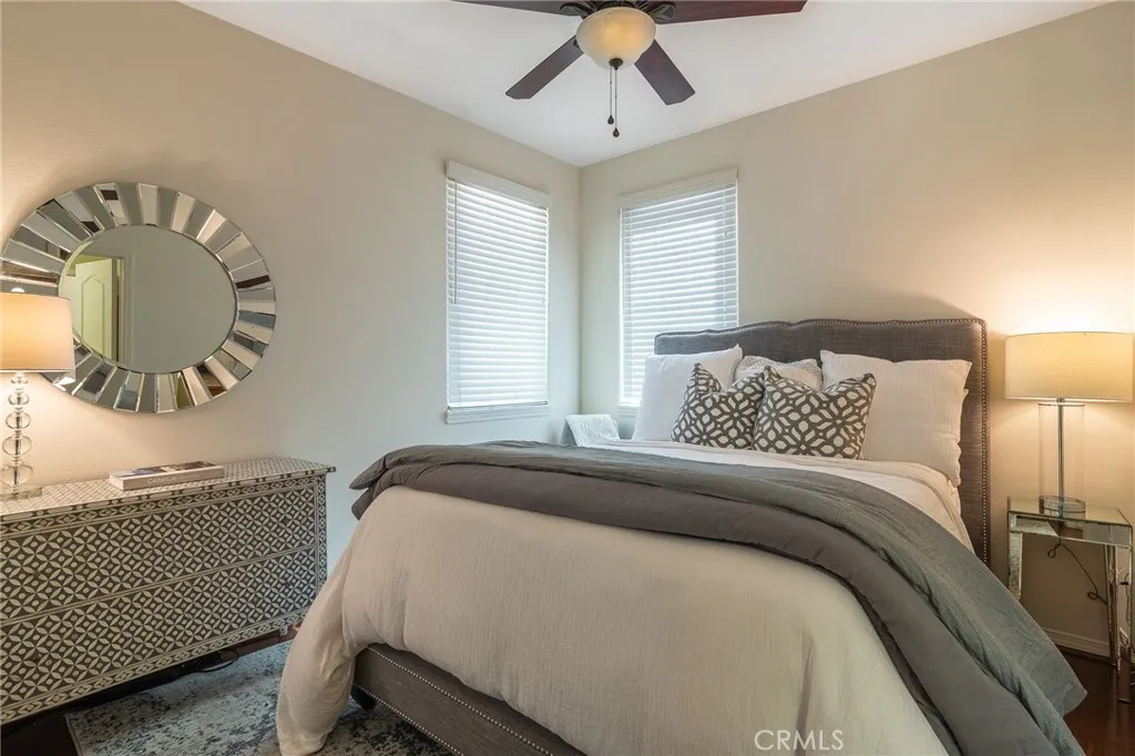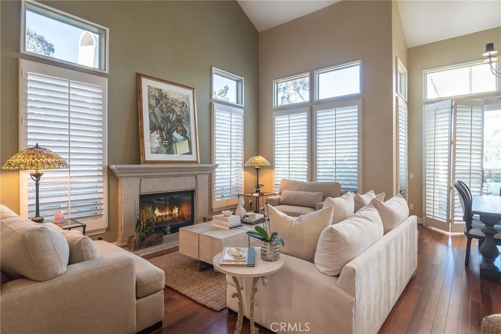 You won't want to miss this beautifully upgraded executive home with gorgeous views! Located in the gated community of Siena, no expense was spared and attention to detail is obvious throughout this beauty. Rich hardwood floors and fossil stone flow throughout most of the living areas. The kitchen features gorgeous custom designer cabinetry, granite counters, and top-of-the-line appliances. A breakfast nook looks out to a private courtyard with fountain. Huge windows and cathedral ceilings flood the home in natural light. The large primary suite features a fireplace and French slider that leads out to a balcony. The primary bath offers a jetted spa tub, beautiful marble shower and double sink vanity. Two additional spacious bedrooms share a jack-n-jill bath, also remodeled. Other features include plantation shutters throughout, ceiling fans in all rooms and updated fixtures throughout. A spacious backyard is a tropical garden with mature but well manicured foliage (including a productive Meyer lemon tree), artificial turf and stone patio, a bubbling fountain and panoramic views of the surrounding hills. Enjoy numerous amenities including the Siena pool and spa as well as the Marina Hills recreation center with pool, tennis, pickle ball, bocce ball, clubhouse and play area.