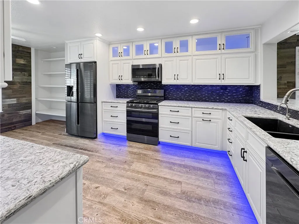 Step into your own private resort with this entertainers dream home, where every detail has been designed to elevate your lifestyle. Imagine sun-drenched afternoons spent around the shimmering Pebble Tec saltwater pool and spa, the soothing sound of a rock waterfall in the background, cool decking under your feet, and friends gathered around the built-in BBQ and bar while an outdoor gas fireplace flickers into the evening. Privacy and beauty surround you with custom stamped and etched concrete, a secure storage area for pool equipment, and a welcoming front courtyard that sets the tone the moment you arrive. The massive driveway provides endless vehicle storage possibilities, including room to park your RV or boat. Inside, light pours through tinted windows onto plush new carpet and luxurious laminate wood floors. The remodeled gourmet kitchen is as stunning as it is functional, with sleek European cabinetry featuring soft-close drawers and pull-outs, LED lighting above and below, granite countertops, a full custom backsplash, and upgraded black stainless Samsung appliancesincluding double oven, refrigerator, microwave, dishwasher, and a gleaming stainless farmhouse sink. In the heart of the home, the family room beckons with crown molding, shiplap wall, wood shutters, built-in desk, cozy fireplace, and an included 75-inch TV. Throw open the French doors and the indoors flow seamlessly to the expansive patio and pool beyond. Solar panels for both the home and pool, a whole-house fan, newer A/C condenser, and tinted windows keep comfort high and costs low. A massive primary