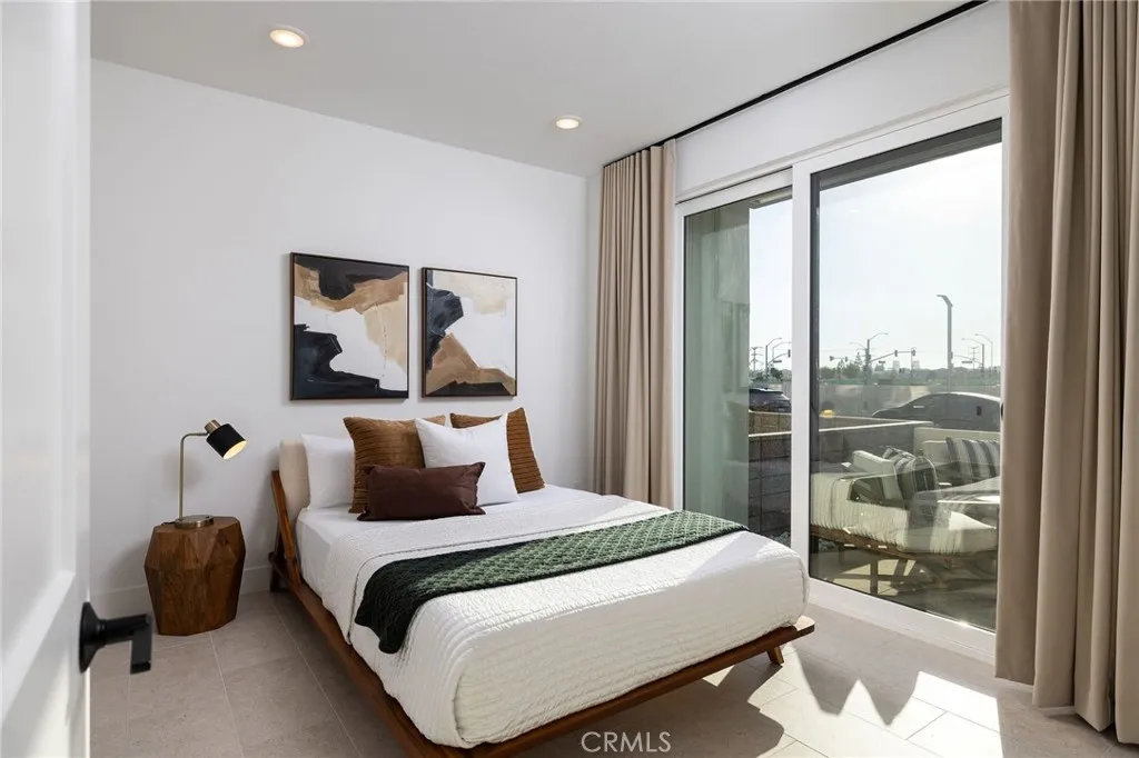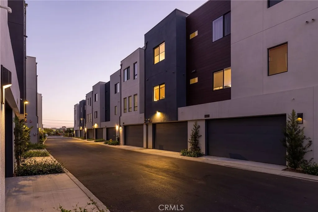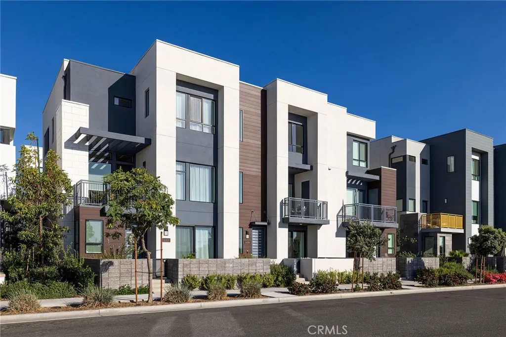 This newly built luxury townhome in The Landing at Tustin Legacy offers the perfect blend of modern sophistication and everyday convenience in one of Orange County's most desirable new communities. Completed in 2023, this light-filled contemporary home welcomes you with an open-concept layout featuring soaring 12-foot ceilings, imported Italian stone floors, and sleek matte black designer finishes that create an atmosphere of understated elegance. Enter the 3-story plan through the thoughtfully designed lower level that includes an ensuite bedroom (or optional office or fitness room) and direct access to the two-car garage. This space also opens directly to a sunny patio, bringing the outdoors in and making for a welcoming curb appeal. Large windows fill the second-level great room with natural light, creating an ideal environment for both entertaining guests and everyday relaxation. The living room flows seamlessly to a private balcony, extending your living area outdoors. The luxe chef's kitchen is finished with full-height maple cabinetry, a complete stainless steel JennAir/KitchenAid appliance suite, and a striking quartz island ready for casual bites and conversation. Upstairs, two generously sized bedrooms each provide ample accommodation with large windows and spacious closets. The primary suite serves as a true retreat, with two walk-in closets featuring professional organizers and a spa-like bathroom with double sink vanity and oversized shower. Modern convenience is built-in, with smart features including paid solar panels, an EV charger, Google Home smart system,