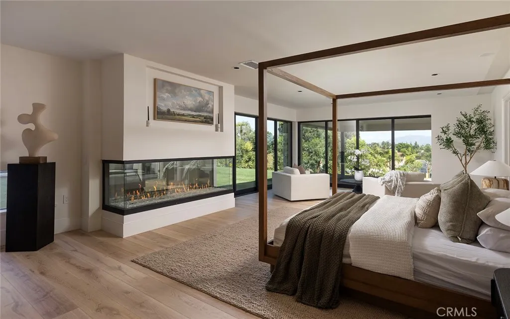 Tucked in the heart of North Orange County, this newly rebuilt single-level Ranch-Style estate has never been occupied and embodies timeless California living. Masterfully reimagined in 2025, the gated compound spans 7,705 square feet plus 2,565 sf of covered patios on 1.25 acres, with sweeping 180-degree panoramic views of the mountains and city lights. From the moment you arrive through the single-pivot glass door, the residence tells a story of heritage and craftsmanship. Every detail is thoughtfully curated, designed to honor its past while embracing a modern vision of luxury. Wide-plank oak floors framed with expansive windows and pocketing doors, the home unfolds into light-filled interiors where indoor and outdoor living blend seamlessly. The main residence offers a rare single-level floor plan with three ensuite bedrooms plus an office w/ fireplace that could be a 4th bedroom. A 1,490 sf detached guest house with its own kitchen, living, dining and laundry adds two additional bedrooms and baths, ideal for extended family or visitors. Formal and casual spaces flow together: a fireplace-warmed living room with mitered glass bay window, an elegant dining room, and a grand great room with soaring ceiling, walk-in wet bar, fireplace and disappearing 24-foot glass pocket doors that dissolve into the walls. The chefs kitchen blends artistry with function, showcasing Binova cabinetry from Italy, a striking 14-foot waterfall island, breakfast bar, dining nook, and suite of Gaggenau appliances. Two pocket doors extend the space to a covered terrace, inviting alfresco dining f