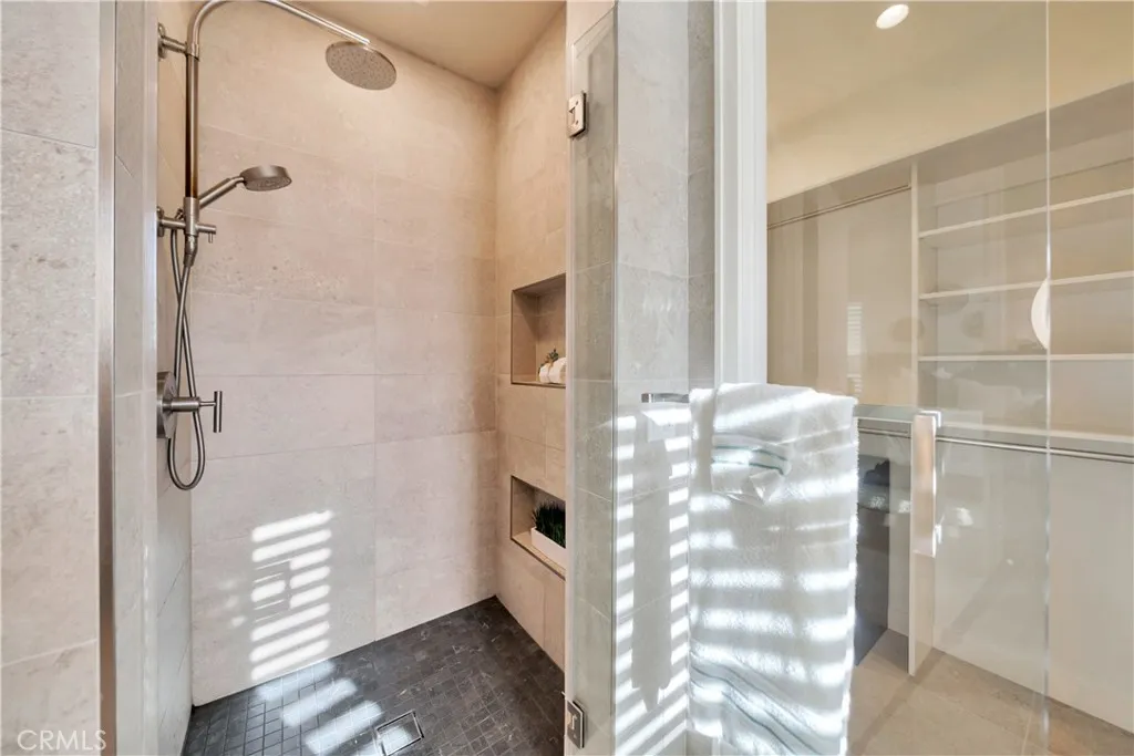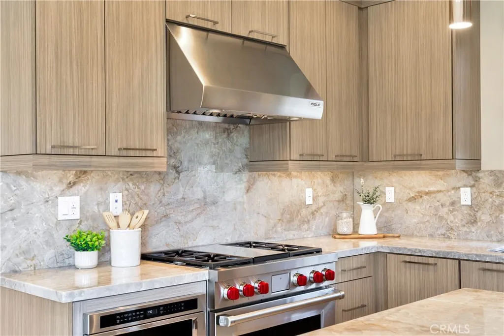 This meticulously upgraded Plan 4 by Irvine Pacific sits on a coveted corner lot in the prestigious gated Barcelona community. Designed for modern living, this 2-bedroom, 2.5-bath home with a versatile loft (convertible to a 3rd bedroom) blends elegance and comfort throughout. The bright, open-concept main level features soaring ceilings and dual stacked sliders that seamlessly connect indoor and outdoor spaces. The remodeled gourmet kitchen is a showstopper, boasting custom cabinetry, striking Quartzite countertops and backsplash, and a premium Sub-Zero/Wolf appliance packageincluding built-in refrigerator, six-burner stovetop, oven, microwave, wine cooler, and dishwasher. A spacious waterfall island with imported European pendants anchors the kitchen, perfect for entertaining. Adjacent, the dining area offers extended built-in storage, two natural wood-inspired pendant lights, and motorized Roman shades. The living room flows effortlessly onto a private patio with ceramic tile flooring extending outdoors, creating an entertainers dream surrounded by mature trees for privacy. Upstairs, upgraded stair rails lead to rich Oak wood flooring throughout. The primary suite impresses with vaulted ceilings, abundant natural light, a custom walk-in closet, and a spa-inspired bath with floor-to-ceiling designer tile, dual vanities, soaking tub, illuminated mirrors, and brushed nickel finishes. A spacious second bedroom pairs with a stylish full bath with dual sinks, while a convenient upstairs laundry room and loftideal as a lounge, library, or media spacecomplete the upper level. Pr