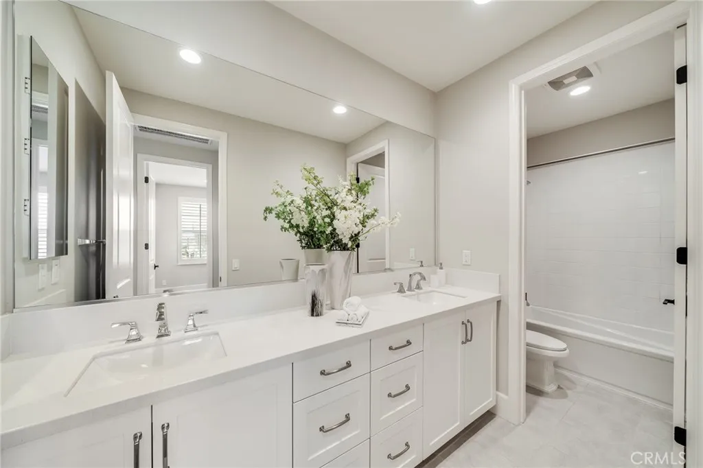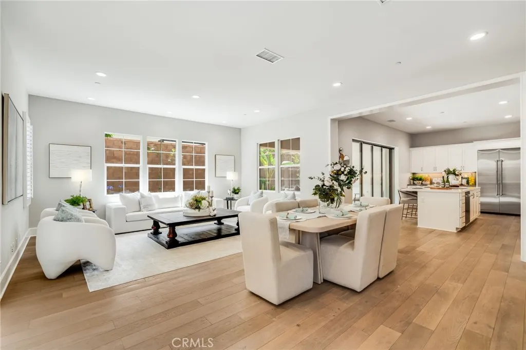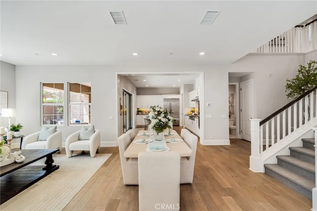 This elegant residence is located in the sought-after Eastwood Village community of Irvine and showcases tasteful upgrades with a spacious, functional layout. The home features a desirable downstairs guest suite with a private en-suite bathroom and walk-in closet, ideal for multigenerational living. The main kitchen offers an oversized center island, built-in double-door refrigerator, stainless steel appliances, 6-burner cooktop, large walk-in pantry, and a separate chefs kitchen for added flexibility. Beautiful wood flooring spans the main level, while the upper floor is enhanced with upgraded plush carpeting. A versatile loft provides additional space that can serve as a media room, office, or play area. The luxurious primary suite is situated upstairs with scenic views and includes a spa-inspired bathroom with a soaking tub, walk-in shower, and custom-designed walk-in closet. A recently added California room extends the living space outdoors for year-round enjoyment. Residents of Eastwood Village enjoy resort-style amenities including pools, clubhouses, BBQ areas, tennis and basketball courts, soccer fields, playgrounds, and the scenic Jeffrey Open Space Trail. Conveniently located near shopping, highly regarded schools, and major freeways, this home offers the perfect blend of luxury, comfort, and convenience.