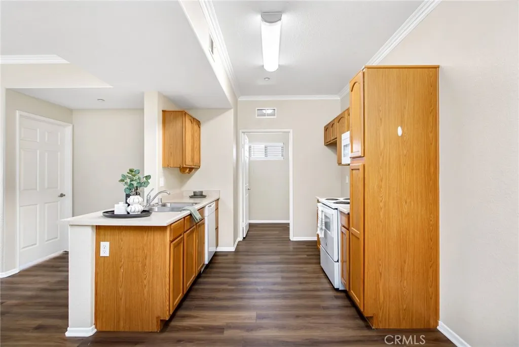 Discover effortless living in this meticulously maintained 2-bedroom, 2-bathroom condo, designed for modern comfort and style. The moment you step inside, you'll be greeted by an inviting, open-concept layout defined by stunning wood-style laminate flooring that extends throughout the main living spaces. The heart of the home is a bright and airy living room, centered around a charming fireplace with a tile surround. It creates the perfect focal point for quiet evenings or casual entertaining. The kitchen is both practical and polished, featuring a full suite of clean white appliances and abundant counter space, ready for your culinary adventures. A convenient breakfast bar provides a seamless transition from the kitchen to the dining area, enhancing the flow of the space. Retreat to the spacious primary suite, a true sanctuary complete with a generous walk-in closet and a private en-suite bathroom. The second bedroom is equally versatile and well-proportioned, ideal for a guest room, home office, or personal gym. Additional peace of mind comes with a brand-new air conditioning unit installed in January, ensuring year-round comfort and efficiency. Experience resort-style living with an array of exceptional community amenities. Enjoy a refreshing dip in the sparkling pool, relax in the soothing spa, or stay active at the on-site racquetball court and fully equipped gym. Added benefits include a 1-car detached garage for secure parking and extra storage, combining comfort with ultimate convenience. This home is not just a place to live; it is a lifestyle upgrade that perfectl