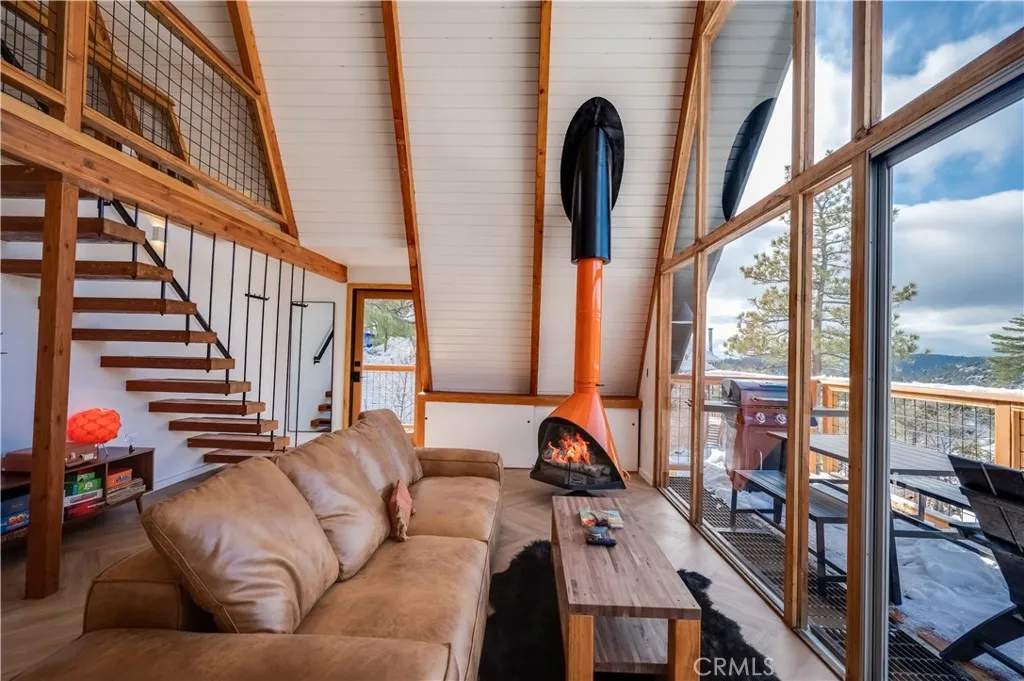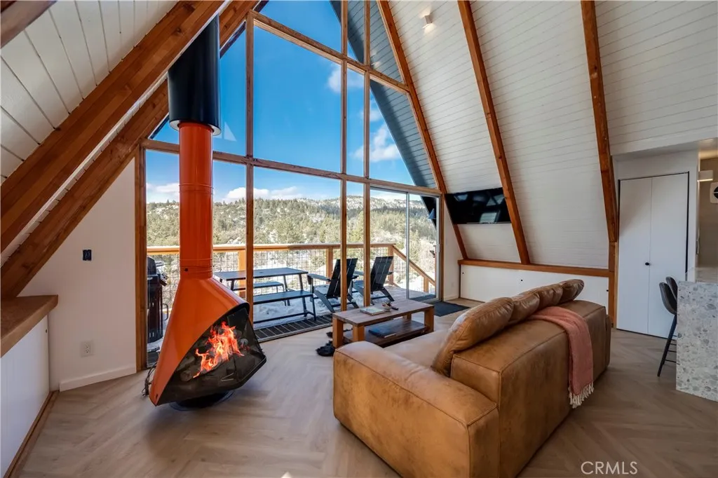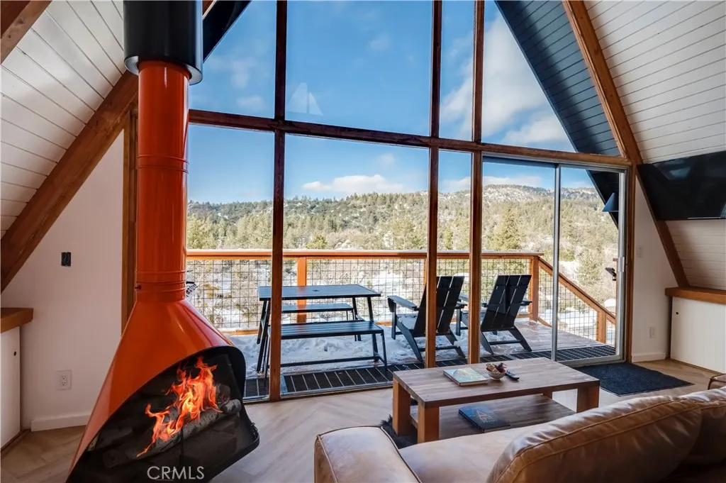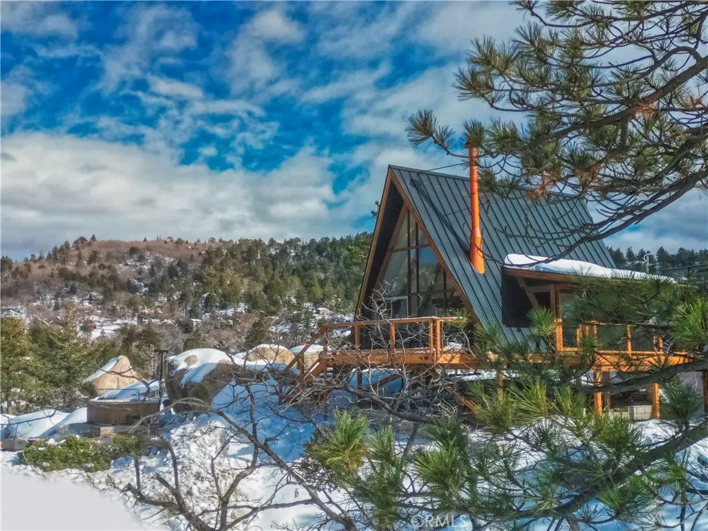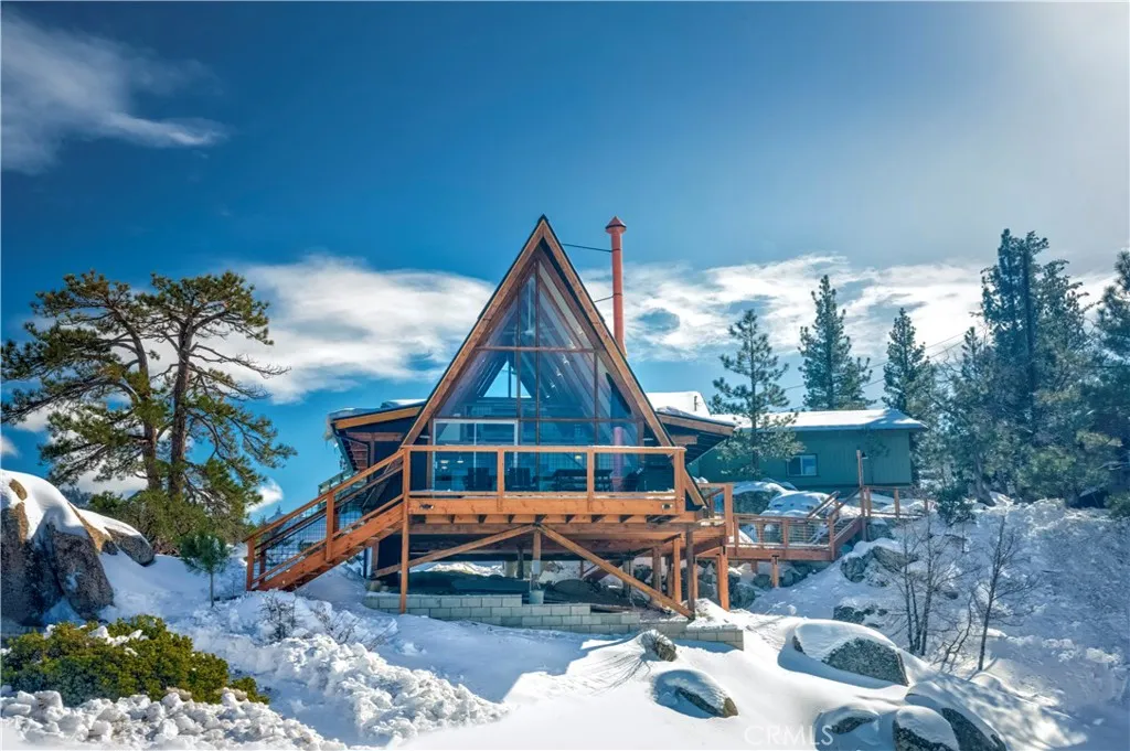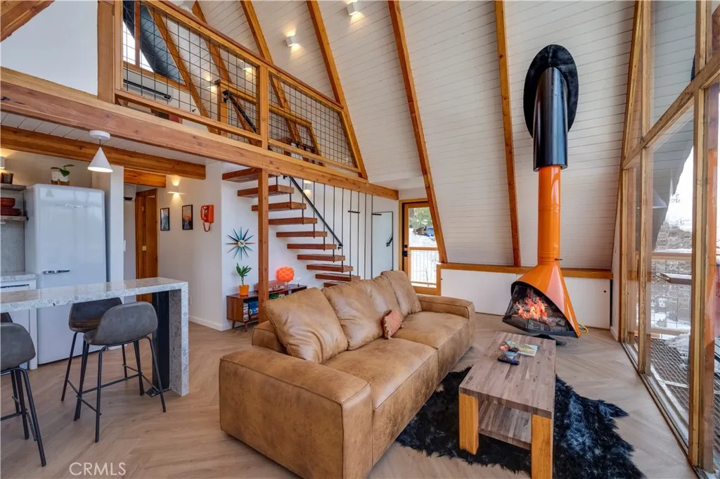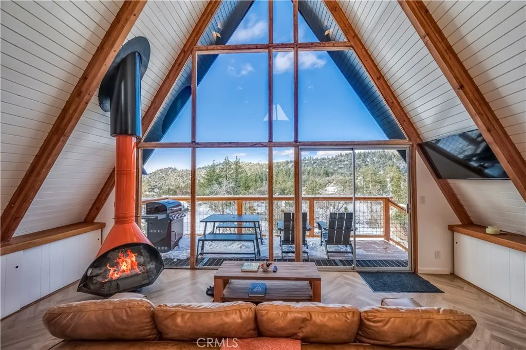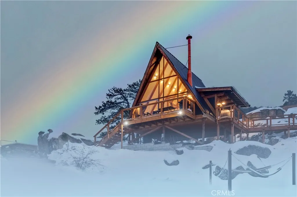 The Lake Arrowhead/Big Bear region is synonymous with A frames. A-frames are reflections of the mountains they inhabit; snowed in, Aprs Ski, and Summer pine aromas. This A Frame sits at a pinnacle, capturing unbridled views. Built in 1964 as a price for a Heinz 57 sweepstakes winner. Then, in 2022, the structure was brilliantly restored showcasing precision in spatial planning, material integrity, and modern-rustic synergy. Herringbone hardwood floors draw the eye across the room like an arrow, up to the full frame windows and out to the sky, boulders, and forest. The kitchen is smart, with a full suite of appliances including retro Classic brand fridge, gas stove and microwave, water filter, dishwasher and hidden laundry facilities. The counters are quartz river stone terrazzo, and an elegant steal reenforced floating waterfall edge serves as a dining setting, bar, prep or laundry station. The sofa is faced directly at the twenty-five-foot-tall window. The forest brushing the bottoms of clouds and shifting colors of the sky and phases of the moon and stars are true natural endless entertainment. A vintage Midcentury MALM fireplace ties a whole architectural theme and scheme together. The bath features a walk- in shower with hexagonal tile Aswell as acoustic paneling behind the commode. The basin sink preserves counterspace. And heated floors warm your bare feet all year long. Downstairs is a bedroom for guests, but the bedroom loft upstairs is romantic magic. Ascend a floating staircase to a boudoir where the moon kisses you good night and the light on the trees brushes yo