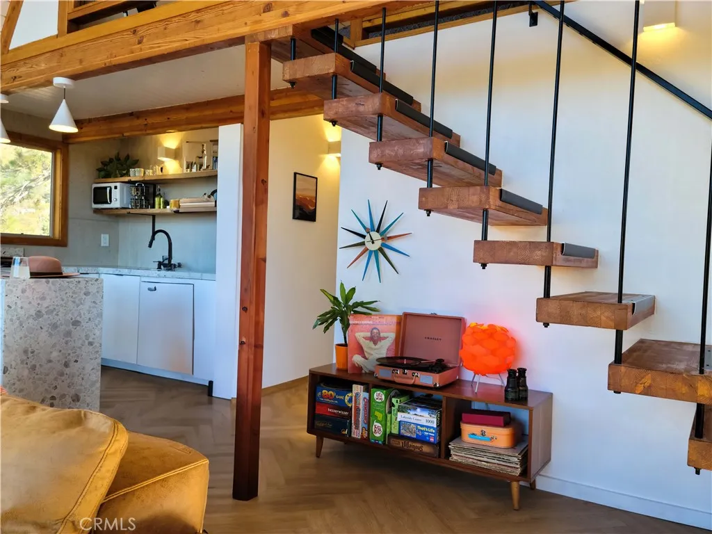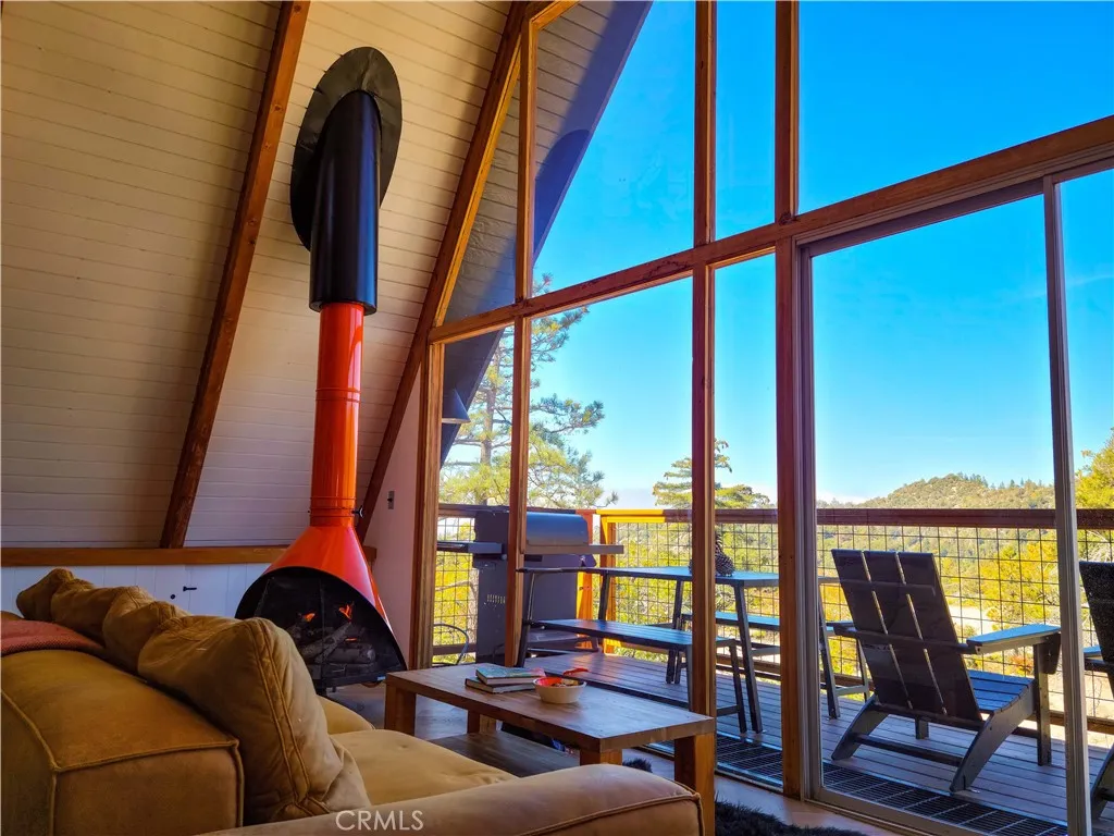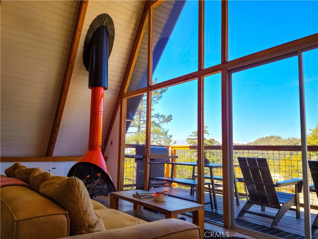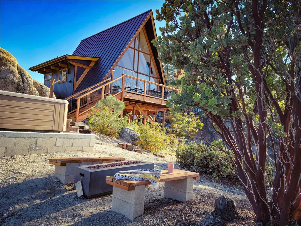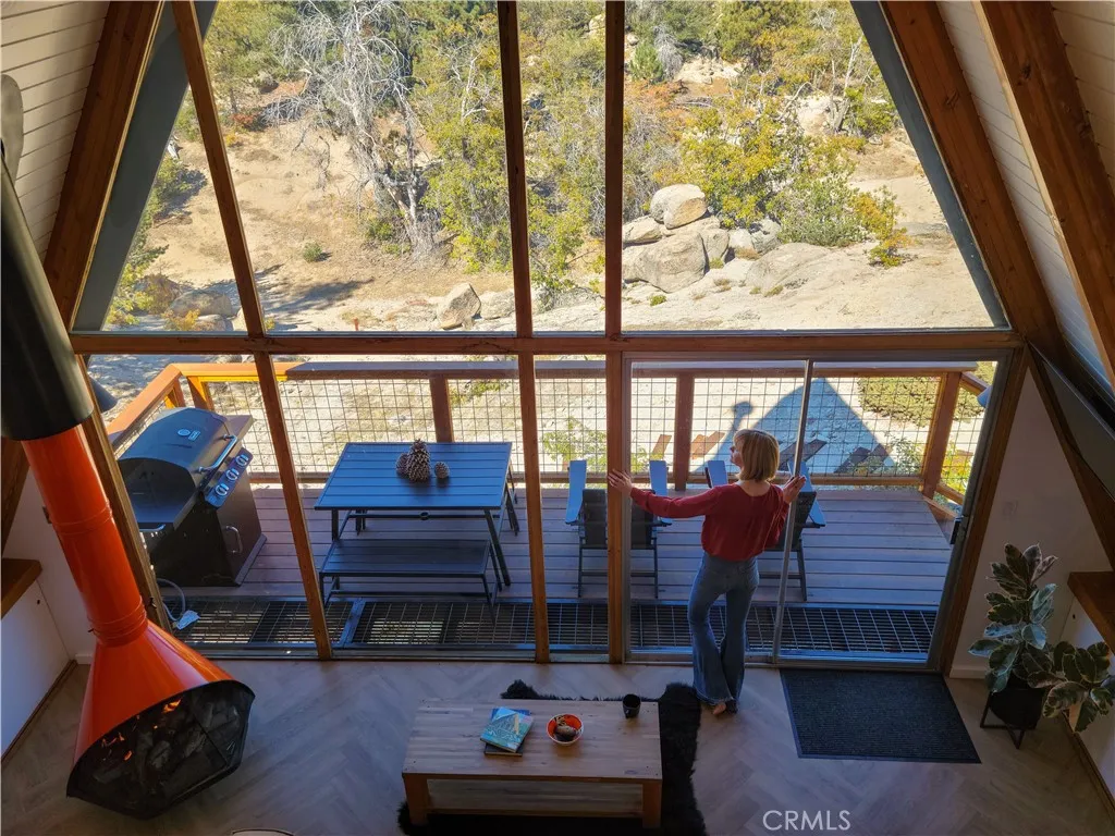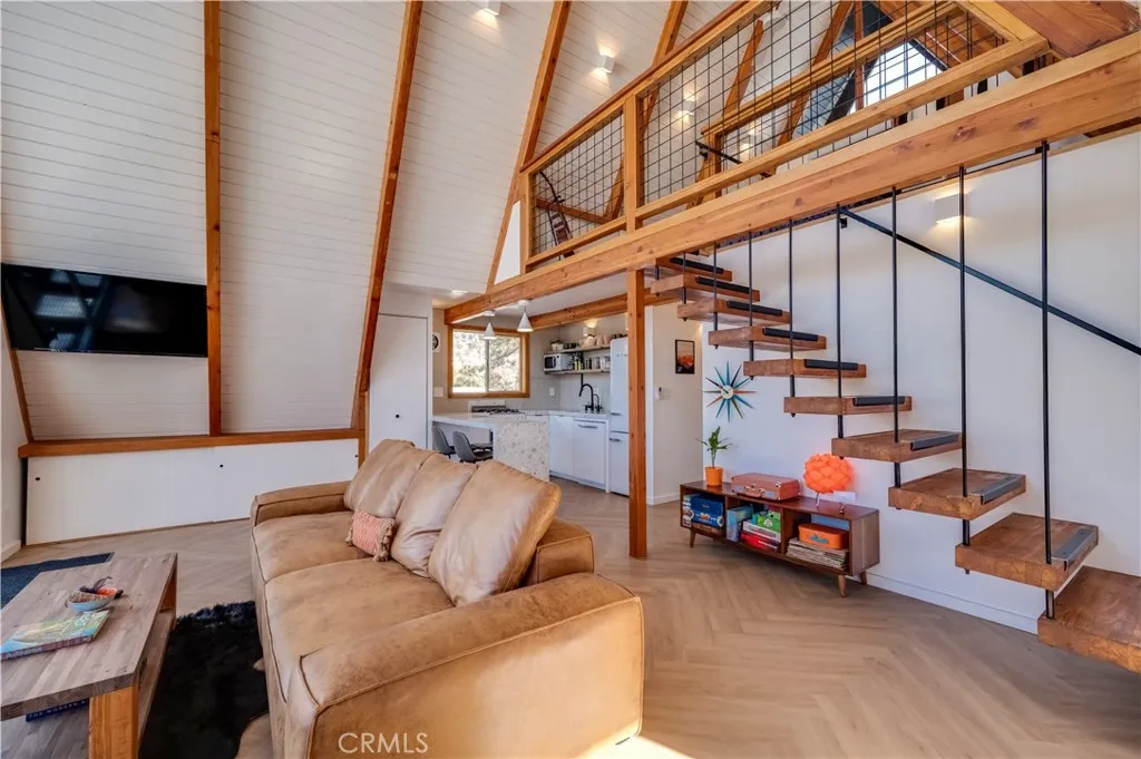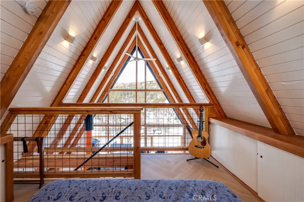 The Lake Arrowhead/Big Bear region is synonymous with A frames. A-frames are reflections of the mountains they inhabit; snowed in, Aprs Ski, and Summer pine aromas. This A Frame sits at a pinnacle, capturing unbridled views. Built in 1964 as a price for a Heinz 57 sweepstakes winner. Then, in 2022, the structure was brilliantly restored showcasing precision in spatial planning, material integrity, and modern-rustic synergy. Herringbone hardwood floors draw the eye across the room like an arrow, up to the full frame windows and out to the sky, boulders, and forest. The kitchen is smart, with a full suite of appliances including retro Classic brand fridge, gas stove and microwave, water filter, dishwasher and hidden laundry facilities. The counters are quartz river stone terrazzo, and an elegant steal reenforced floating waterfall edge serves as a dining setting, bar, prep or laundry station. The sofa is faced directly at the twenty-five-foot-tall window. The forest brushing the bottoms of clouds and shifting colors of the sky and phases of the moon and stars are true natural endless entertainment. A vintage Midcentury MALM fireplace ties a whole architectural theme and scheme together. The bath features a walk- in shower with hexagonal tile Aswell as acoustic paneling behind the commode. The basin sink preserves counterspace. And heated floors warm your bare feet all year long. Downstairs is a bedroom for guests, but the bedroom loft upstairs is romantic magic. Ascend a floating staircase to a boudoir where the moon kisses you good night and the light on the trees brushes yo