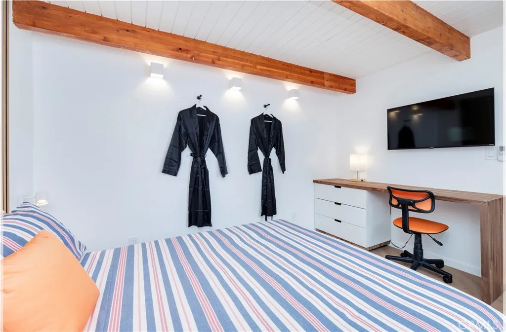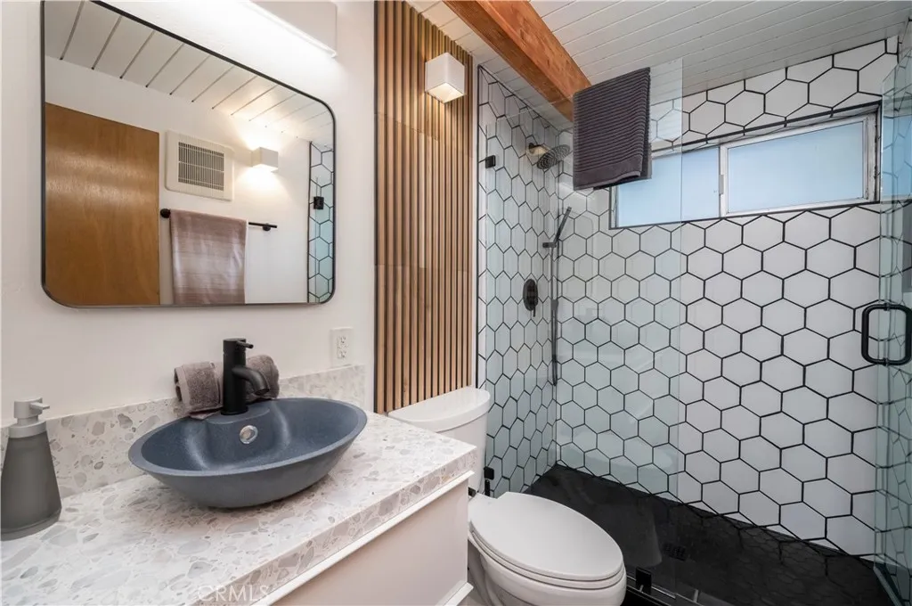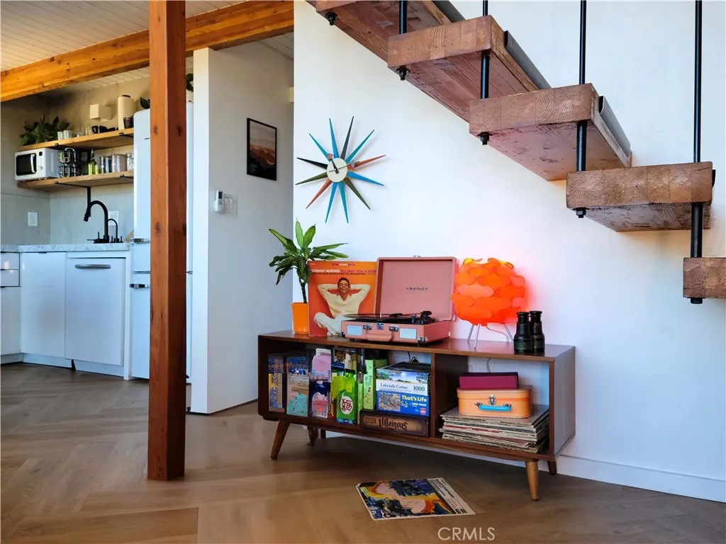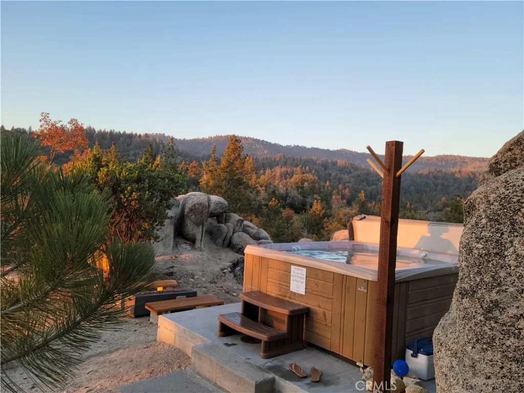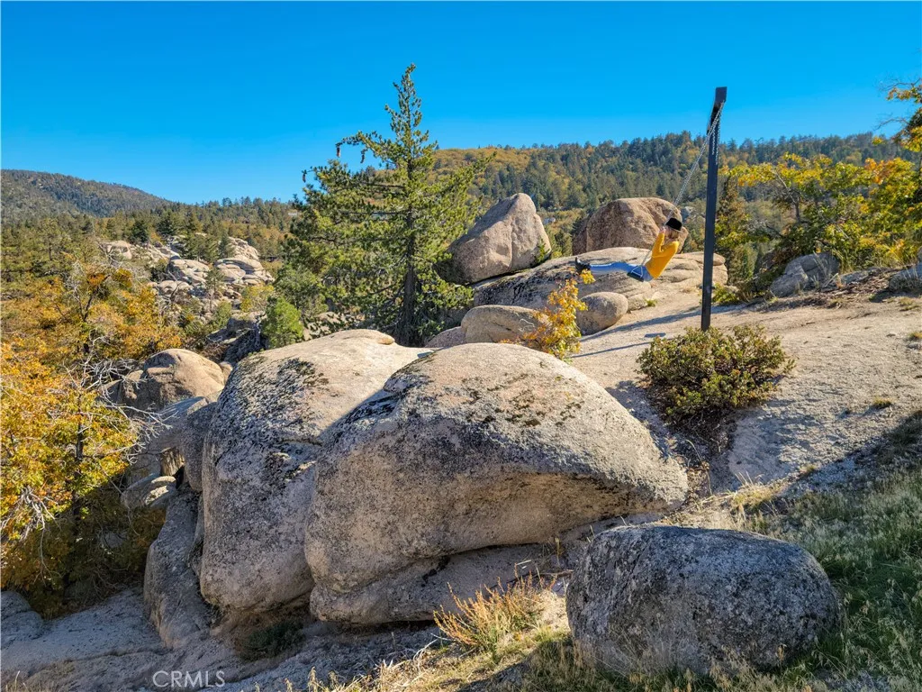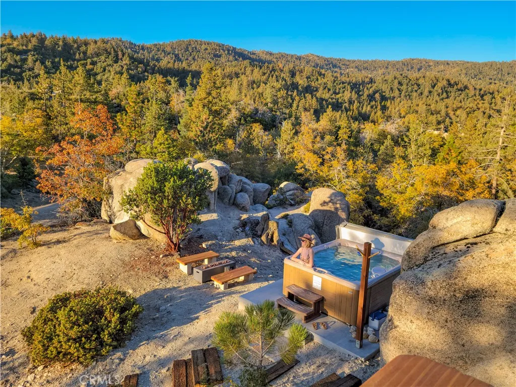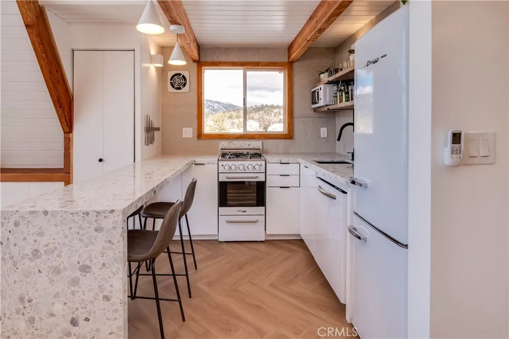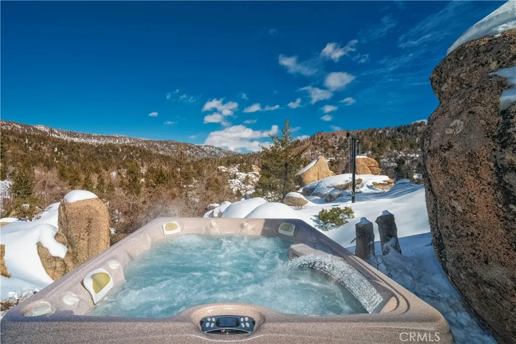 The Lake Arrowhead/Big Bear region is synonymous with A frames. A-frames are reflections of the mountains they inhabit; snowed in, Aprs Ski, and Summer pine aromas. This A Frame sits at a pinnacle, capturing unbridled views. Built in 1964 as a price for a Heinz 57 sweepstakes winner. Then, in 2022, the structure was brilliantly restored showcasing precision in spatial planning, material integrity, and modern-rustic synergy. Herringbone hardwood floors draw the eye across the room like an arrow, up to the full frame windows and out to the sky, boulders, and forest. The kitchen is smart, with a full suite of appliances including retro Classic brand fridge, gas stove and microwave, water filter, dishwasher and hidden laundry facilities. The counters are quartz river stone terrazzo, and an elegant steal reenforced floating waterfall edge serves as a dining setting, bar, prep or laundry station. The sofa is faced directly at the twenty-five-foot-tall window. The forest brushing the bottoms of clouds and shifting colors of the sky and phases of the moon and stars are true natural endless entertainment. A vintage Midcentury MALM fireplace ties a whole architectural theme and scheme together. The bath features a walk- in shower with hexagonal tile Aswell as acoustic paneling behind the commode. The basin sink preserves counterspace. And heated floors warm your bare feet all year long. Downstairs is a bedroom for guests, but the bedroom loft upstairs is romantic magic. Ascend a floating staircase to a boudoir where the moon kisses you good night and the light on the trees brushes yo