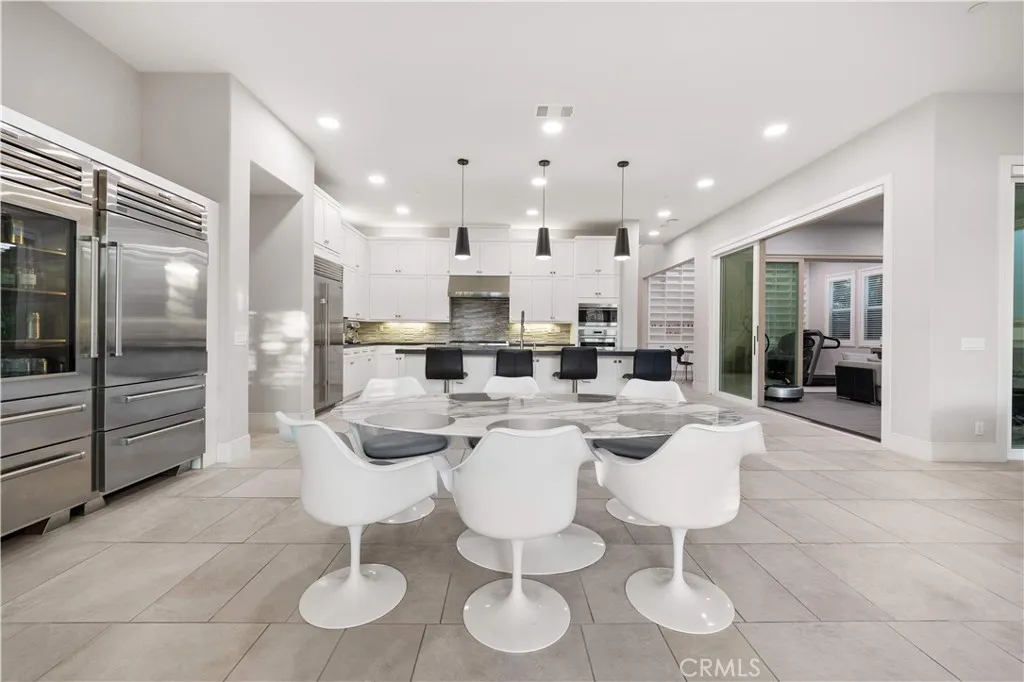 FORMER MODEL HOME at Great Park with over $700K in upgrades situated on an extra-large 7,843 sqft premium lot a rare find. Upon arrival, the Spanish-inspired architecture and landscaping set the stage for elegance. Step inside to a dramatic two-story foyer with a curved staircase, leading to a spacious open floor plan filled with natural light. The chefs dream kitchen features Wolf appliances and an extraordinary wall of four Sub-Zero units, quartz countertops, and an oversized island, custom backsplash, large walk-in pantry, seamlessly connected to the great room and California Room. Guest powder rooms on both levels, 5 bedrooms total, all bedrooms have an en-suite bathroom including desirable 1st floor guest suite. The original courtyard was transformed into a versatile lifestyle lounge with wood-plastic composite decking, and a modern fireplace. Upstairs, the primary suite retreat offers coffered ceilings, a spa-inspired bathroom with dual vanities, soaking tub, and a private balcony overlooking the backyard. Three secondary bedrooms and a generous loft provide comfort and flexibility.The 3-car garage and oversized mud room provide exceptional practicality. The resort-style backyard is a showstopper: a custom glass canopy with lighting, built-in BBQ, fireplace with TV, and triple water feature, perfect for entertaining. Located in the vibrant Great Park Neighborhoods, residents enjoy award-winning Irvine schools (Cadence Park K-8, Portola High), community pools, parks, and trails all just minutes from shopping, dining, and freeways.