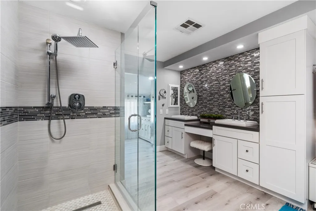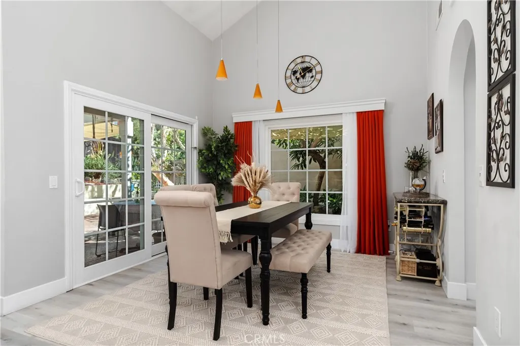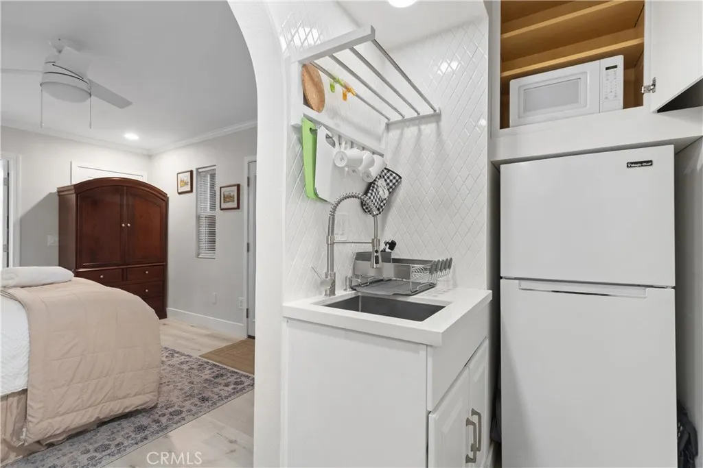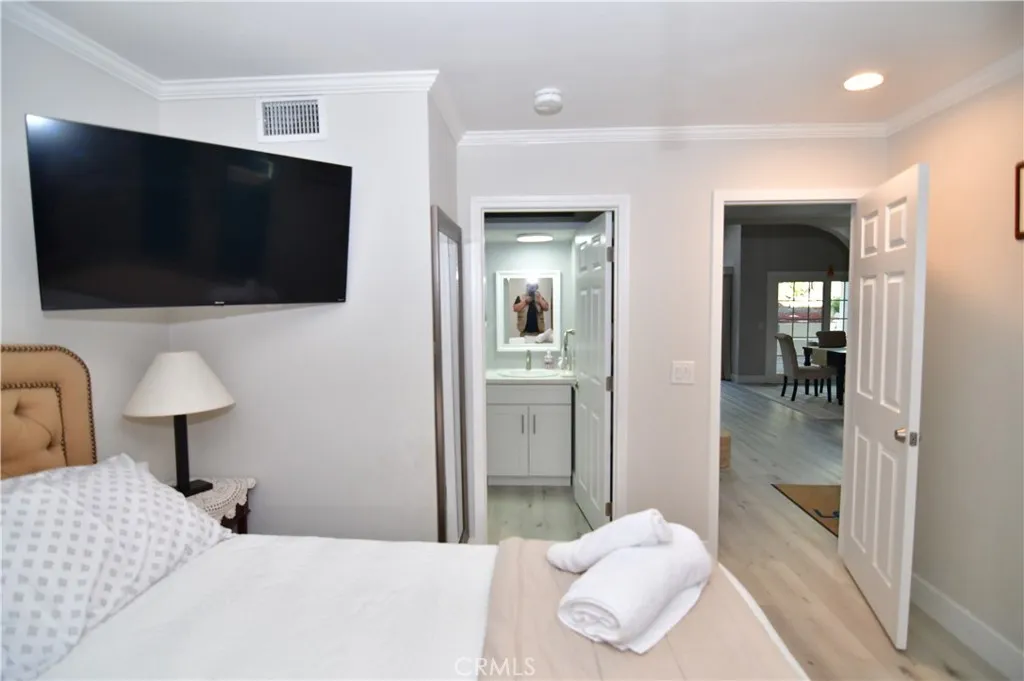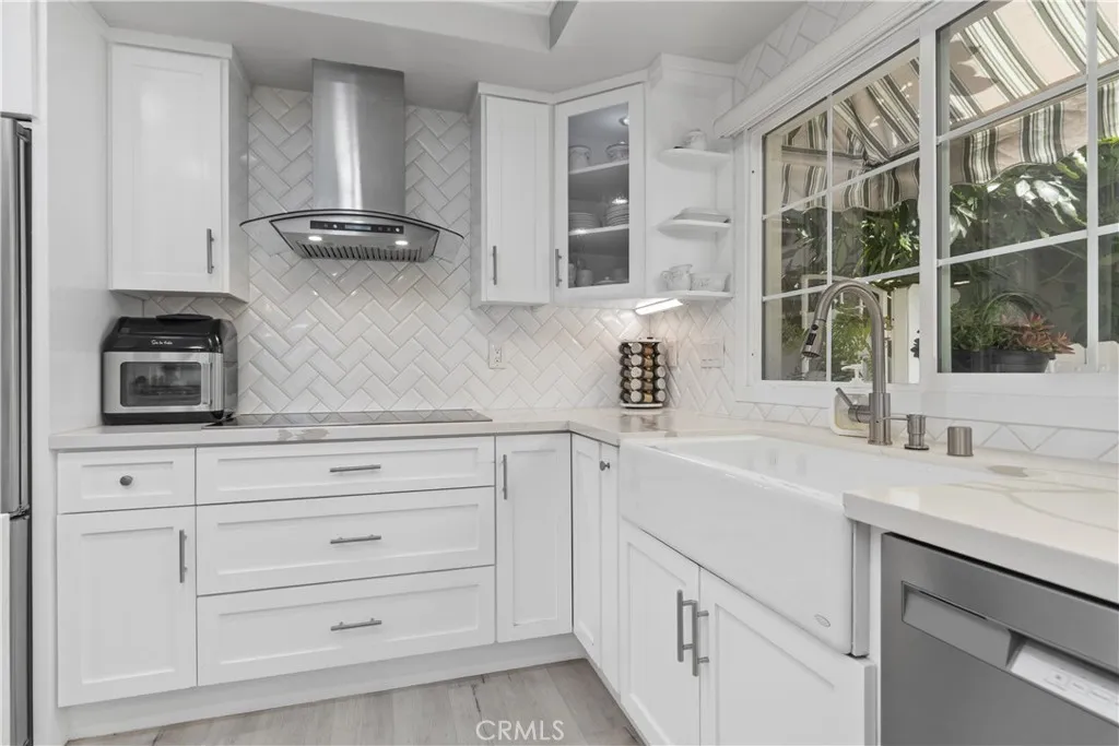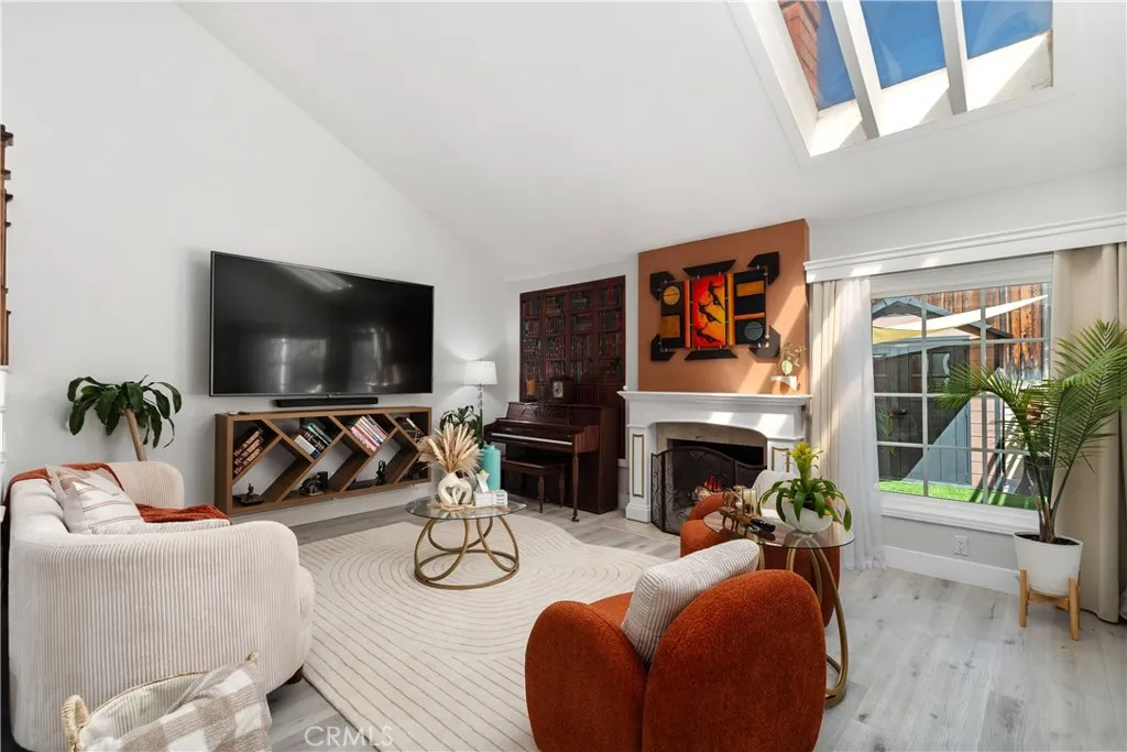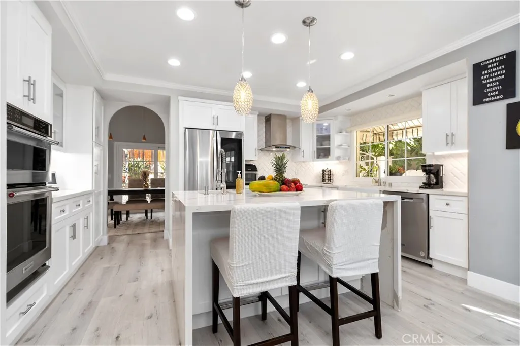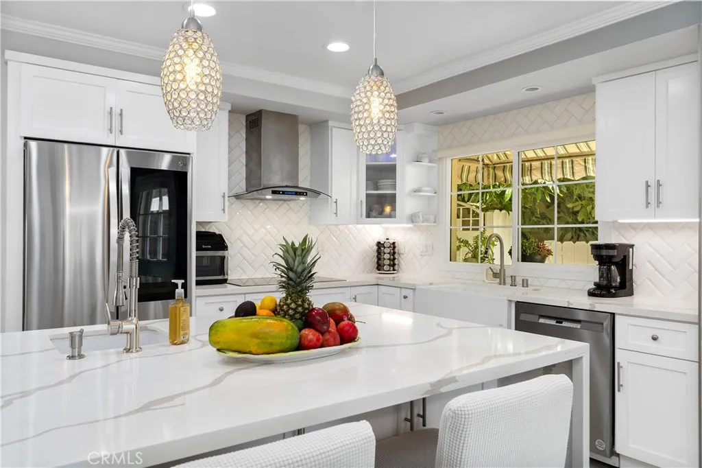 This stunning, fully remodeled residence masterfully blends modern luxury with functional design. Spanning 2,120 square feet on a generous 4,900-square-foot lot, this exquisite home offers ample space for both indoor and outdoor living. The property boasts 3 bedrooms and 3 full bathrooms, plus an elegant powder room, ensuring comfort and privacy for all residents. Each bedroom features an en-suite bathroom and a ceiling fan, creating a private retreat. The spacious master suite is a haven, complete with a double-sink en-suite bathroom, a sleek standing shower, and a freestanding soaking tub. A STANDOUT FEATURE IS THE VERSATILE DOWNSTAIRS SUITE, EQUIPPED WITH A UPGRADED MINI KITCHEN, REFRIGERATOR, COOKTOP, AND PRIVATE ENTRANCEPERFECT FOR RENTAL INCOME OR AS AN IN-LAW SUITE FOR MULTI-GENERATIONAL LIVING. The living area impresses with a vaulted ceiling, skylights that flood the space with natural light, and a cozy fireplace with a chic marble mantel. This open-concept design flows seamlessly into a dining area framed by large windows, inviting abundant natural light. The chefs dream kitchen features a expansive quartz island with a sink, matching countertops, modern pendant lighting, crisp white cabinetry, and professional-grade stainless-steel appliances. Light wood flooring and thoughtful decor elevate the space, while a door provides convenient access to the side yard. Recent upgrades include a state-of-the-art, energy-efficient air conditioning system and a tankless water heater, ensuring modern comfort and sustainability. The outdoor spaces are equally captivating. The f