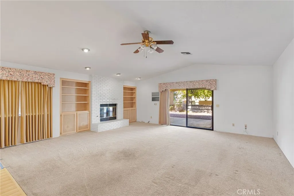 Charming three-bedroom, two-bath home with plenty of space and character! This property features a tile roof, rockscape front yard with no grass, block walls, and a wrought iron gate. Enjoy relaxing mornings on the front porch before stepping inside through the tile entryway. The home offers a two-car garage and thoughtful layout. Bedroom 1, with carpet and built-ins, makes a perfect office or guest space, while Bedroom 2 also has carpet. The primary suite includes carpet, a large mirrored closet, and an ensuite with tiled floors, dual sinks with cultured marble, a small tiled shower, and a sunken tub. The guest bath features a cultured marble shower and tile flooring. The living room is spacious with vaulted ceilings, a beautiful brick fireplace framed by built-ins, and an open connection to the dining area. A large wet bar with sinks makes entertaining easy. The kitchen offers excellent storage with two pantries, plus a center island with electric cooktop, granite countertops, a microwave/oven combo, and a trash compactorall set on durable laminate flooring. Additional features include a covered patio, backyard shed, and a swamp cooler (currently winterized). This home blends functionality with comfortready for your personal touch!