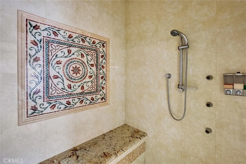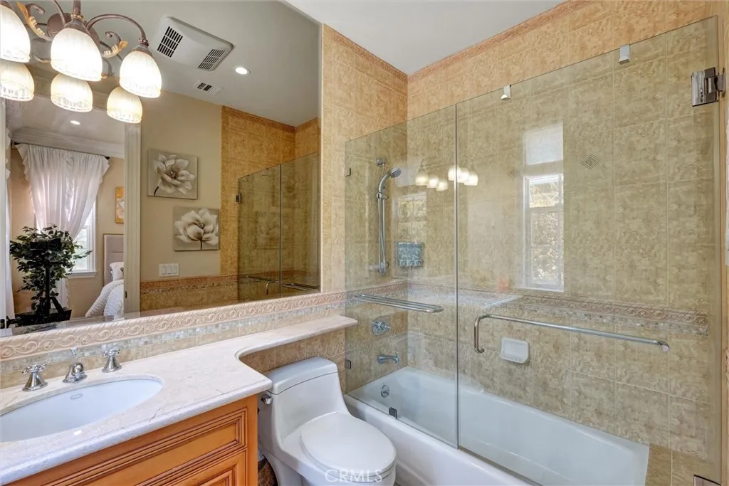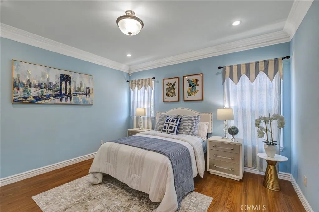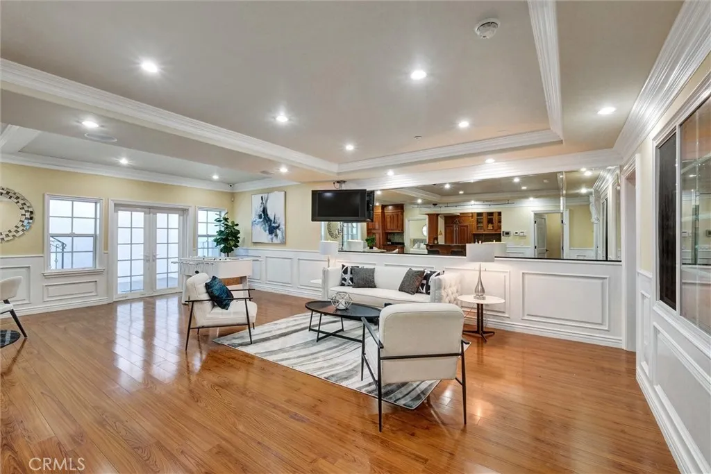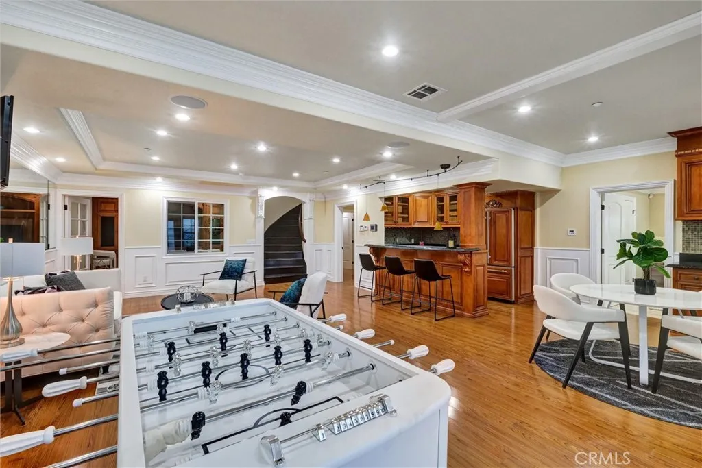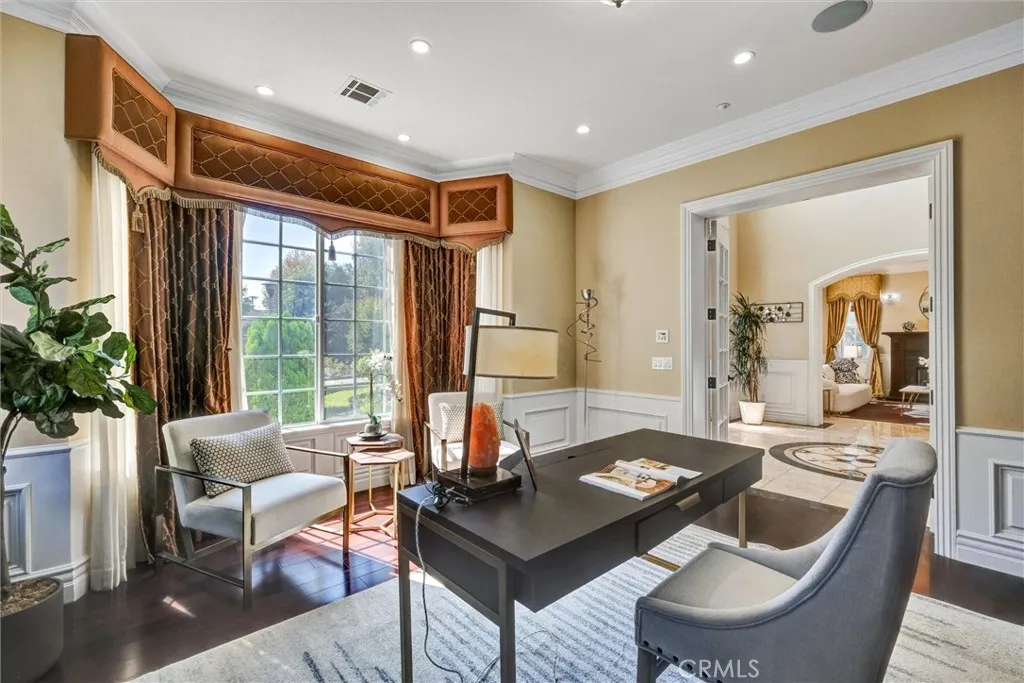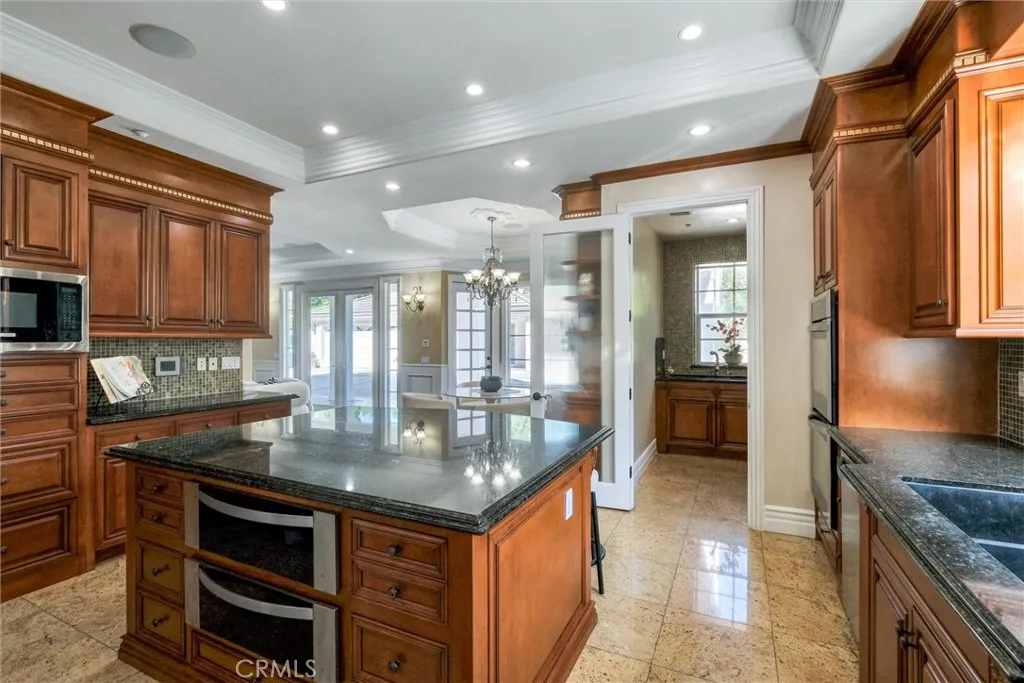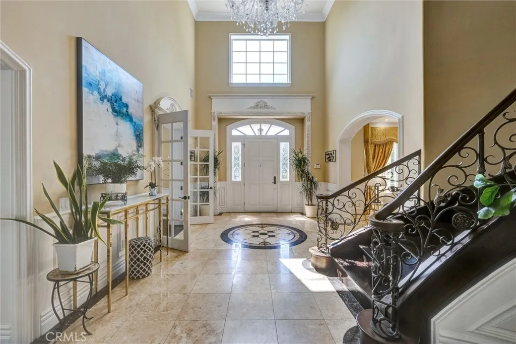 This timeless Georgian Colonial-style residence was completely rebuilt in 2008. It offers six bedrooms, six and a half bathrooms, and a detached three-car garage. Upon entering the grand foyer, you'll be welcomed by a stunning chandelier and a stenciled dome with ceilings reaching at least 20 feet high. To the right is a sophisticated library with custom-built cabinetry and a fireplace, creating a quiet space perfect for working from home. On the left is a stunning formal living room, adjacent to a elegant formal dining room framed by French doors, providing a picture-perfect setting for dinner parties with family and friends The chefs kitchen features a large marble center island, two warming drawers, a stainless-steel refrigerator and freezer, a six-burner gas stove, built-in microwave, double oven, and a wok kitchen equipped with a six-burner gas stove. The family room includes custom cabinets, a central AV console, and a full bar for entertaining. A wide staircase with art deco handrails leads to the second floor, where the master suite boasts its own bathroom and walk-in closet, with luxurious marble flooring and walls, a double sink vanity, Jacuzzi bathtub, steam shower, and a custom vanity dresser. The connected his-and-her offices feature a balcony overlooking the San Gabriel Mountains. The home also includes a rare lower-level basement in Arcadia, which comprises a dance studio, entertainment room, game room, and a master suite with a marble shower, steam room, and custom-built cabinets with stained surfaces. This level is equipped with a bar, refrigerator, and fre