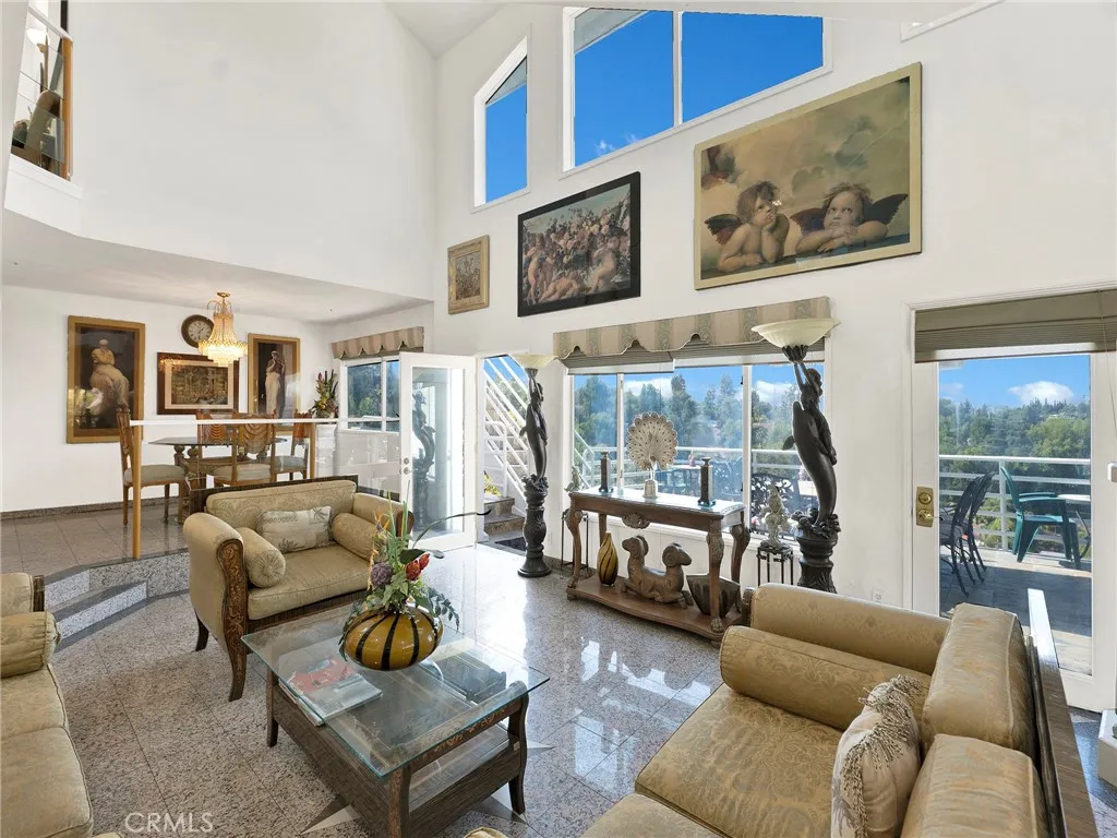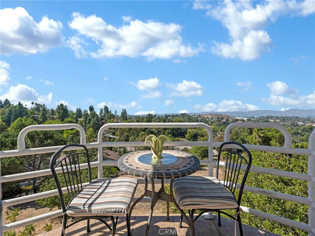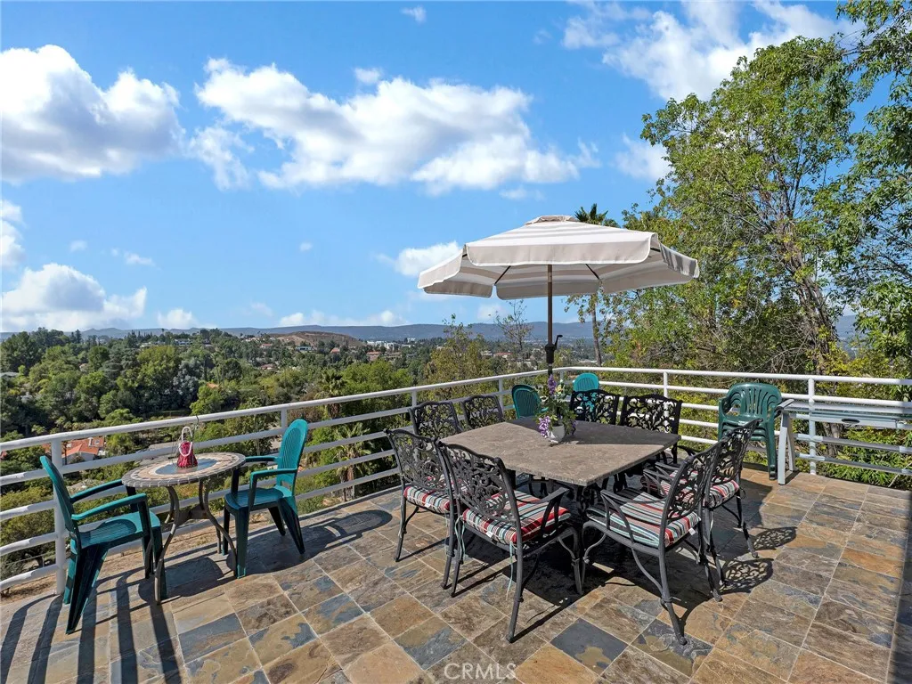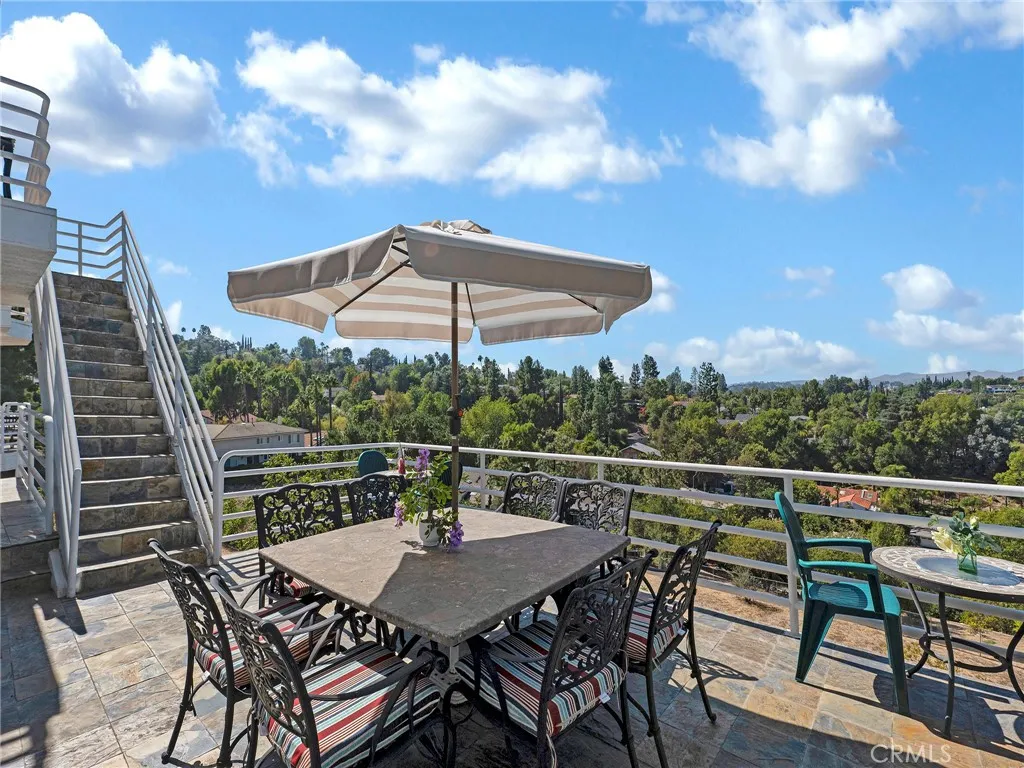 Absolute must-see! Elevated, exceptional Vista de Oro estate with breathtaking 180 panoramic views from virtually every vantage point. Located South of the Boulevard in Woodland Hills most desirable enclave. Enjoy an idyllic drive past pride-of-ownership estates leading to nearly 5,000 sq ft of living space on an expansive 22,500+ sq ft mostly flat lot. This 5-bedroom, 5-bath residence offers unique expansion potential for multi-generational living, resort-style entertaining, a luxury family compound, or the future development of multiple ADUs. A double-door entry opens to a dramatic two-story foyer with a glass-framed staircase. The main level features a cozy reception area, a spacious living room with fireplace and walls of glass framing unobstructed valley and city-light views, an oversized formal dining room with wet bar, and a chefs kitchen with generous granite counters, stainless steel appliances, and its own scenic balcony. Multiple decks and balconies flow seamlessly for both grand entertaining and everyday living. A symphony of windows, skylights, and glass doors bathes the interiors in natural light. Upstairs, the private retreat showcases a large primary suite with soaring ceilings, dual balconies, fireplace, walk-in closet, and spa-style bath. Four additional bedrooms with high ceilings and four baths offer flexibility for family or guests. The open loft area can serve as a home office. On the lower levels, discover a full-size family/game room with wet bar, a theater room, ample storage, and a separate suite with its own entranceideal for extended family, stud