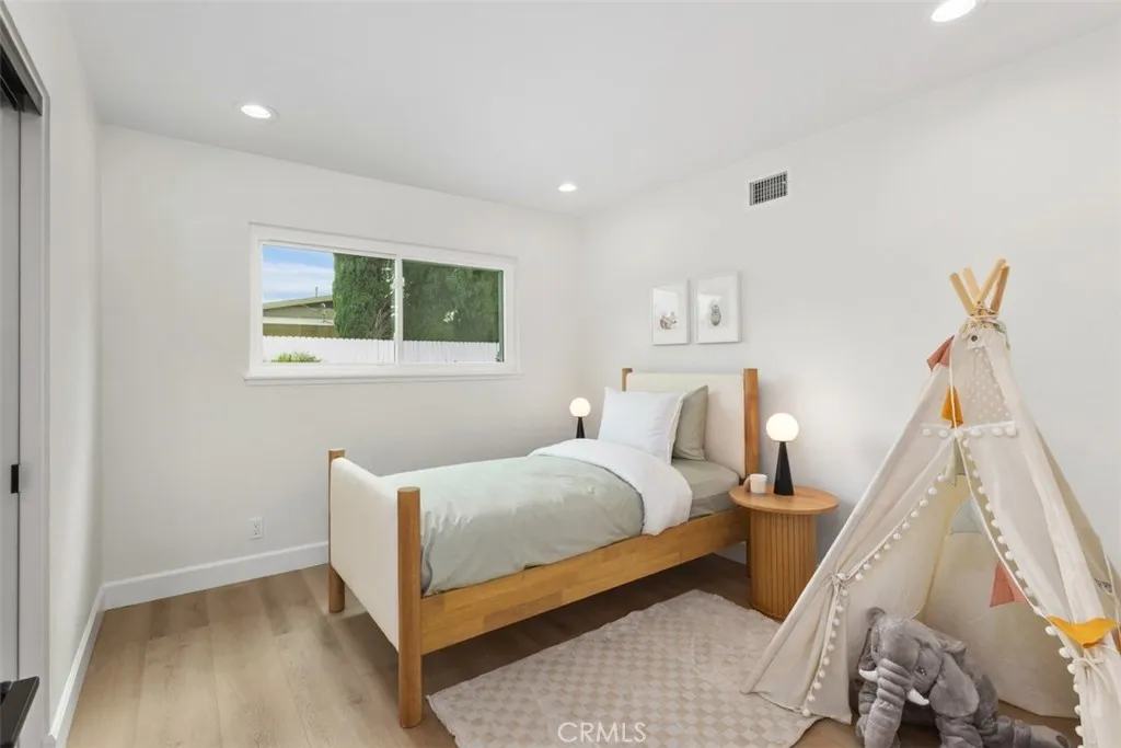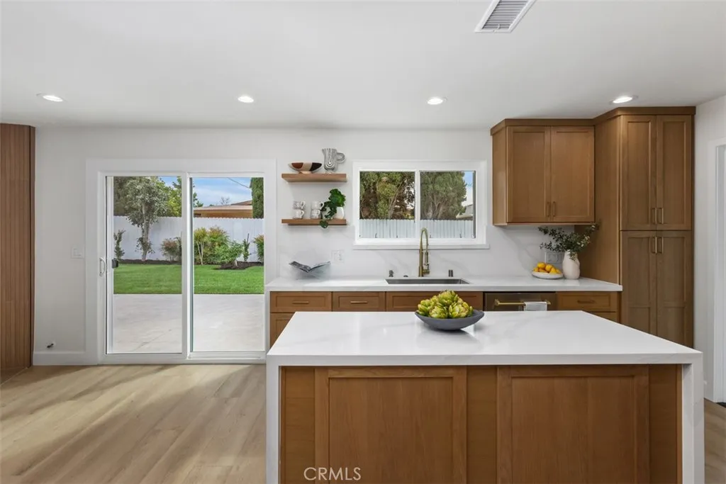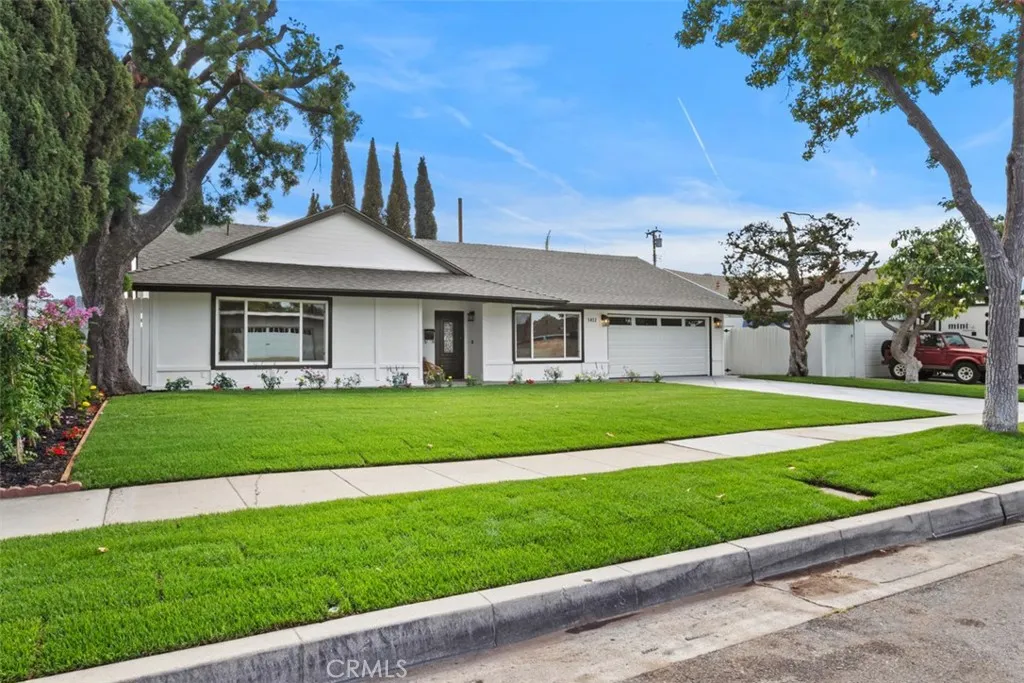 A celebration of clean lines, natural light, and thoughtful craftsmanship, this newly reimagined 1962 Mid-Century ranch-style home invites you to enjoy the best of both past and present. Situated in a charming neighborhood just minutes from Old Towne Orange and Chapman University, the home has been meticulously remodeled with curated finishes and elevated functioncreating a space where timeless style meets todays ease. Spanning approx. 1,469 square feet, the single-level layout flows effortlessly with four bedrooms and two baths, including a light-filled living and dining area anchored by a modern slat-wood fireplace surround. The new designer kitchen opens seamlessly to the backyard and features a dual-waterfall island, full quartz backsplash, light oak Shaker cabinetry, and high-end stainless appliances including a pro-style Zline range and drawer microwave. A spacious mudroom with laundry, cabinetry, and sink connects to the freshly finished two-car garage with epoxy floors and new door. Down the hall, secondary bedrooms are bright and functional, while the guest bath pairs timeless black-and-white tile with updated fixtures. The primary suite offers a walk-in closet and a serene ensuite with a custom vanity and walk-in shower. Throughout the home, wide-plank white oak-style LVP, recessed lighting, Shaker doors with black hardware, dual-pane windows, Nest smart thermostat, and Ring doorbell enhance both comfort and style. Outdoors, the 7,070 sq. ft. lot is equally turnkey. A new roof, fresh exterior paint, lush lawn, automatic sprinklers, and tile-finished patio come tog