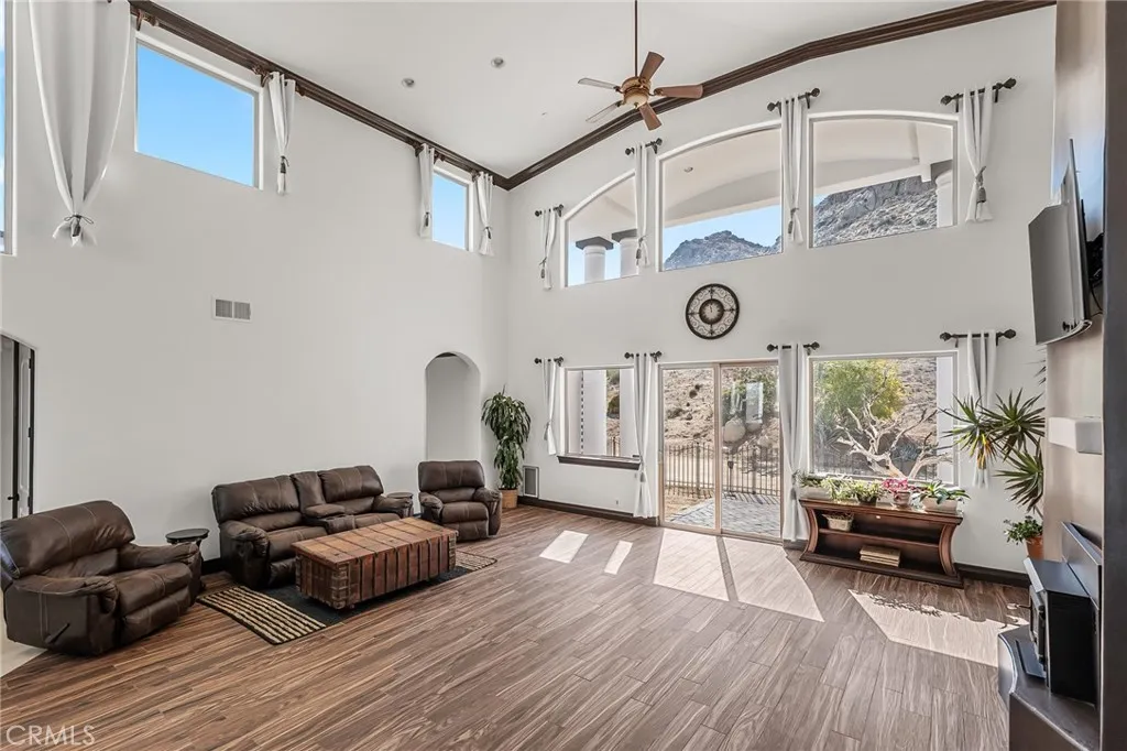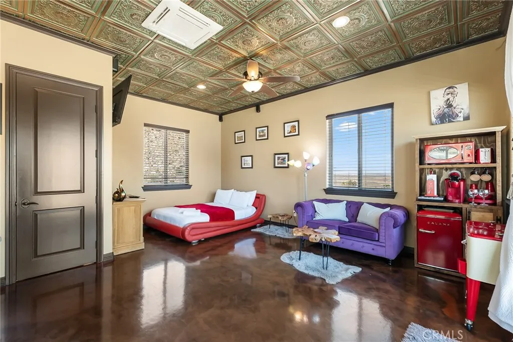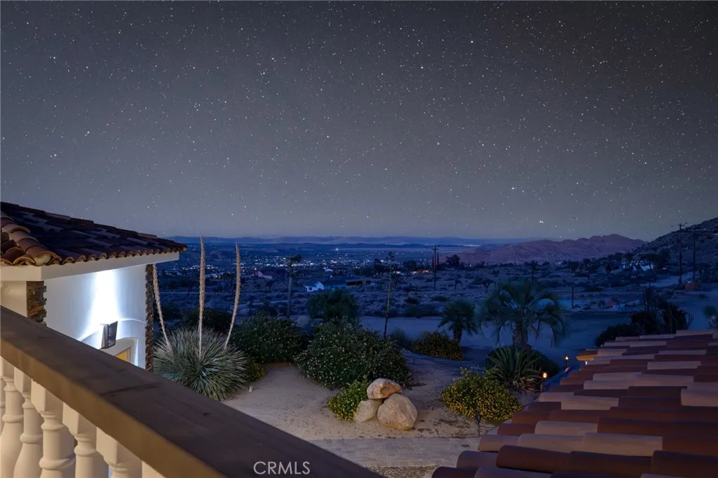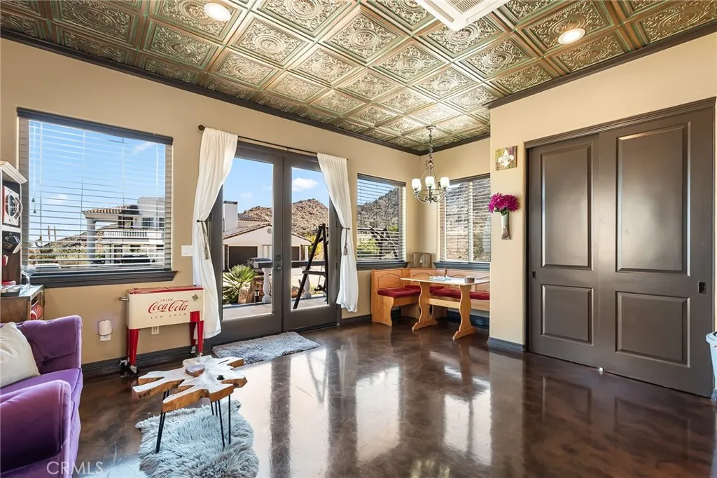 One of the most unique Joshua Tree estates youll ever find, this remarkable custom property stands out for both its impressive scale and exceptional design. As you enter through the handcrafted wood front door, youre greeted by soaring 24 foot ceilings and stunning custom glass windows that flood the home with natural light while framing breathtaking views of the desert and surrounding mountains. The open-concept layout seamlessly connects the living room, kitchen, and dining areas, perfect for cooking, entertaining, and relaxing in style. Nearly all bedrooms are conveniently located on the main level, with the exception of one special suite accessed by a spiral staircase. This private retreat features its own sitting area overlooking the living room and a spacious outdoor patio where you can take in the spectacular desert sunsets. Set on just under 3 acres and only one lot away from Joshua Tree National Park, this property offers endless opportunities for private hikes and desert adventures right from your doorstep. Nestled among dramatic rock formations and mountain views, the estate also includes a beautifully designed guest home, ideal for visitors, rental income, or a private studio. If you demand the very best in desert living, this extraordinary home delivers it all. Experience the magic of Joshua Tree from your own private sanctuary, you wont be disappointed.