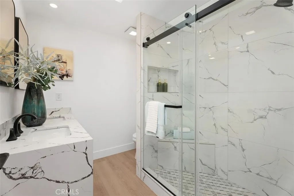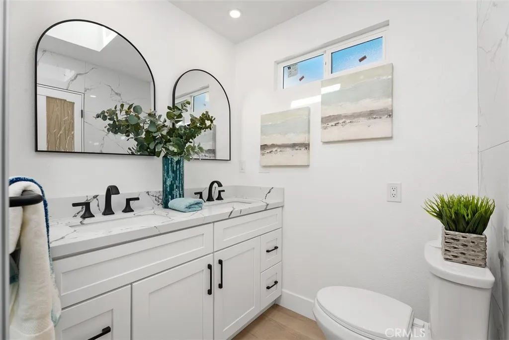 Spectacularly remodeled single-level home on a quiet single-loaded cul-de-sac offers breathtaking mountain and city light views and is completely move-in ready! From the moment you enter through the gated courtyard, youll appreciate the quality and attention to detail throughout this beautiful home. The light and bright kitchen features new Quartz counters, new soft-close wood cabinets, new stainless steel appliances, and a spacious waterfall island with cooktop, microwave and bar seating. The adjacent dining area flows seamlessly into the great room with wood beam ceilings, recessed lighting, and a cozy fireplace. The primary suite offers a private patio and a gorgeous remodeled bathroom with Quartz counters, dual sinks and a walk-in shower. Each secondary bedroom has its own fully remodeled bathroom and views of the lush backyard. Indoor laundry room includes brand new washer and dryer and home has direct access to the 2 car garage. Additional upgrades include new COREtec luxury vinyl plank flooring, new windows, new solid wood doors, fresh paint, new AC, new roof, re-piped and a new tankless water heater. The expansive 7,155 sq ft lot provides exceptional privacy, a lush grassy lawn, two patio areas, and sweeping panoramic views. Located within walking distance to the community pool, pickleball courts, volleyball, basketball, and playground. Just minutes to the beach and harbor, close to excellent schools, and low tax rate this is the perfect place to call home! NOTE: seller plans to expand living room area and increase home size to 1710 sqft and will be re-listing in S