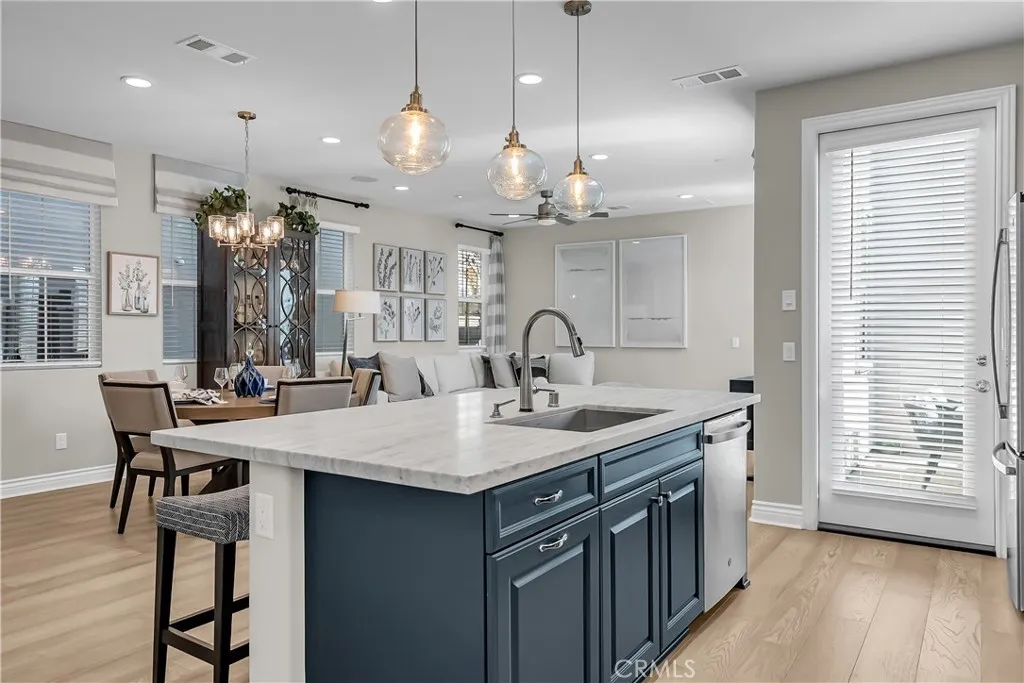 Highland Park Former Model - Designed as the exemplary iteration of the popular Norcroft floor plan, this is not an average production home. The professional interior design elements, along with curated upgrades throughout, enhance this open floor plan that boasts a bedroom and full bath on the first floor. The gourmet kitchen serves as the focal point of the common areas, uniting design and function. Striking deep-blue cabinetry complements the stainless-steel appliance suite, full height backsplash, center island with leather finished marble. The same design theme continues to the butlers pantry/coffee bar and walk in pantry that are conveniently ensconced in an alcove off the kitchen. Just beyond the kitchen, the light-filled family room offers large windows, recessed lighting, and warm wide-plank flooring creating a bright, welcoming atmosphere. Up the custom banister and handrail, the second floor continues to impress. At the terminus of the staircase, a large loft with built in desk awaits. The primary suite sits on the opposite side of the 2nd floor from the secondary bedrooms, allowing for privacy. The primary suite is an opulent affair with a spa-like ensuite bath and walk-in closet. Two more bedrooms and a laundry room(w/sink) complete the second floor. Outside, the home wraps the backyard patio, creating a private courtyard for entertaining or dining. The yard is fully landscaped with turf, trees, ornamental gravel, and a drip system. Value add items such as PAID solar, a whole house fan, 2 car attached garage, and a premium lot make this a must see. Highland Pa