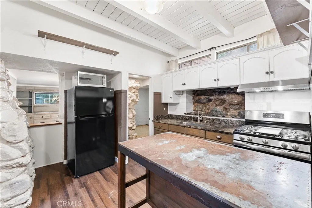 28751 Sycamore Drive, Silverado, CA 92676 is a rustic canyon retreat in the heart of Silverado Canyon, just minutes from Irvine, Foothill Ranch and the 241 Toll Road. Surrounded by mature trees, a seasonal creek and terraced outdoor spaces, this home offers a rare blend of nature, privacy and access to Orange County job centers and amenities. Per the assessor, 28751 Sycamore Drive is recorded as a 2 bedroom, 1 bathroom home. In addition to the two designated bedrooms, the property includes additional finished spaces that can function as a den, home office, studio or extra sleeping quarters, giving buyers flexible options for multi-use living, work-from-home needs or hosting guests. A wood and iron entry gate leads to a welcoming courtyard and elevated front deck with canyon views, a producing orange tree and space for lounging, grilling and outdoor dining. Inside, the main level features a spacious living room with high ceilings, log-style walls, hardwood floors and a wood-burning fireplace that creates a true cabin ambiance. A separate dining area with built-in buffet and stone accent detail connects easily to the remodeled kitchen, which offers white cabinetry, granite counters, an industrial-style center island and an adjacent utility / pantry room with full-size laundry. The main floor bedroom is wrapped in windows and includes a vintage built-in dresser, while the updated main-level bathroom has an exterior door for quick access to the side yard, pet area or garden. Upstairs, the additional finished areas provide multiple layout possibilitiesideal as a den, office, cre