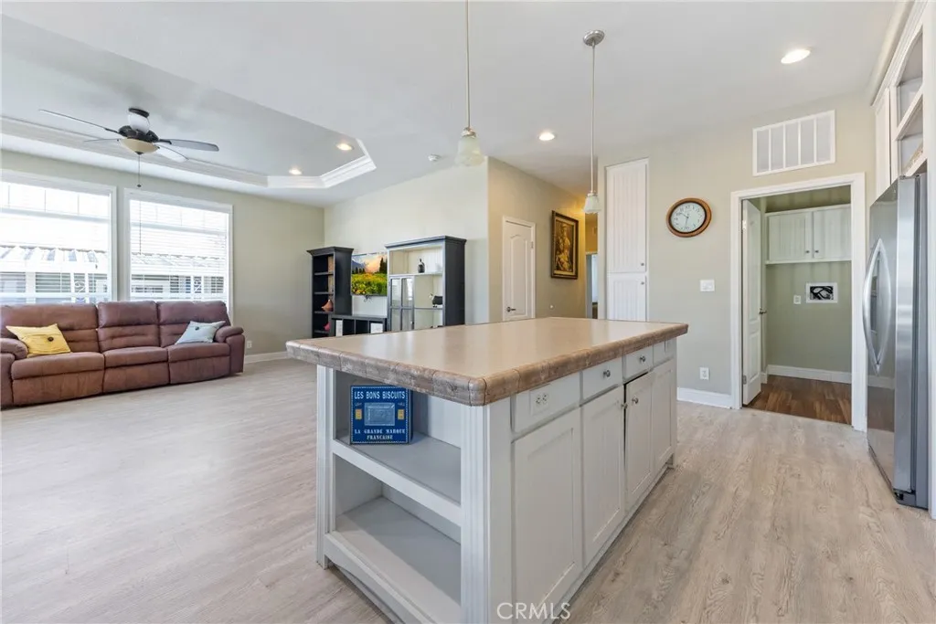 Elegant 3-bedroom, 2-bath manufactured home located in the prestigious Lake Los Serranos 55+ Senior Living Park. This beautifully appointed residence features soaring 9-foot ceilings with tray ceilings and crown moulding, custom designer paint, and upscale laminate vinyl plank flooring, with plush carpeted bedrooms for added comfort. The open-concept kitchen seamlessly connects to the living area and showcases a stylish island ideal for entertaining. Enjoy outdoor living on the expansive front deck, perfectly positioned next to a tranquil open grassy area for added privacy and scenic views. Lake Los Serranos Club is a unique 55+ manufactured home community with 306 spaces set in a serene, park-like setting. The community features scenic greenbelts, lakefront walking paths, open grassy areas, mature trees, fruit trees, and flowering shrubs throughout. Residents enjoy abundant wildlife, including birds, fish, turtles, ducks, and geese, creating a peaceful natural environment ideal for walking or relaxing. Two well-appointed clubhouses offer billiards, ping pong, poker tables, and shuffleboard. An active social club hosts holiday events, exercise classes, card games, Bunco, and Bingo. Lake Los Serranos Club offers a true community lifestyle surrounded by nature.