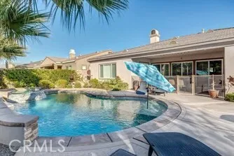 Located in a gated community north of I-10 at Golf Club Drive, this Marquese Plan residence offers exceptional desert living with a private pool and spa. Just one block from the lake, residents enjoy scenic walking trails, catch-and-release fishing, electric-powered boating, and stunning mountain views. The home features three bedrooms and three baths, including two spacious primary suites. The well-designed kitchen offers abundant counter and storage space, highlighted by a wide granite countertop with seating for four, and opens to a dining area with plantation-shuttered doors leading to the poolside patio with fireplace and built-in grill, ideal for entertaining. The living room is anchored by a gas fireplace and framed by shuttered windows and doors overlooking the pool and spa. The primary suite includes a walk-in closet and a spa-inspired bath with dual sinks, a jetted soaking tub, and a separate shower. Offered turnkey furnished, this thoughtfully appointed home is set within a wonderful community and ready to enjoy.