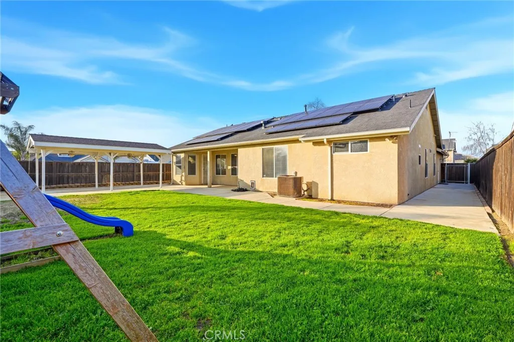Welcome to this beautifully maintained 3-bedroom, 2-bath home offering 1,868 sq ft of thoughtfully designed living space on a desirable corner lot in Northwest Hanford within the Pioneer School District. This 3-car garage stunner features owned solar, providing long-term energy savings and efficiency. While this home is thoughtfully ADA-equipped, don't be fooled---it shows just like a beautifully remodeled home that any family will love. The upgrades blend seamlessly into the design, creating a modern, stylish, and highly functional living space. This single-level, ADA-compliant home offers exceptional wheelchair-friendly features, including modified countertops, wide access areas, and an ADA-equipped shower with soaking tub. The spacious primary suite includes a rare additional office or sitting area, creating a perfect retreat for work or relaxation. Inside, you'll find a large living room with laminate wood flooring and a cozy fireplace, complemented by newer carpet and fresh interior paint. The generous dining room/flex space offers versatility for entertaining, home office use, or multi-purpose living. Step outside to enjoy the covered patio and grassy backyard, ideal for gatherings, play, or peaceful evenings. With its thoughtful layout, accessibility upgrades, and prime location, this home is truly a dream. Don't miss this rare opportunity to be in an excellent North West Hanford neighborhood. Schedule your private showing today. Bed count differs from tax records. Buyer to verify if important.
