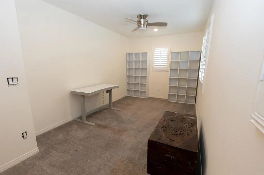 OWNED SOLAR & AN INCREDIBLY LARGE BACKYARD!!! Stunning 2022 newer construction home in the desirable Prairie Crossing community. This 4-bedroom, 3-full bath home features a sought-after downstairs bedroom and full bath, plus an upstairs loft perfect for a second living area, playroom, or media space. The oversized primary suite features two walk-in closets, while two large secondary bedrooms also feature walk-in closetsperfect for kids, guests, or multi-generational living. Designed for modern family living, the home includes a laundry room located upstairs, right near the bedroomsmaking laundry day easier and keeping the main living areas clutter-free. The open-concept layout flows into a large backyard with endless potential for entertaining and outdoor living. The backyard is designed for enjoyment and entertaining, featuring a covered patio with ceiling fans that provides shade and comfort, plus plenty of space to create your dream oasis-ready for a possible pool, custom entertaining area, gardening, possible ADU, and hosting family and friends. A unique bonus is the converted single car garage office with a private entrance and dedicated A/Cideal for remote work or a home businesswhile the remaining garage space still offers parking for two additional cars and storage. Enjoy energy savings with OWNED SOLAR PANELS and added elegance with plantation shutters throughout. Conveniently located close to shopping, schools, and everyday amenities, this move-in-ready home offers space, flexibility, and modern comfort all in one. Close to parks, tennis courts, pickleball courts,