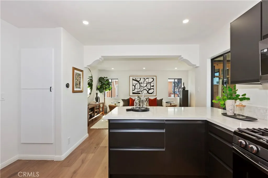 Tucked away on a quiet residential street in the heart of Burbank, this thoughtfully reimagined home welcomes you with a sense of calm the moment you arrive. Subtle water features, clean architectural lines, and intentional landscaping set the tone for what unfolds inside a residence transformed into a serene, modern retreat years in the making. The single-story layout flows effortlessly, blending warmth and sophistication with contemporary design. Wide-plank engineered hardwood floors, abundant natural light, and custom solid wood doors create continuity and texture throughout. The welcoming living room opens seamlessly into a designer kitchen where quartz countertops, dark stainless steel appliances, and an open-concept layout invite both everyday living and effortless entertaining. At the heart of the home, indoor-outdoor living takes center stage. French doors from the expansive den open to a beautifully curated backyard, allowing light, air, and nature to become part of daily life. This flexible second living space serves as a tranquil lounge, creative retreat, or gathering area always connected to the outdoors. The backyard itself feels like a private sanctuary, designed with intention and flow. A custom pergola lounge, modern hardscape, layered seating areas, and low-maintenance landscaping create a resort-inspired setting ideal for hosting or unwinding. Every detail reflects a calm, organic aesthetic and a commitment to effortless living. Three spacious bedrooms offer comfort and versatility, while spa-inspired bathrooms showcase refined tile work and a soothing,