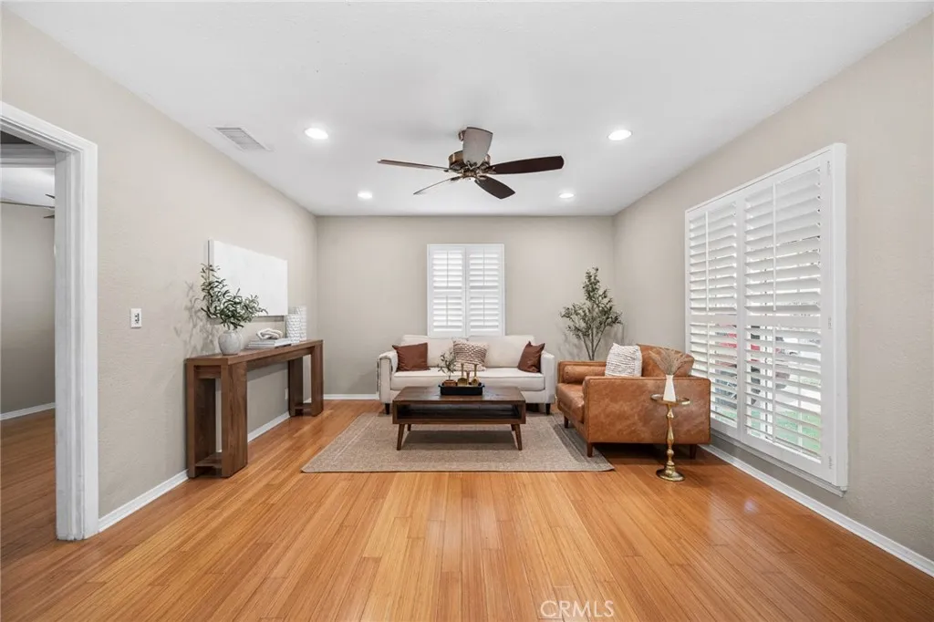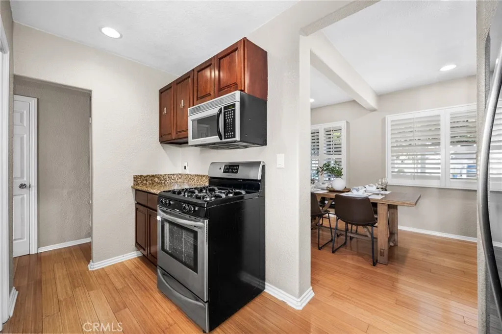 Welcome home! This stunning residence truly has it all comfort, style, and a sense of place that invites you to settle in and start enjoying life from the moment you arrive. Tastefully remodeled, this home is designed for those who appreciate quality craftsmanship and thoughtful details throughout. As you step through the front door, you are greeted by a spacious, open-concept living and dining area filled with natural light streaming through dual-pane windows adorned with elegant 4-inch plantation shutters. The warmth of gorgeous bamboo wood flooring flows throughout, creating a seamless sense of harmony and sophistication. The kitchen is the centerpiece of the home upgraded with upscale cabinetry, gleaming granite countertops, and stainless steel appliances that make both everyday meals and entertaining a joy. The three generously sized bedrooms offer comfort and versatility, each providing easy access to a beautifully updated full bathroom. Stepping outside, youll discover a backyard designed for relaxation and entertainment. With lush grass, vibrant landscaping, and a large covered patio, the space is perfect for weekend gatherings, morning coffee, or quiet evenings under the stars. Two separate doors connect the indoors with this inviting outdoor retreat, creating a natural flow for gatherings and daily living. Even the garage has been transformed into a pristine space, refinished from floor to ceiling with a clean laundry area and extra storage available in the attic. Modern updates such as central air and heat, recessed lighting, and fresh paneled doors with update