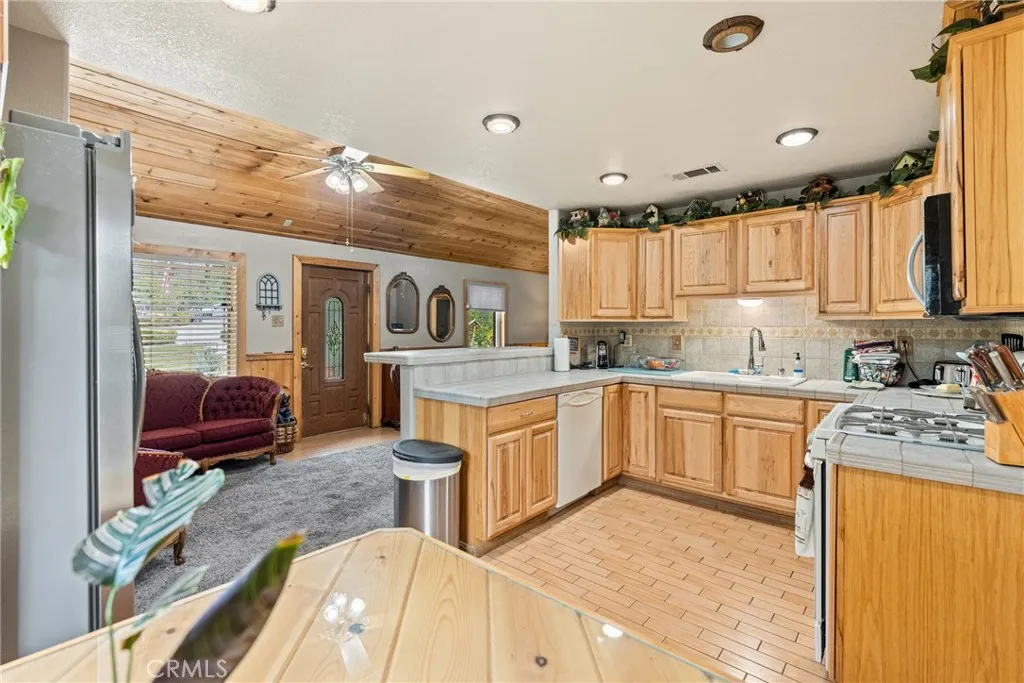 ADU & Income Potential! Tucked away on a private street in the desirable Cherry Valley area, this truly rare and unique property feels like your own mountain retreat, one you must see to fully appreciate! This 3-bedroom, 2-bath home (bonus room currently used as a third bedroom) features a rustic aesthetic with natural cedar wood and stone throughout. The interior is defined by the rich warmth of cedar, showcased across vaulted ceilings and hand-crafted framing that carries through the entire floor plan. At the heart of the open living space is a cozy central stone fireplace, creating the perfect gathering spot. The kitchen offers plenty of storage with a kitchenette, a deep pantry, and a separate dining area. A versatile back area with French doors provides an ideal space for a home office or family room, along with the convenience of an indoor laundry area and full bath. Outside, the landscaping creates a year-round sanctuary with mature trees, fruit trees, and a tranquil koi pond complete with koi fish, all on a large lot of 21,780 sq ft flat lot, this property is a prime candidate for an ADU (Accessory Dwelling Unit) or Junior ADU conversion. For those needing space, the property includes 53-foot and 40-foot storage trailers for secure, weatherproof storage, one equipped with electric and water connections, plus an oversized RV carport metal building ready for all your storage and recreational needs. This is a rare opportunity at an affordable price, dont miss it!