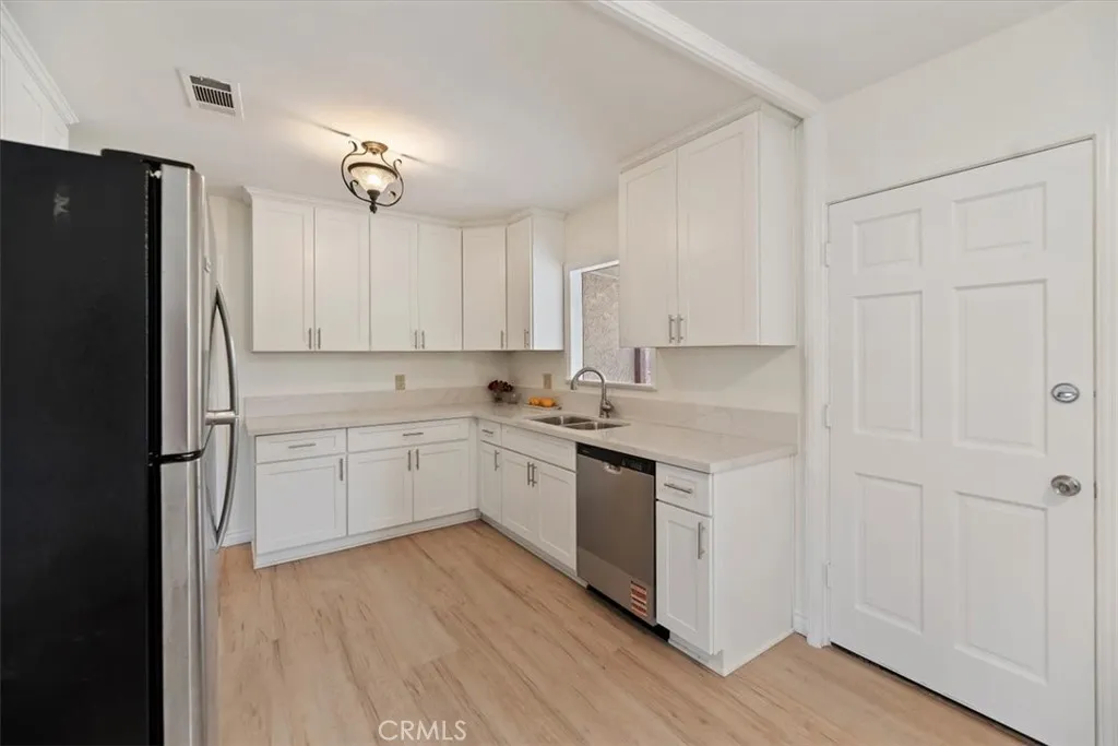 This beautiful home is move in ready with new exterior and interior paint; upgraded kitchen & bath; new carpeting in living room, dining area and two bedrooms. The sparkling bathroom has a separate tub and a separate shower and a vanity. The bright remodeled kitchen has new white counters and cupboards with self-closing drawers. Automatic sprinklers front and back. Great curb appeal. The garage is a 2-car attached garage with rollup door. The garage might be a good option and consideration for a conversion to an ADU (Accessory Dwelling Unit). This is a fantastic opportunity for a first-time buyer to own a well-maintained 1950's home with two bedrooms; and a spacious yard. This home offers close freeway access and is close to schools, shopping, medical facilities and minutes away from two major golf courses. Metrolink commuter rail is within 7 miles. Don't miss out on this property. NOT FOR RENT OR LEASE.