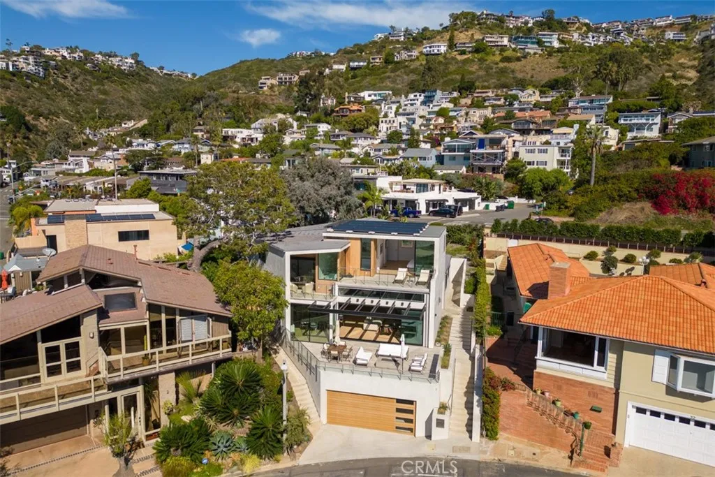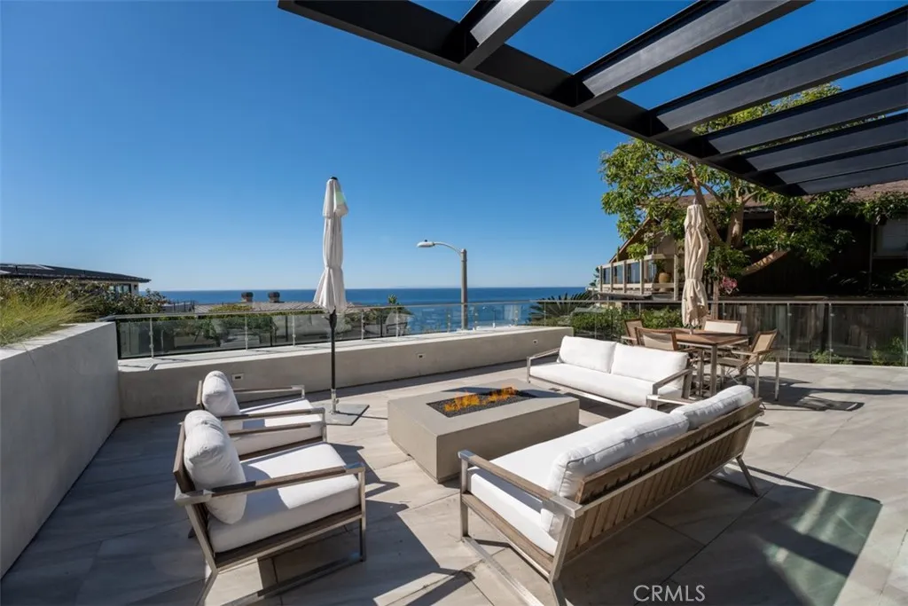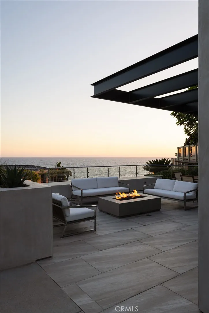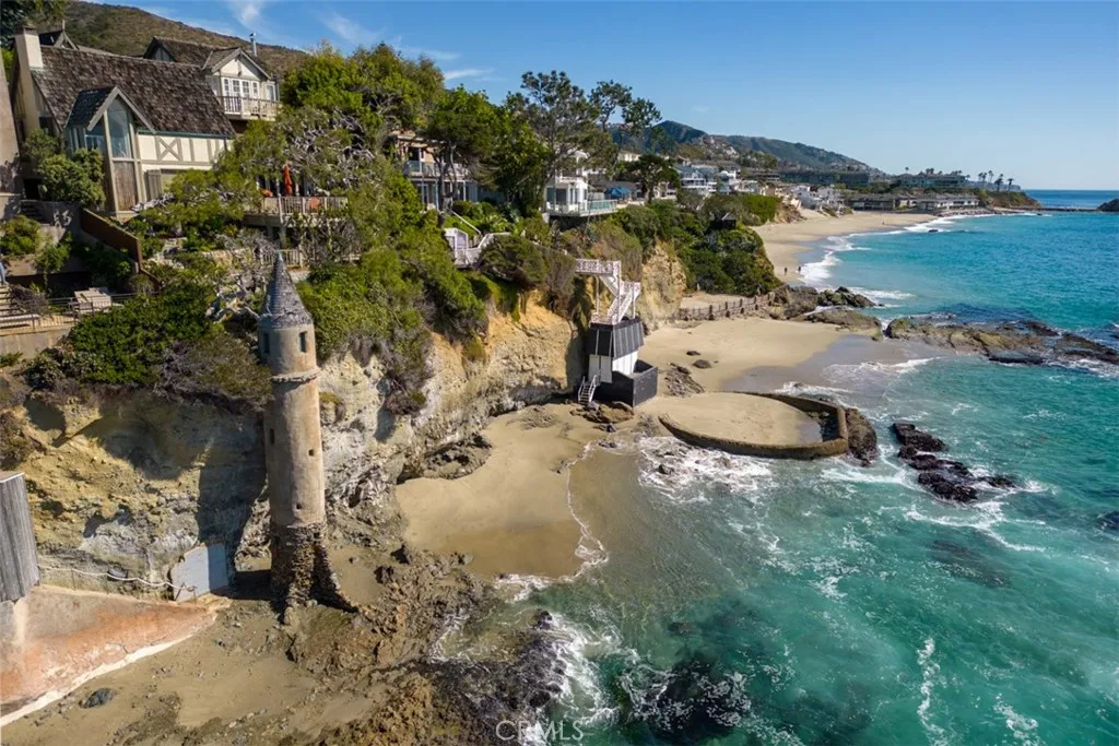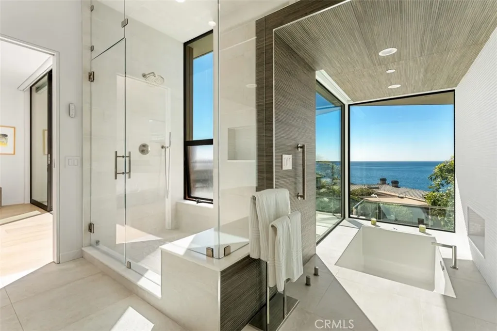 See and hear the waves from this stunning modern architectural home on the ocean side of the Pacific Coast Highway (completed in 2023), which epitomizes coastal elegance and ultimate beach living behind the secured gates of the exclusive Lagunita community in Laguna Beach. Just steps down a private road and private stairway to beautiful Victoria Beach, this 4 bed, 5 bath 3,596 SF residence is thoughtfully designed to maximize natural light and to take advantage of the breathtaking Catalina Island views and sunsets.. Neutral and warm tones used throughout this home accentuate the open floor plan where the kitchen, formal living, and dining areas all lead to an expansive front deck with seating and firepit facing the spectacular ocean views. Great for entertaining, the chef's kitchen features Taj Mahal quartzite countertops, Eggersmann (German) custom cabinetry, and state-of-the-art SubZero/Wolf appliances - including coffee maker, 48" refrigerator, six-burner 48" range, wine fridge, steam and conventional ovens. The main level also includes two guest bedrooms with ensuite baths, a back deck with spa & sauna where you can enjoy your favorite music, entry to the backyard, and an off the kitchen outdoor patio with built-in Wolf BBQ and refrigerator. Up the floating staircase are soaring architectural ceilings and windows that flood the whole home with natural light. Upstairs includes the master bedroom which offers its own private balcony with panoramic 180-degree ocean views, a spacious closet, as well as a genuinely spa-like bathroom with steam shower & soaking tub (both with