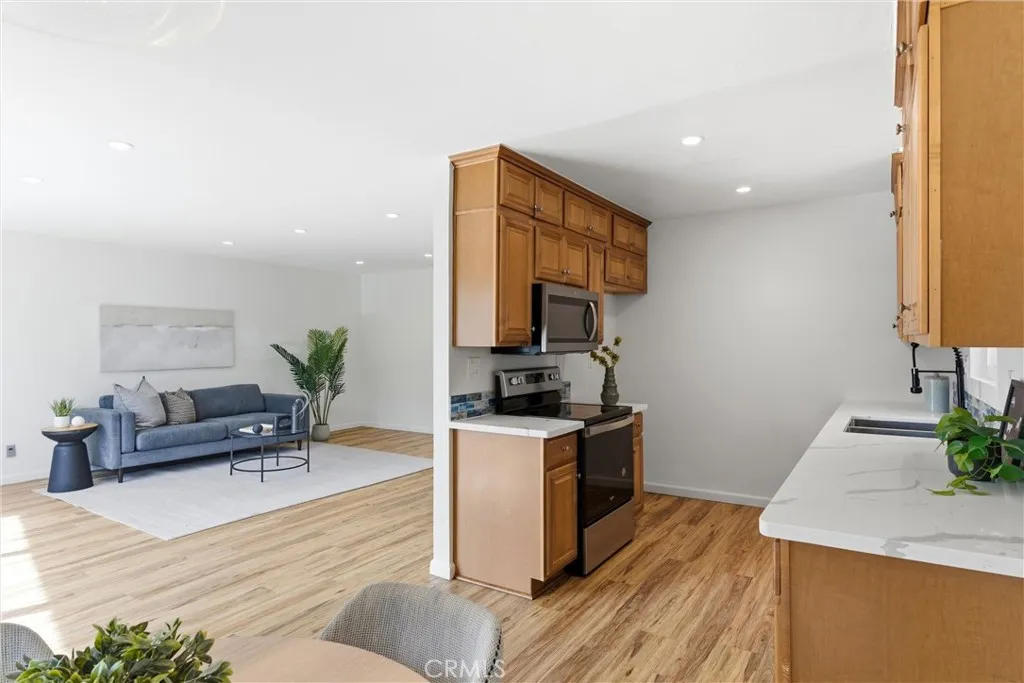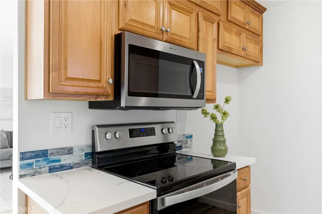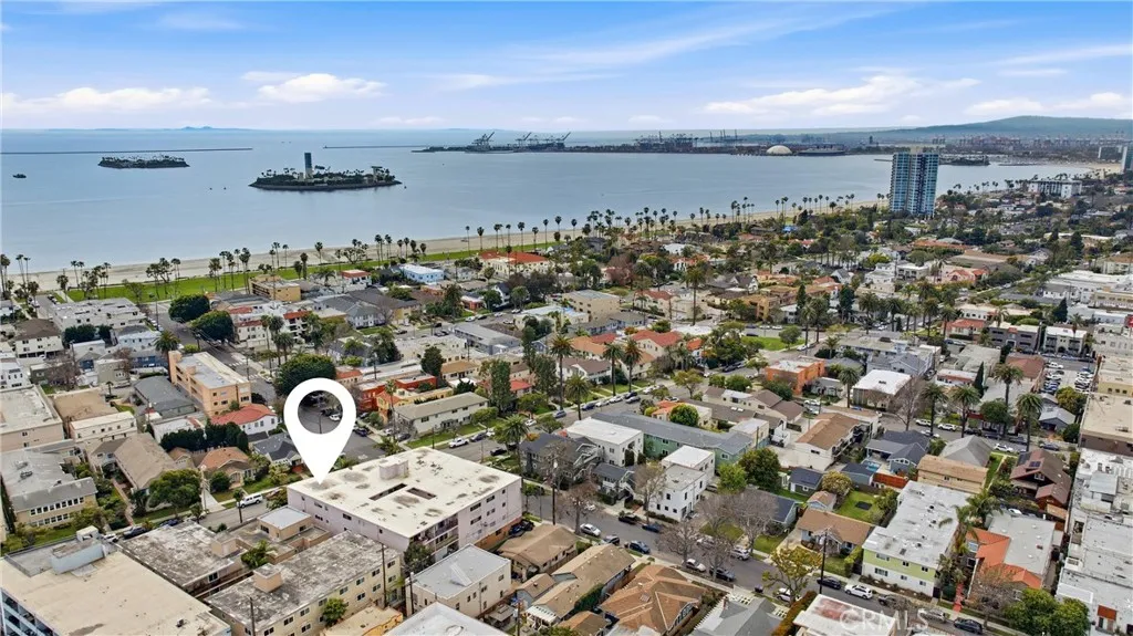 Imagine a life of sunshine, gentle breezes, swaying palm trees, waves cresting, and breaking on the shore. Awake to the knowledge that you are living your best life just two blocks from the Pacific Ocean. Welcome to the historic Belmont Heights enclave, a very walkable neighborhood with a strong community feel, close to Bluff Park and Junipero Beach. Nearby Belmont Shore, with its shops, restaurants and cafes offers a lifestyle of ease and comfort. Now, open the door to 3609 East 2nd Street #207. Cross the threshold. Step inside. That smile is your assurance of the good times to come. The foyer features an expanse of mirrored closet doors. Keep stepping. The view that beckons is the reward of living on the second floor overlooking the city life below. Floor to ceiling walls of glass doors slide open with an invitation to sip morning java on the balcony or appreciate the glittering lights in the nighttime sky. Natural light fills every space and illuminates the gleaming, wood laminate floors to glide your partner to experience the joys of art, music and literature in the spacious living area. Raise a glass and celebrate your good fortune with every tasty meal in the dining nook adjoining the kitchen. Expansive white, marble countertops with custom design, blue backsplash, abundant cabinets, all new (2023)Whirlpool appliances, including a self-cleaning electric range, built-in stainless steel microwave, and a stainless steel, top control, dishwasher are highlights of the kitchen. Every Queen deserves a royal lair. The private quarters offer nocturnal serenity in the primary b