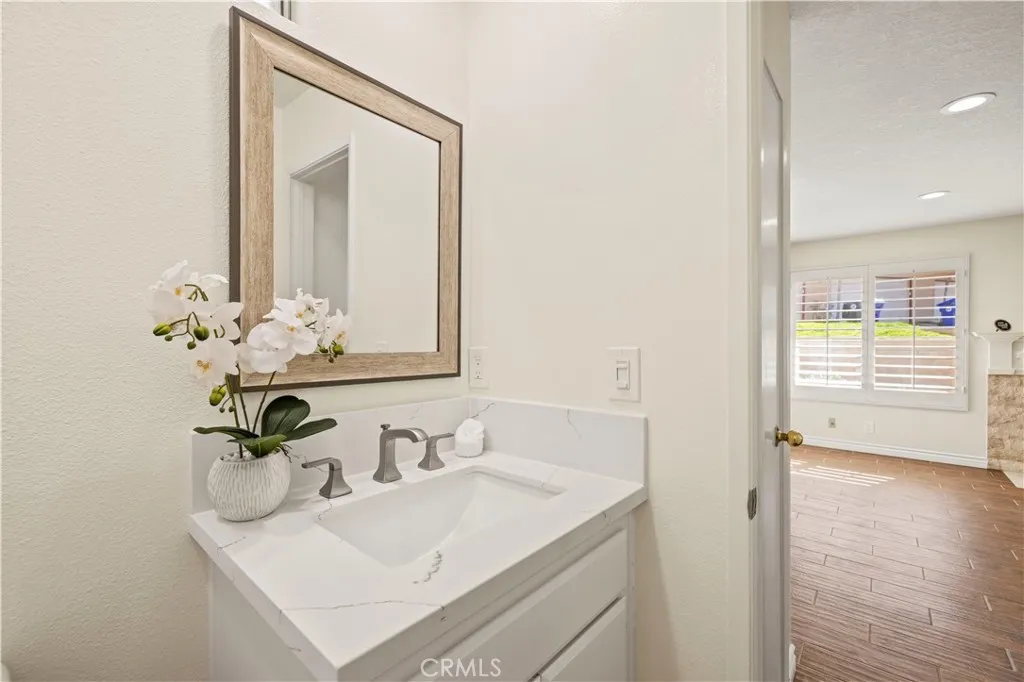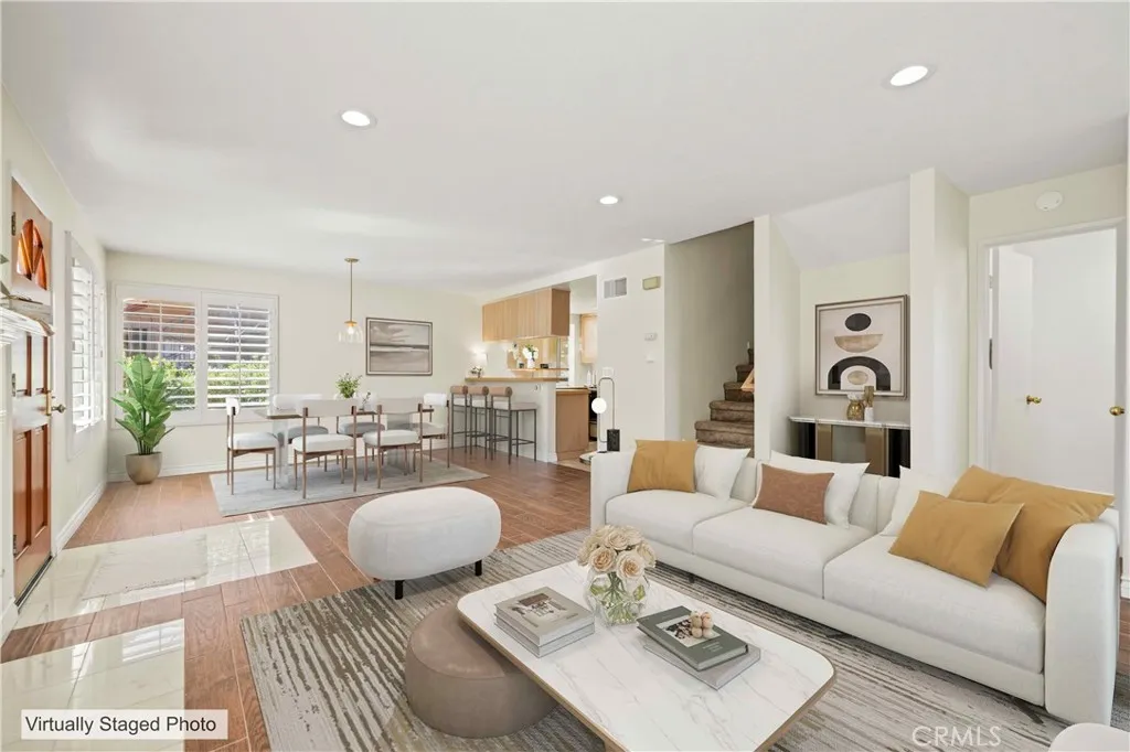 Welcome home to this beautifully updated two-story 2-bedroom, 2.5 -bath residence located within the quiet, private, gated Mountainview Villas community, surrounded by mature, lush green trees that create a serene, park-like setting. Thoughtfully refreshed throughout, this home blends comfort, functionality, and understated style while offering a peaceful retreat in one of the areas most desirable neighborhoods. The main level features an open living and dining area filled with abundant natural light from large windows, complemented by recessed lighting throughout the main level for a bright, modern feel. Wood-look tile flooring downstairs, fresh interior paint, and updated finishes create a clean, contemporary aesthetic. A cozy fireplace with a beautiful stone surround anchors the living space, making it ideal for everyday living or relaxing evenings at home. Custom wood interior shutters throughout enhance privacy and timeless appeal. The kitchen opens seamlessly to the dining area, perfect for entertaining and daily living. This functional space offers ample cabinetry, generous counter space, and a practical layout featuring a gas stove, built-in microwave, and dishwasher. A bright kitchen window adds to the homes light and airy feel. A convenient powder room on the main level includes a discreet peekaboo door leading to under-stair storage, providing valuable additional organization. A whole house fan paired with a brand-new air-conditioning system helps keep the home cool and comfortable year-round. Enjoy the charming front porch, ideal for morning coffee or unwinding