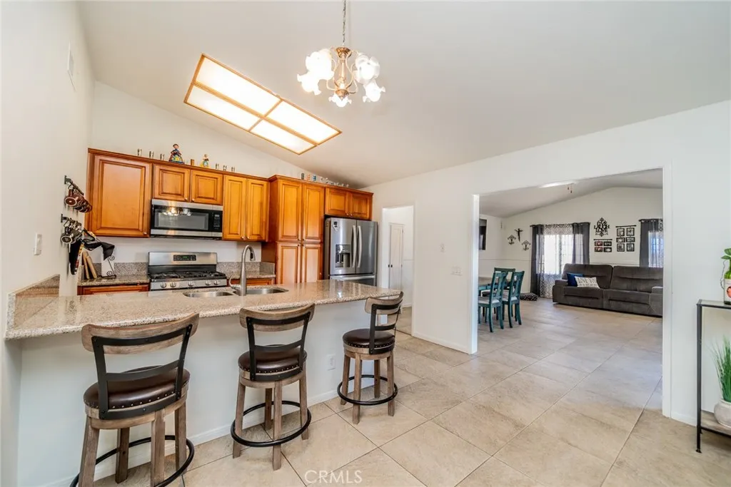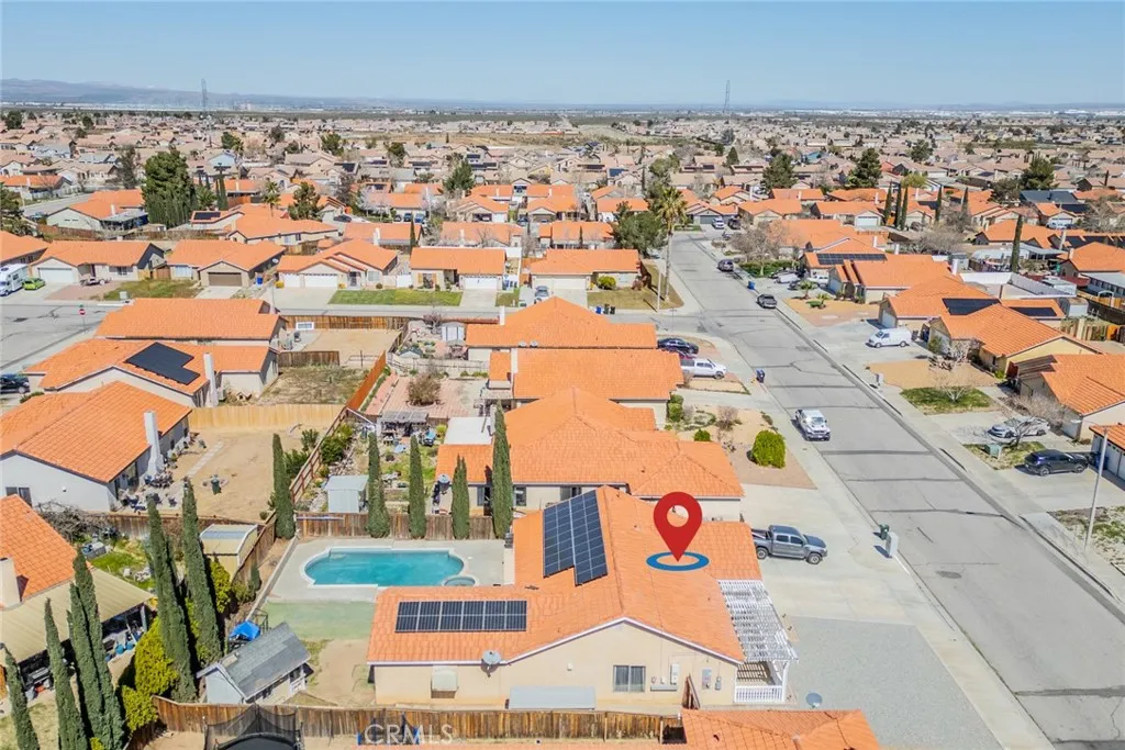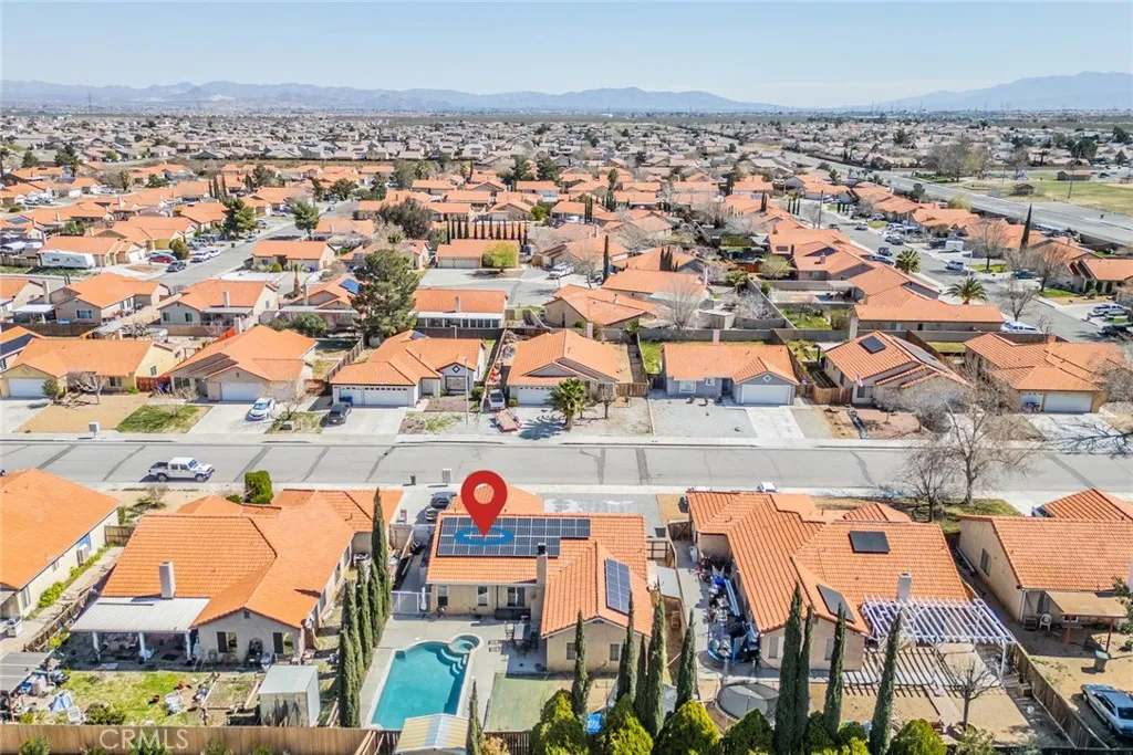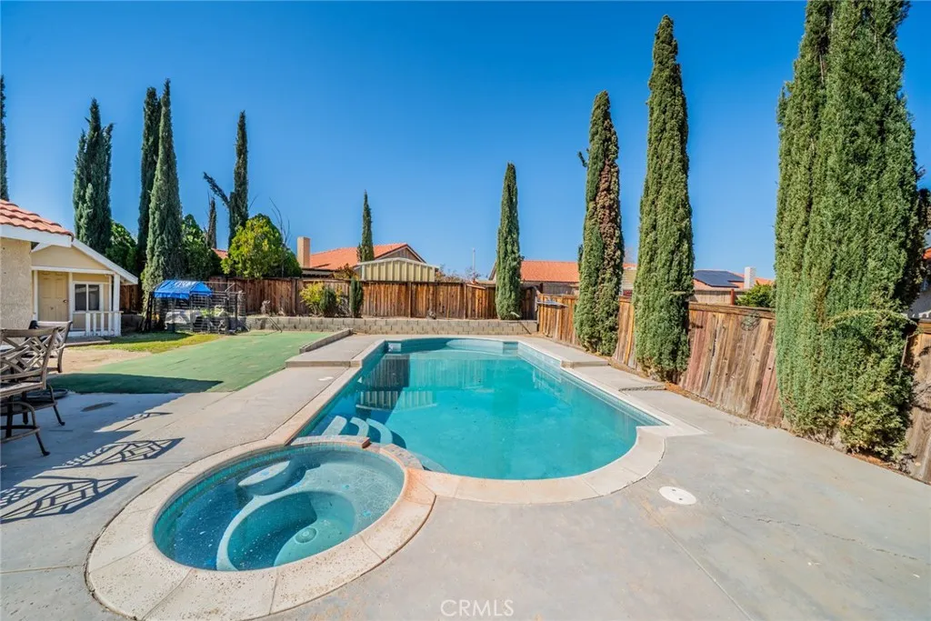 Come have fun in the desert sun at this beautiful 3-bedroom, 2-bath sparkling pool home offering space, comfort, and fantastic entertaining potential. A Spanish tile roof and welcoming pergola greet you at the entrance, creating a warm first impression. Inside, youll find gorgeous tile flooring throughout the main living areas, carpeted bedrooms, vaulted ceilings, and a bright open floor plan connecting the entry, living room, dining area, and kitchen. The living room features a charming brick fireplace, perfect for cozy mornings, relaxing evenings, and family gatherings. The kitchen offers granite countertops and a convenient breakfast counter. An extra special feature is the approx. 400 sq. ft. bonus/game room with backyard accessideal for watching the big game, playing billiards, or even creating a potential ADU for extended family or added income. Step outside to enjoy plenty of patio space for gatherings, barbecues, and pool parties, along with a sparkling heated in-ground pool and spa. The yard also features a grassy area and an adorable playhouse that can double as storage. Conveniently within walking distance to a school and park, plus RV parking, a two-car garage, and an assumable solar system to help save on energy costs. Come see for yourselfschedule your private showing today!!! Sellers are ready to move!