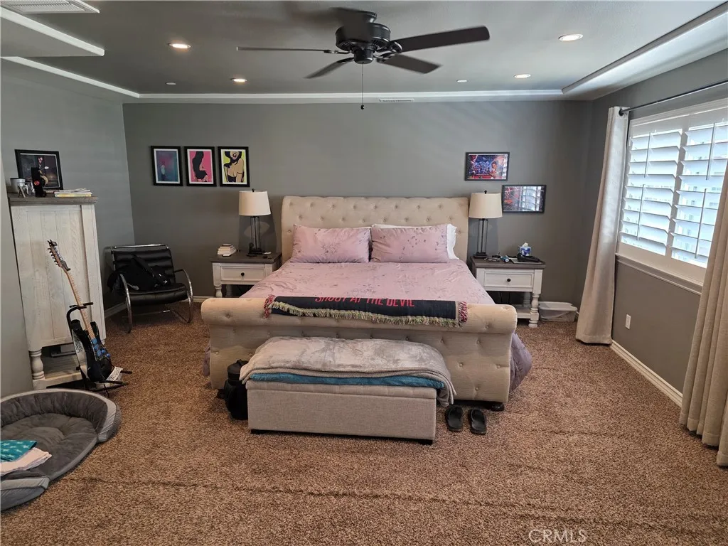 Nestled within the prestigious gated community of Shady Trails in North Fontana, this beautifully maintained 5-bedroom, 3-bathroom residence offers 4,121 square feet of refined living space designed for both comfort and entertaining. Situated on a quiet cul-de-sac with an impressive 90-foot-long driveway and a spacious 2-car garage with a new tankless water heater, the home delivers exceptional curb appeal and privacy. Inside, youll find expansive living areas, generously sized bedrooms, and thoughtful upgrades throughout. The newly renovated kitchen serves as the heart of the home, featuring an impressive 8-burner stove, double oven, abundant cabinetry, and modern finishesperfect for hosting gatherings or preparing gourmet meals. The downstairs bathroom has also been tastefully renovated, adding convenience and style for guests and multi-generational living. Upstairs, the spacious primary suite offers a private retreat complete with dual walk-in closet and updated shutters that enhance both elegance and energy efficiency. New shutters also accent the kitchen, complementing the homes bright and airy feel. Step outside to a landscaped backyard featuring mature citrus trees, a covered patio, and a dedicated BBQ areaideal for outdoor dining and year-round entertaining. Additional highlights include three separate air conditioning units for optimal climate control and energy-saving solar panels. Residents of Shady Trails enjoy resort-style amenities including a community clubhouse, large swimming pool, jacuzzi, tennis and pickleball courtscreating an exceptional lifestyle oppor
