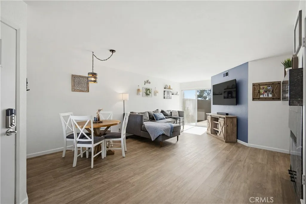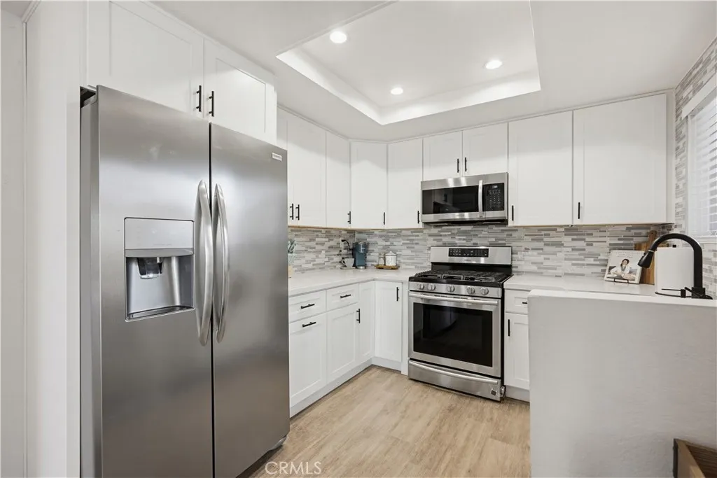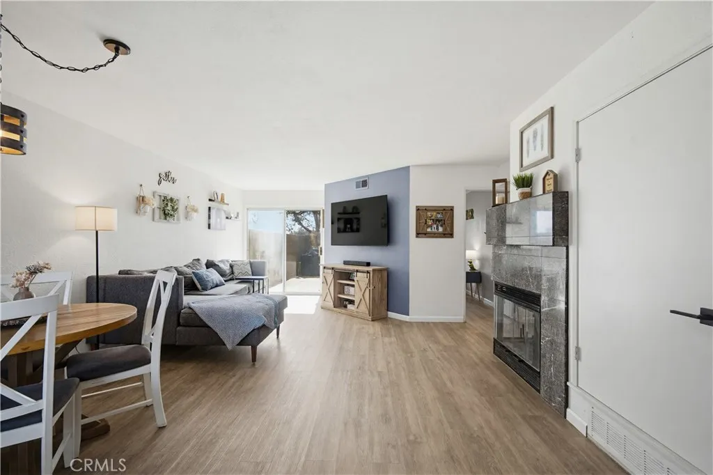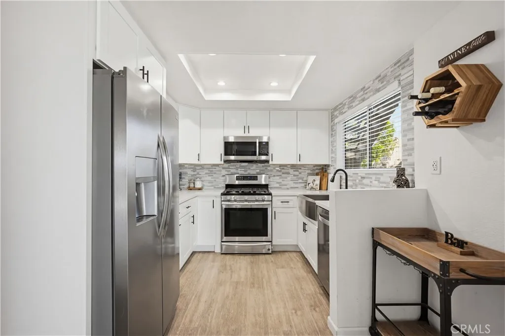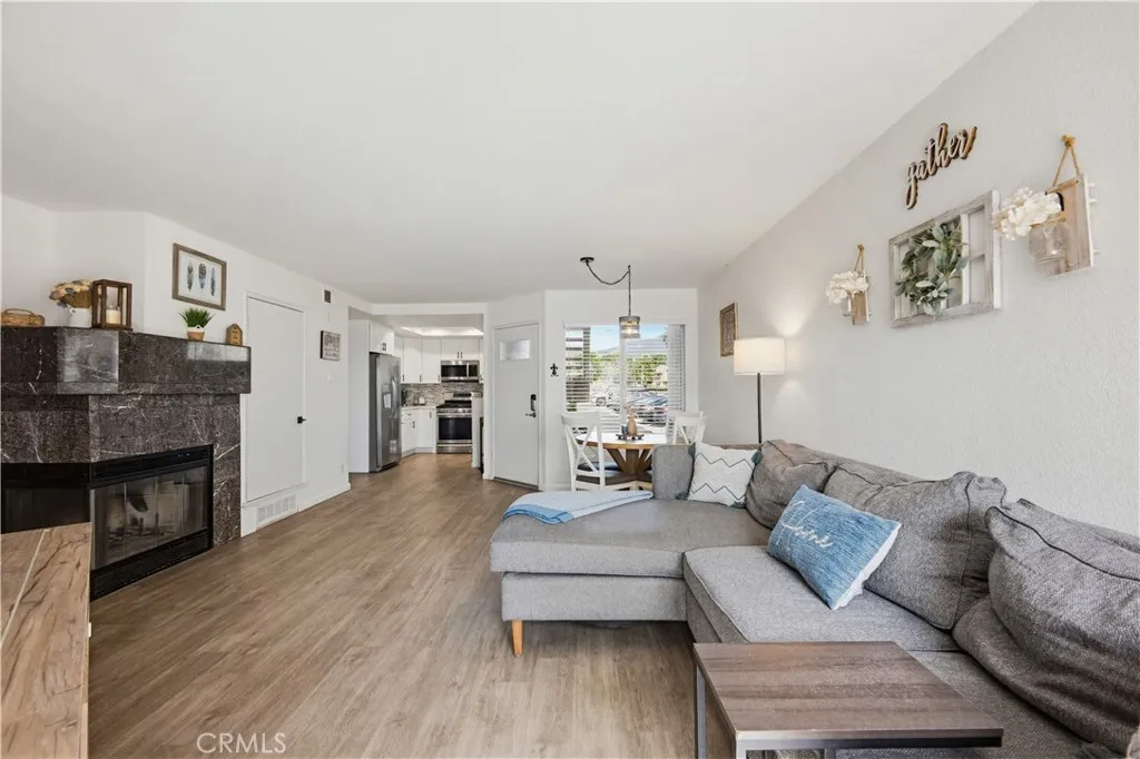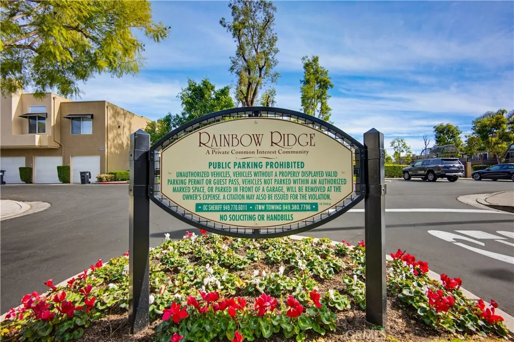 Blessed with a prime location perched high at the edge of the community, situated on a greenbelt taking full advantage of gorgeous city lights, hills, and vibrant sunset views, this beautifully updated home, in the desirable Rainbow Ridge community, is conveniently located within walking distance of Trabuco Hills Center and Portola Plaza with numerous shopping and dining venues. Step inside and soak in the light filled interior with sleek Luxury Vinyl Plank Flooring throughout and an open-concept, single level, floor plan setting the stage for an ideal living space. The elegant fireplace with Granite surround in the living area creates an inviting gathering space for dining and relaxing with loved ones. Sliding doors open to the private back patio providing a superb indoor-outdoor living space to enjoy the gorgeous views. The sparkling updated kitchen has been beautifully remodeled with glass tile backsplash, Quartz countertops, timeless white Shaker cabinetry, updated hardware and pulls, deep stainless-steel sink, and stainless-steel appliances. The primary bedroom suite is a peaceful retreat with sit down views and a gorgeous, remodeled Quartz-topped vanity with sink, updated cabinetry and pulls, sleek fixtures, framed vanity mirrors, and a walk-in closet. Space-saving barn doors provide direct access to the full bathroom, thoughtfully updated mirroring the same gorgeous Quartz topped vanity, cabinetry, and fixtures, creating a well-designed flow throughout the home. The secondary bedroom is filled with natural light and has the same gorgeous backyard views. The private w
