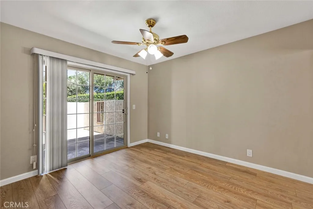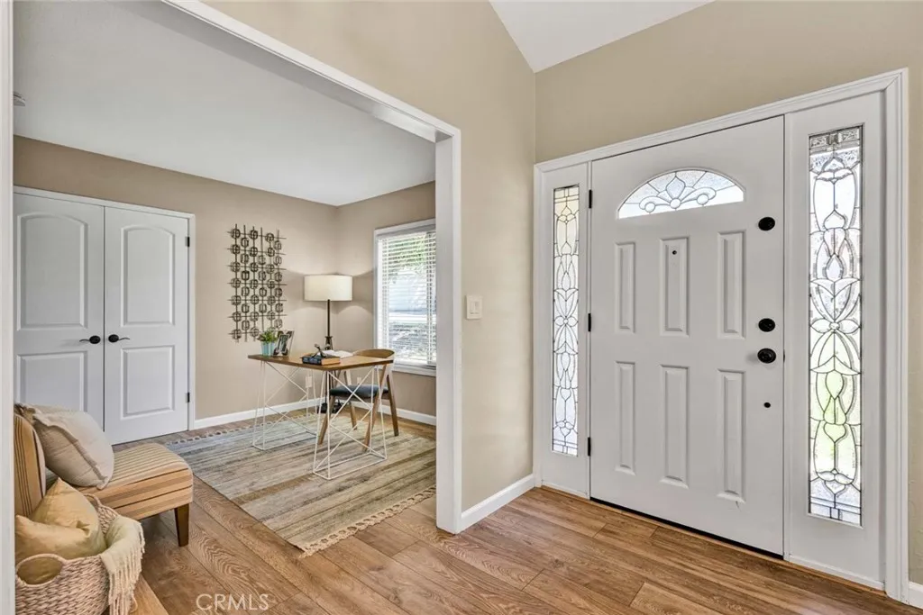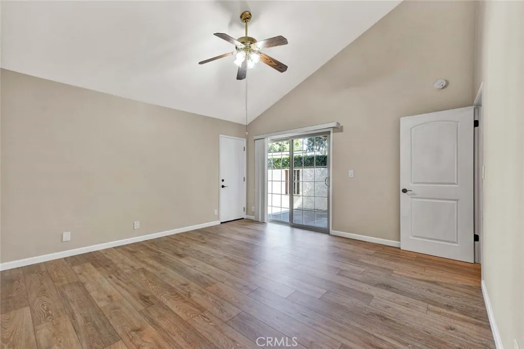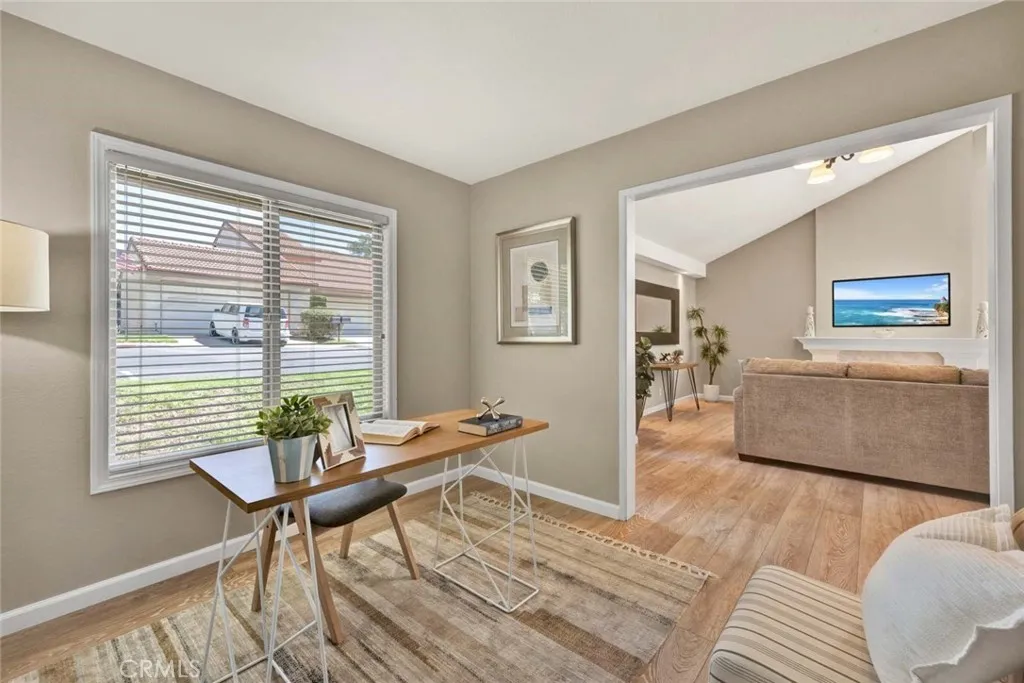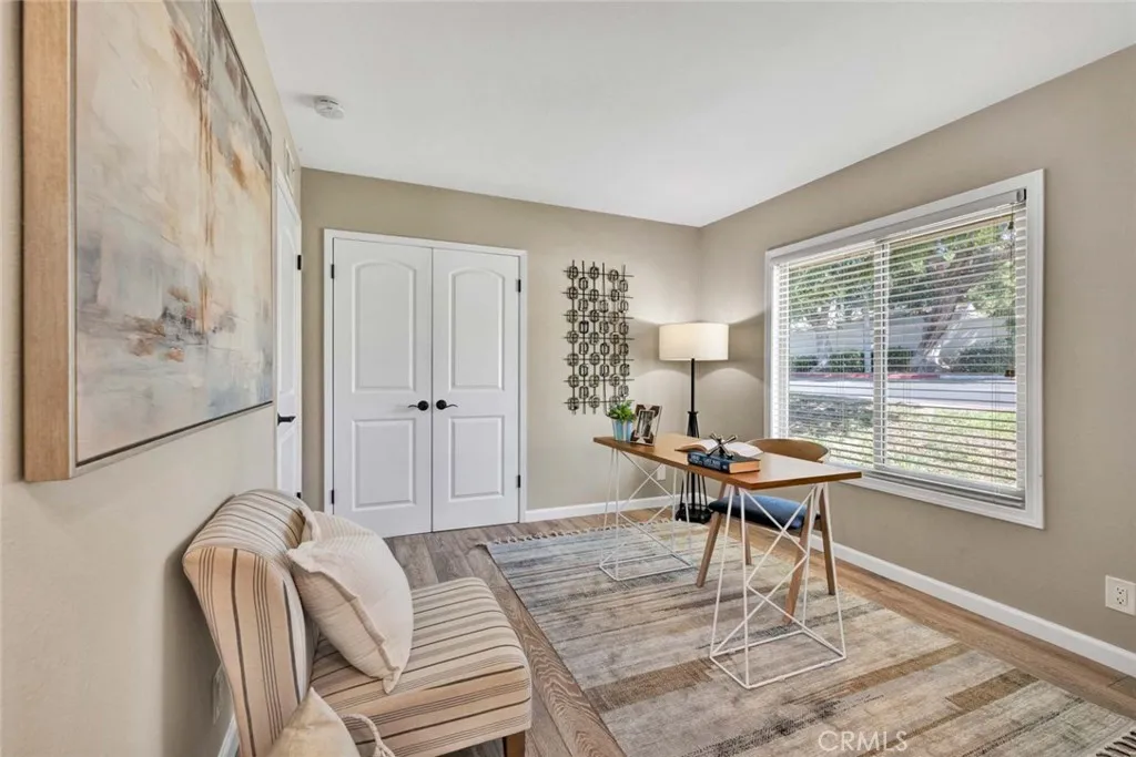 Tastefully updated and meticulously maintained, this 3-bedroom, 2-bath single-story end-unit in the desirable Springhurst townhomes could be the one youve been waiting for. From the moment you arrive, subtle elegance sets the tonebeginning at the six-panel front door accented with leaded glass, opening to a light-filled living room with soaring beamed cathedral ceilings, a marble-trimmed fireplace, recessed lighting, and sleek laminate flooring. The open flow continues into the dining area and beautifully remodeled kitchen, thoughtfully designed with a breakfast bar, walk-in pantry, granite countertops, abundant cabinetry, gas cooktop, microwave, dishwasher, refrigerator, and a built-in buffet offering extended storage along the wall. Sliding glass doors lead to a private patio, complete with planters ready for your personal touch. The third bedroom has been opened to create a versatile alcove off the living roomideal for a home office, playroom, or creative space. A fully remodeled bathroom adds both style and convenience. The spacious primary suite features a large shower, vanity area, generous walk-in closet, and direct access to the garage with laundry. Both the primary suite and secondary bedroom open to a second private patio, creating a seamless indoor-outdoor feel. The attached two-car garage is enhanced with epoxy flooring, built-in cabinetry, and attic storage via a pull-down ladder. Additional highlights include central air conditioning, dual-pane windows, and a newer water heater. Residents of Springhurst enjoy access to a pool, spa, clubhouse, RV parking, and a