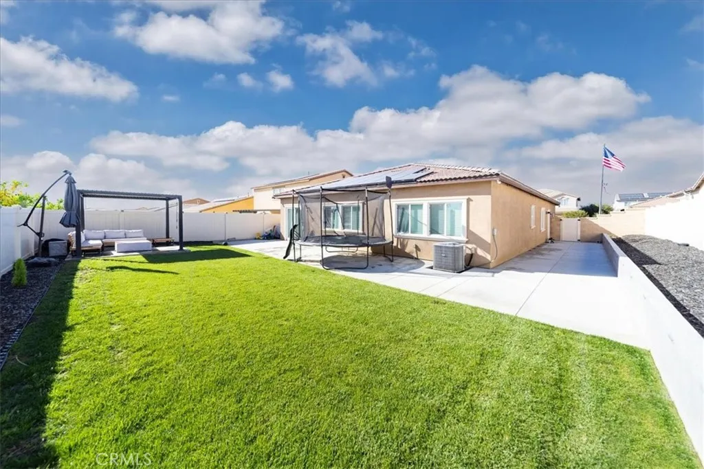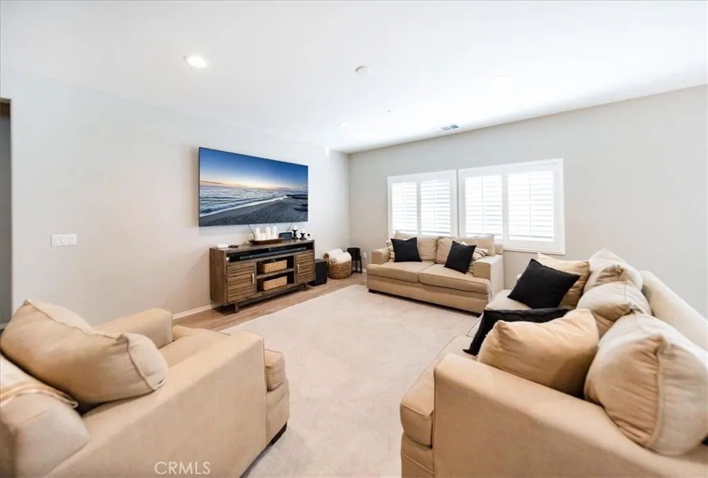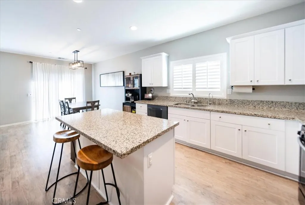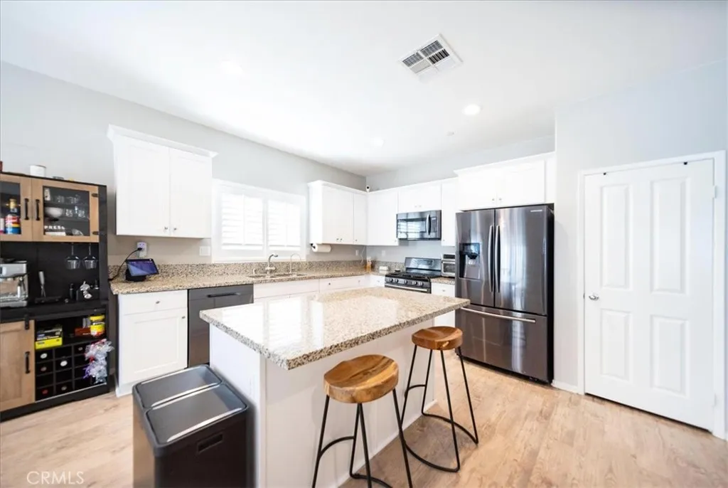 Nestled among the gently rolling foothills of Menifee, the beautiful Crescent Pointe community offers thoughtfully designed homes with quality craftsmanship and modern efficiency. Residents enjoy convenient access to nearby shopping, dining, and entertainment while enjoying the peace and scenery of this desirable neighborhood. This beautiful single-story home features 4 bedrooms and 2 bathrooms with an open layout, high ceilings, and upgraded luxury vinyl plank flooring throughout the main living areas. The kitchen is designed for both style and function, showcasing Crema Atlantico granite countertops, sleek 36-inch white cabinetry, a large center island, spacious pantry, and a full suite of Samsung appliances. Several bedrooms have been thoughtfully enhanced including newly installed ceiling lights with adjustable white to warm lighting tones, upgraded closet space, custom blinds, and even a built-in childrens chalkboard feature. Another bedroom has been transformed into a stylish office or flex space with beautiful custom wood barn doors, a custom wood-and-steel built-in desk, upgraded closet, and plantation shutters. The spacious primary suite offers a relaxing retreat with window blinds, a modern vanity light fixture, and a bathroom featuring an upgraded dual shower head and enhanced ventilation with an upgraded central exhaust fan system. Step outside to a truly impressive outdoor living space designed for both relaxation and entertaining. The backyard has been professionally landscaped with a large lawn area, full sprinkler and drip irrigation systems, and a spacious
