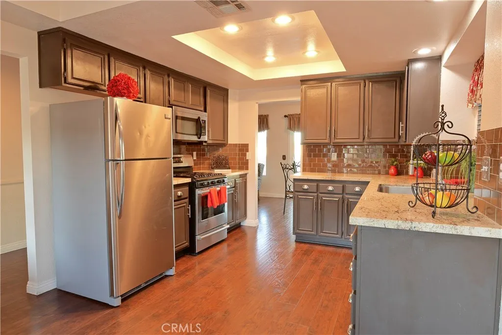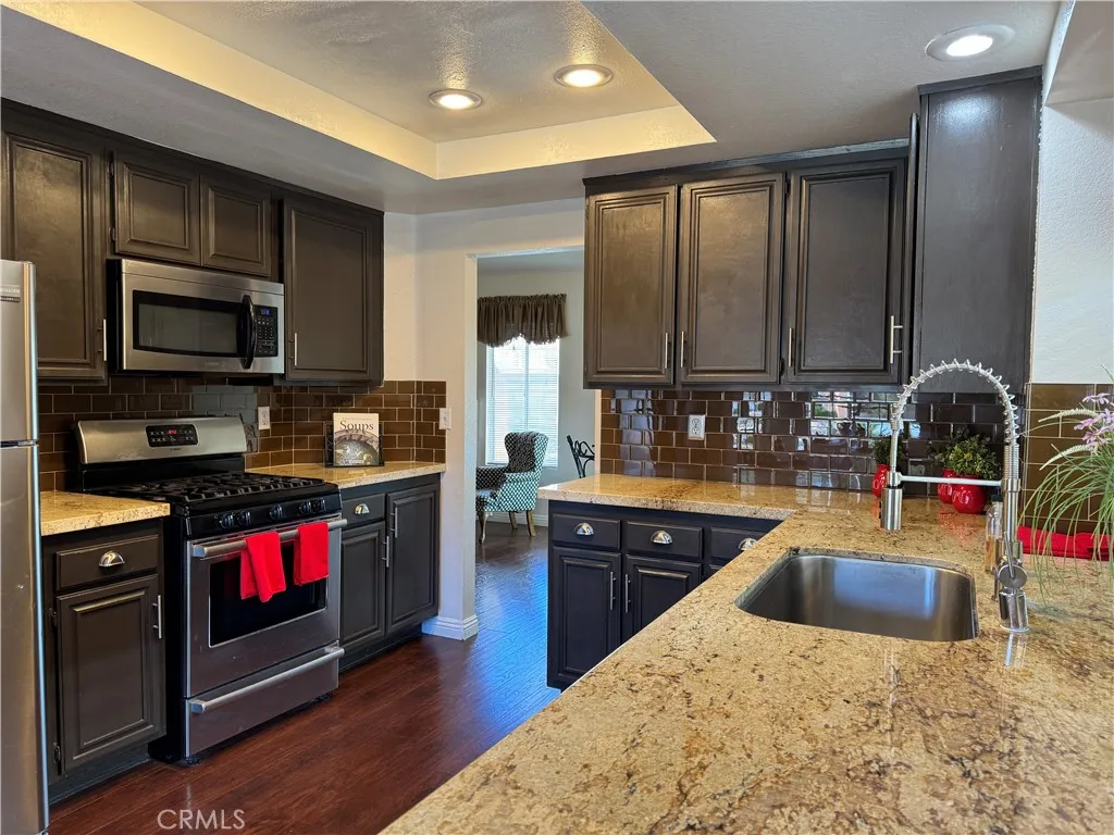 Updated Single-Story in the Heart of Rancho Vista! Nestled near the scenic foothills of West Palmdale, this beautifully maintained single-story home offers comfort, style, and convenience. Ideally located within walking distance to Rancho Vista Elementary School and Hillview Middle School, as well as nearby dining and shopping. Enjoy the highly regarded Rancho Vista Golf Course and restaurant just minutes away. Built in 1991, this home features 3 bedrooms, 2 bathrooms, and approximately 1,346 square feet of living space on a 6,949 square foot lot. The open-concept floor plan showcases impressive vaulted ceilings and an upgraded eat-in kitchen with granite countertops, subway tile backsplash, stainless steel appliances, and dark wood laminate flooring. The inviting living area includes a cozy fireplace and abundant natural light. The spacious primary suite offers bay windows with plantation shutters and French door access, a large walk-in closet, and an ensuite bathroom. Additional highlights include an indoor laundry room, custom interior and exterior paint, and custom wood baseboards. The backyard provides block wall fencing with cross fencing on the side yard, a patio cover for outdoor relaxation, and a large 8 x 12 shed with its own air conditioning unitperfect for a workshop, office, hobby space, or additional storage. The front yard features water-saving xeriscape landscaping for easy maintenance. Dont miss the opportunity to see all this lovely home has to offer and make it your own!
