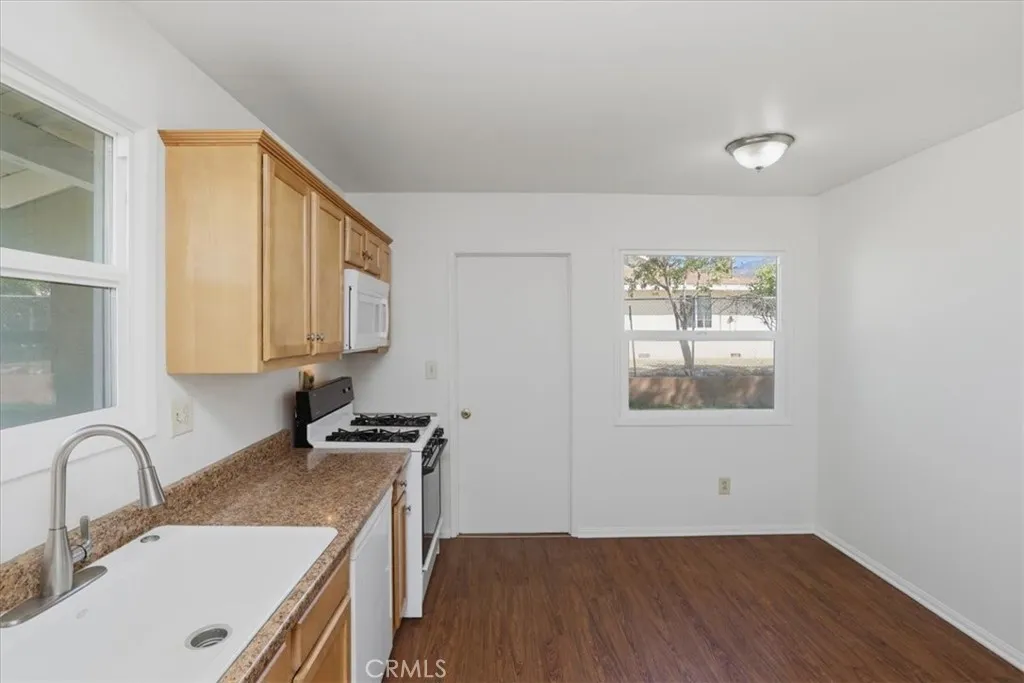 Welcome to this charming single-story ranch home in Highland, offering comfort, simplicity, and great value for first-time buyers. This 3-bedroom, 1.75-bath home offers approximately 1,090 sq ft of living space on a generous 7,200 sq ft lot and is conveniently located near the 210 freeway, providing easy commuter access while still enjoying a quiet neighborhood setting. The home features a bright and inviting living room with large windows and a sliding glass door leading to the backyard, allowing natural light to fill the space while creating an easy indoor-outdoor connection. The kitchen offers maple cabinetry, faux granite Formica countertops, a dishwasher, a microwave, a 4-burner slide-in gas range, and a refrigerator, with an open layout that provides ample space for everyday cooking and dining. Interior features include fresh paint, vinyl dual-pane windows, laminate and carpet flooring, newer paneled interior doors, gas forced-air heating, and a split-system air-conditioning unit for year-round comfort. The primary bedroom includes a built-in vanity and desk area, along with a private shower, while the hall bathroom offers a tub-and-shower combination. Additional amenities include a composition roof, a 2-car garage with a roll-up door and direct access, laundry hookups in the garage with gas and electric, a security screen door, and side yard access. The property is enclosed by wood and chain-link fencing. The backyard features a beautiful, mature jacaranda tree that provides shade and seasonal color, along with plenty of open space for outdoor living, gardening, or f