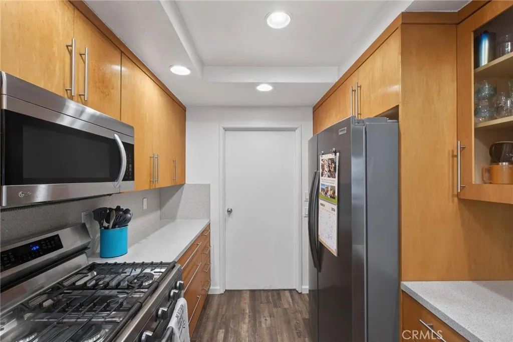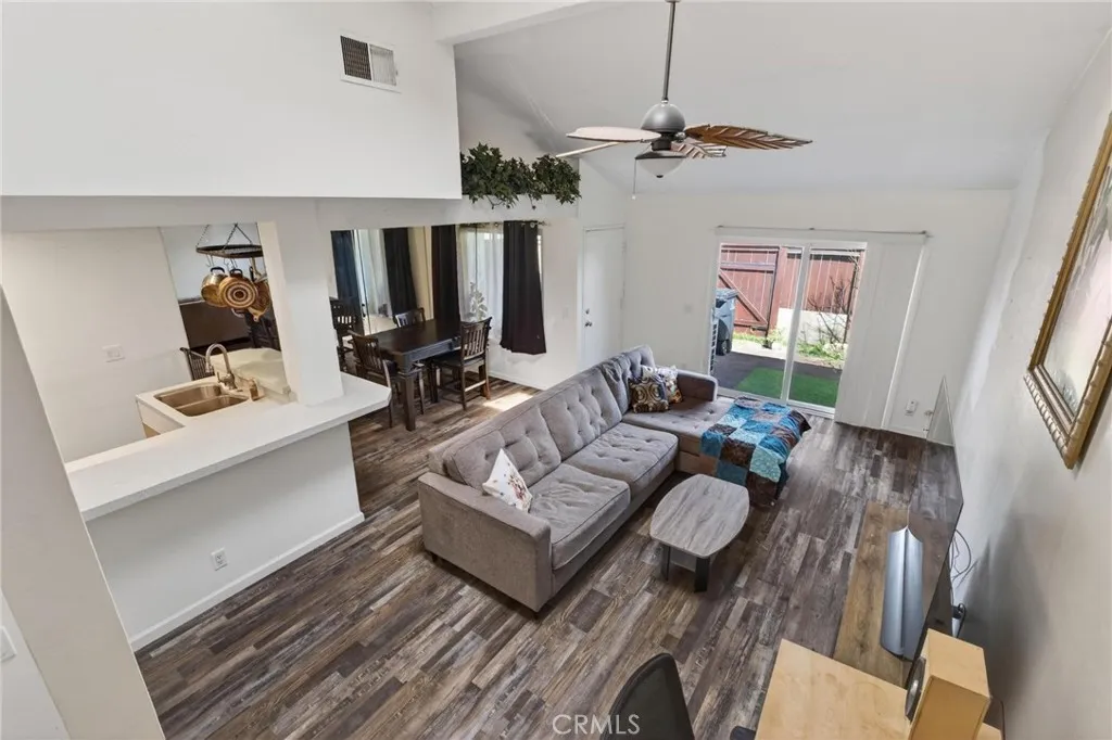 This move-in ready 3-bedroom, 2-bath home offers a bright, open layout with thoughtful updates throughout. The main level features a spacious living room with high ceilings that opens to a private outdoor patio, along with a remodeled kitchen with quartz countertops, stainless steel appliances, breakfast bar, and adjacent dining area. Waterproof luxury vinyl plank flooring runs through the main living spaces, and the home is equipped with ceiling fans and air conditioning for year-round comfort. The lower level also includes a remodeled three-quarter bath and direct access to a private two-car garage. Upstairs are three well-sized bedrooms and a remodeled full bathroom. The community features a large pool with nearby restrooms and outdoor shower, as well as a spacious lawn area.