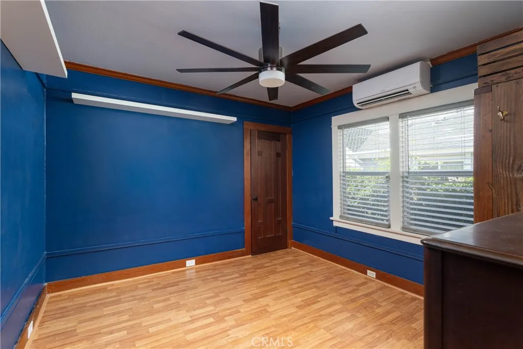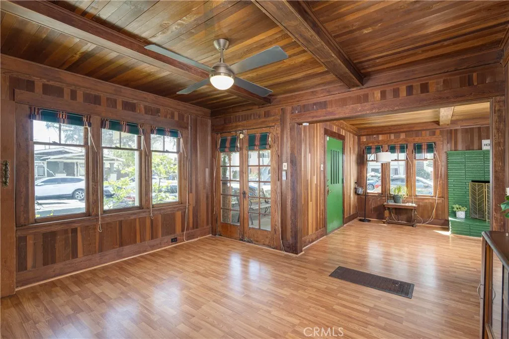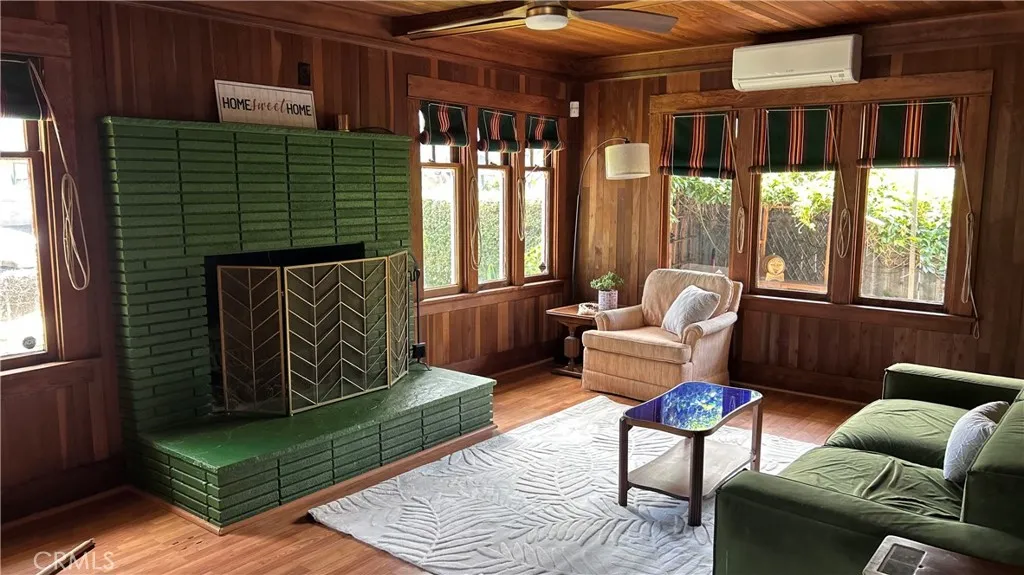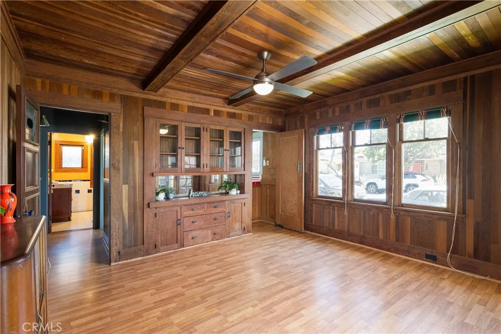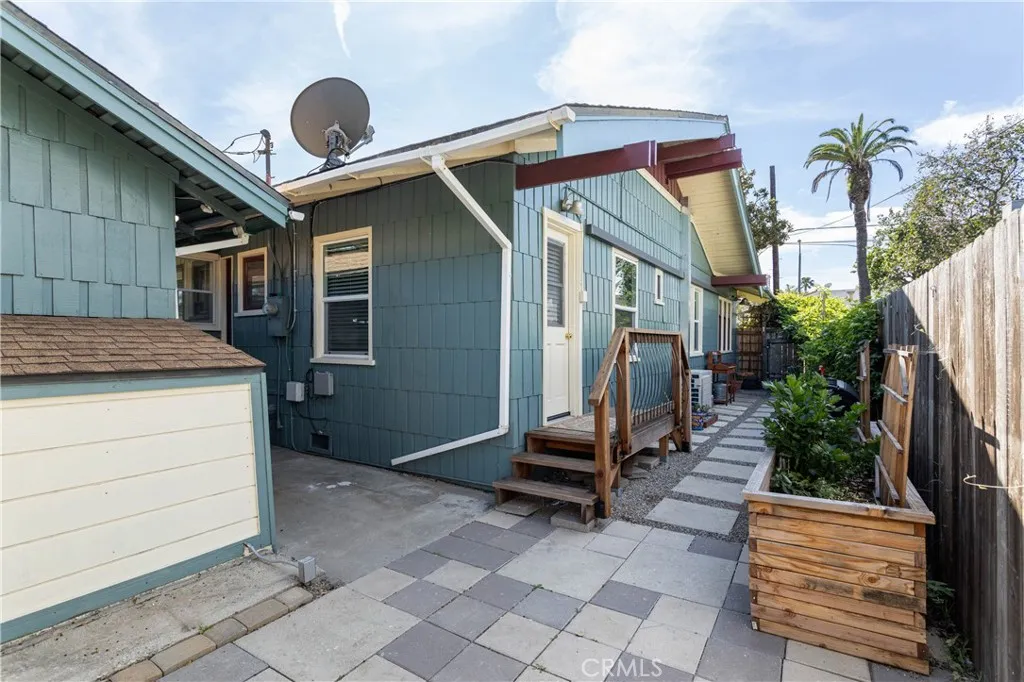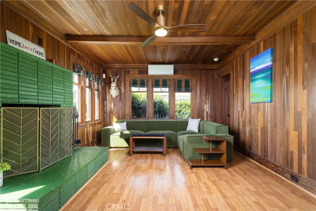 One of a Kind! Wood shingled Craftsman Bungalow located on a corner lot in the historic district of Rose Park South. This bungalow is a few blocks to Retro Row restaurants and shops, and a 10 minute walk to the beach. A large fenced front yard with grass, flowering vines, roses, and fig and citrus trees welcome you as you walk up to the house. Fun fact: several cacti and succulents came from Leonardo DiCaprios property! There is a large front porch with the original oak front door to the living room, and French doors to the dining room. The open living room and dining room feature natural wood paneling on the walls and ceilings. There is a wood burning fireplace, custom Roman blinds, and ceiling fans. The dining room features the original buffet cabinetry, and a custom swinging door with stained glass to the hallway. There is an abundance of natural light from the original wood framed windows. The kitchen has vintage wood cabinetry, and tile countertops. There is an abundance of storage space in the kitchen, and a hidden small dishwasher in cabinetry by the sink. The laundry room is adjacent, with a rolling cabinet/butcher block. Washer and dryer stay. There is a screened back porch/catio as well. There are 2 bedrooms total, with a larger closet in the hall between them. The first bedroom has a door to the living room. The 2nd bedroom features a custom desk area, closet cabinetry and a bookcase, along with a door to the backyard. There is a 3/4 bathroom with custom stained glass windows, custom lighting, tiled shower and a custom vanity. The house also has a split HVAC syst