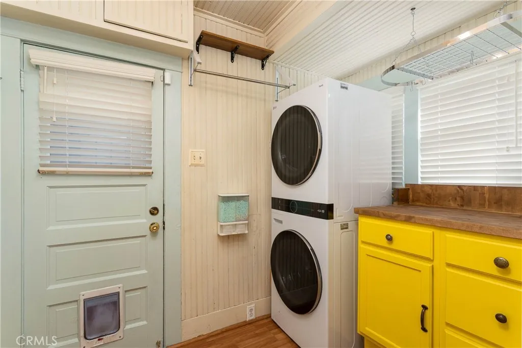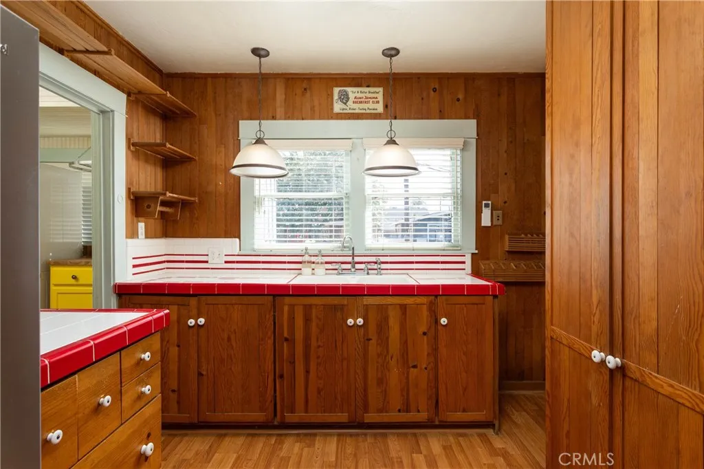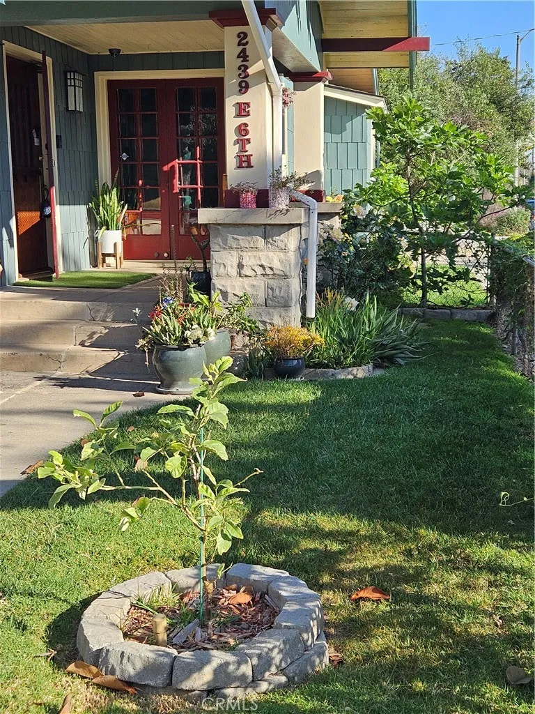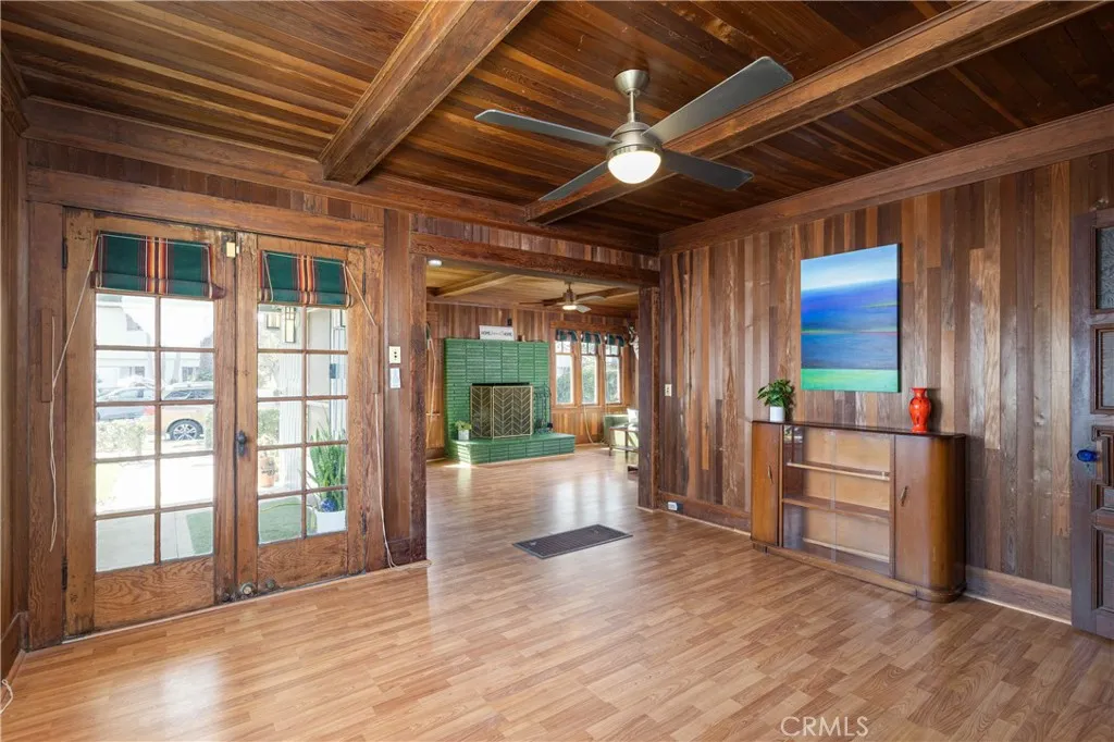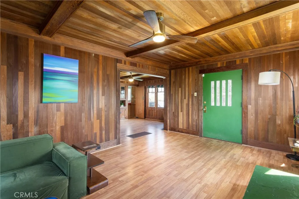 One of a Kind! Wood shingled Craftsman Bungalow located on a corner lot in the historic district of Rose Park South. This bungalow is a few blocks to Retro Row restaurants and shops, and a 10 minute walk to the beach. A large fenced front yard with grass, flowering vines, roses, and fig and citrus trees welcome you as you walk up to the house. Fun fact: several cacti and succulents came from Leonardo DiCaprios property! There is a large front porch with the original oak front door to the living room, and French doors to the dining room. The open living room and dining room feature natural wood paneling on the walls and ceilings. There is a wood burning fireplace, custom Roman blinds, and ceiling fans. The dining room features the original buffet cabinetry, and a custom swinging door with stained glass to the hallway. There is an abundance of natural light from the original wood framed windows. The kitchen has vintage wood cabinetry, and tile countertops. There is an abundance of storage space in the kitchen, and a hidden small dishwasher in cabinetry by the sink. The laundry room is adjacent, with a rolling cabinet/butcher block. Washer and dryer stay. There is a screened back porch/catio as well. There are 2 bedrooms total, with a larger closet in the hall between them. The first bedroom has a door to the living room. The 2nd bedroom features a custom desk area, closet cabinetry and a bookcase, along with a door to the backyard. There is a 3/4 bathroom with custom stained glass windows, custom lighting, tiled shower and a custom vanity. The house also has a split HVAC syst