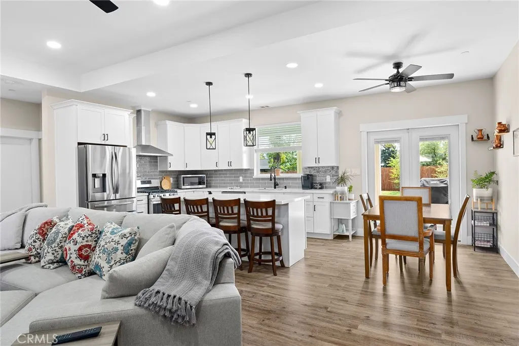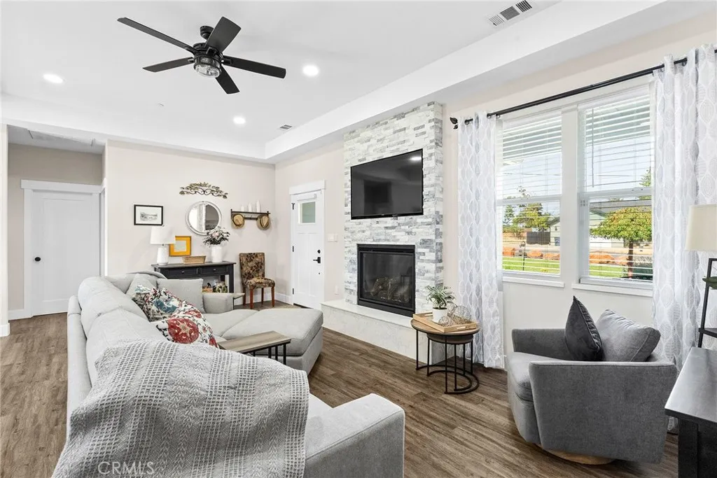 MOVE-IN READY never looked so good! Owned solar, fully landscaped front/back yard and RV parking are just a few of the thoughtful upgrades that make this home as efficient as it is comfortableperfect as you head into the beautiful summer months. Built in 2021 and truly better than new, this property offers completed front and backyard landscaping, including mature citrus trees with Meyer lemon and Mexican lime, full perimeter fencing, and generous gated RV parking. Step inside and immediately feel at home in the spacious open-concept layout. The inviting living area is anchored by a stunning floor-to-ceiling slate hearth fireplace, while the expansive kitchen island creates the perfect gathering space for entertaining and everyday living. The kitchen is beautifully finished with stainless steel appliances, quartz countertops, soft-close cabinetry, and a sink positioned to take in a picture-perfect view of the lush backyard. The dining area opens through French doors to a large, covered patio, creating a seamless indoor-outdoor flow thats ideal for year-round BBQs and relaxing evenings. Designed with a popular split-bedroom floor plan, the home offers both comfort and privacy. The spacious primary suite features a large walk-in closet with built-in storage, a luxurious soaking tub, a step-in tile shower, dual vanities and private access to the expansive covered back patio. Two additional bedrooms and a full bath provide flexibility for guests or family, each with oversized closets and abundant natural light, while the rear bedroom offers its own patio accessperfect for a pot
