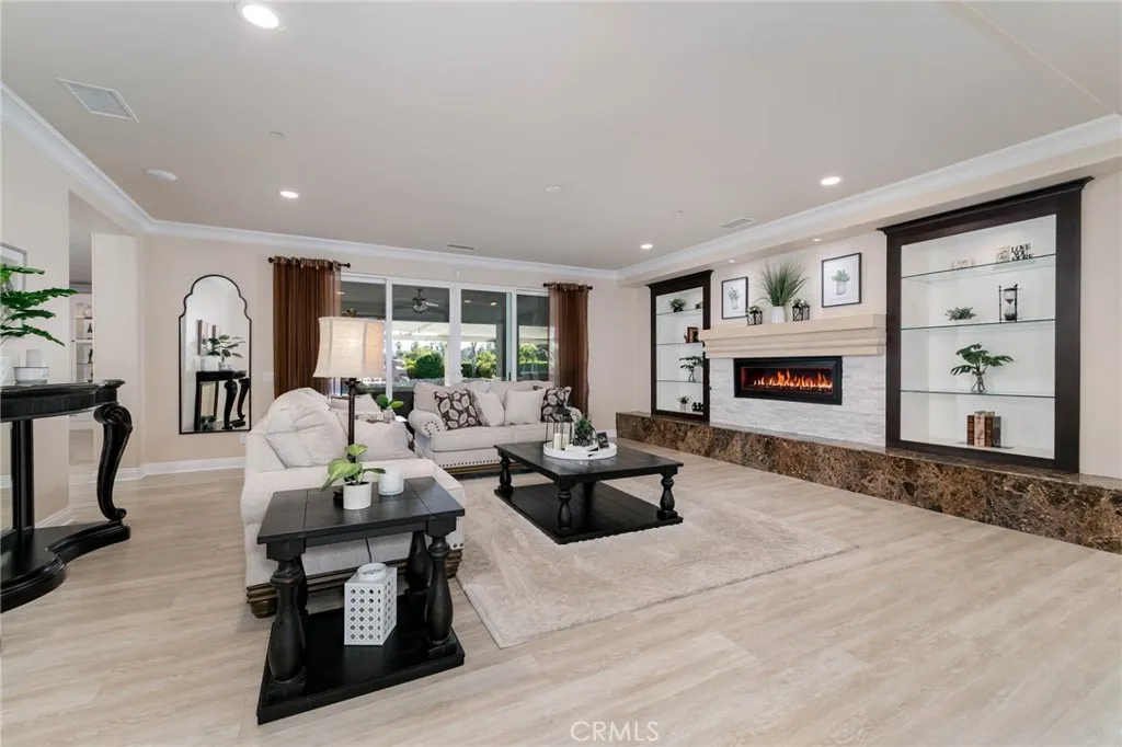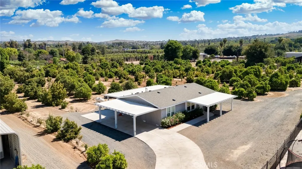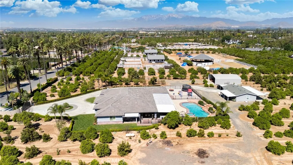 Two visionary dreams came to fruition in 2016. The first being that the owner wanted to purchase this private property. The second was to build a grand estate on this property for his family. This labor of love is nestled in the serene, sought after neighborhood of Arlington Heights in Riverside County. This expansive single story, 4500 square foot beauty sits proudly on 5 acres of land. Land that is shared with over 500 thriving naval orange and avocado trees! As you arrive you will be greeted by a long- gated driveway that leads to the main entrance. Large wrought iron double doors invite you in. Inside, high ceilings, luxury vinyl plank flooring and natural light create an open, airy atmosphere throughout. The expansive great room serves as the heart of the home; the living room boasts entertaining space with fireplace and the formal dining area is perfect for gatherings. Your eyes will travel to the impressive chef's kitchen that is fully equipped with top tier Viking and Subzero appliances. There is custom cabinetry, walk in pantry and large windows that provide endless views of the orange grove and grounds. The home offers 4 generously sized bedrooms, each with its own private full bathrooms providing ultimate comfort and privacy. There is an office with custom cabinetry and glass double doors. Additional conveniences include dedicated laundry room, multiple storage closets and a half bathroom thoughtfully located in the attached 4 car garage-perfect for pool parties, outdoor gatherings and guests. Sliding doors open to your private 5-acre paradise and your nose is ti